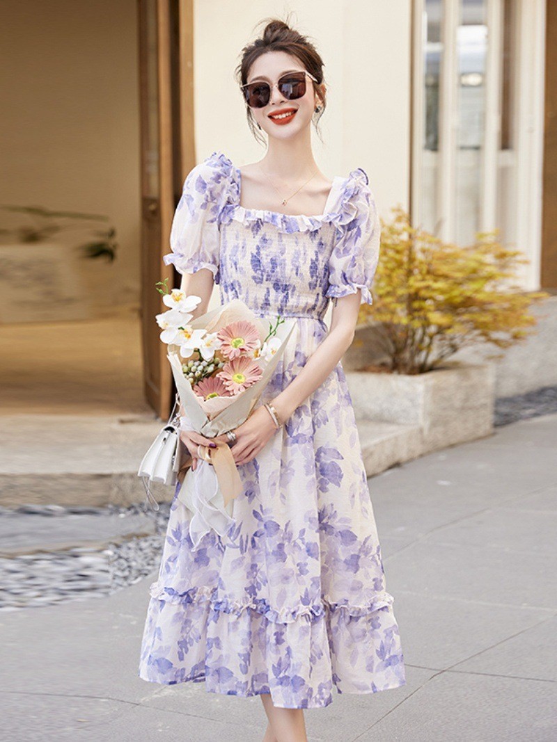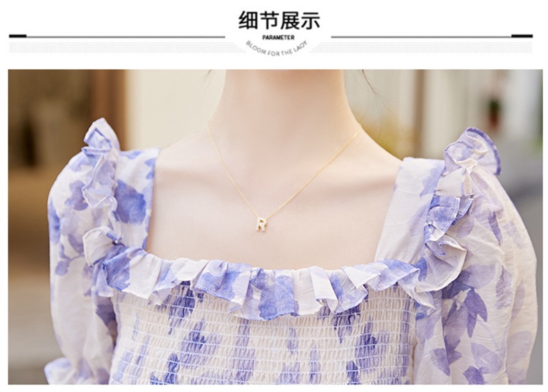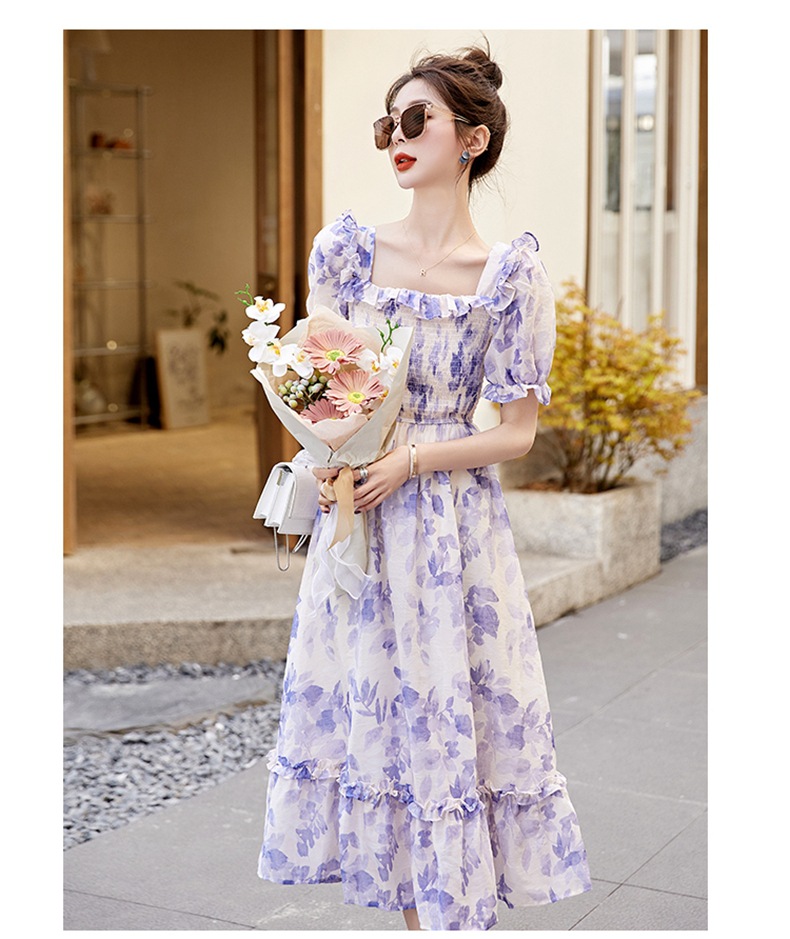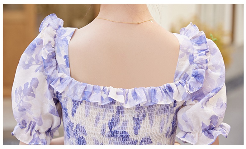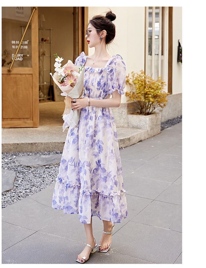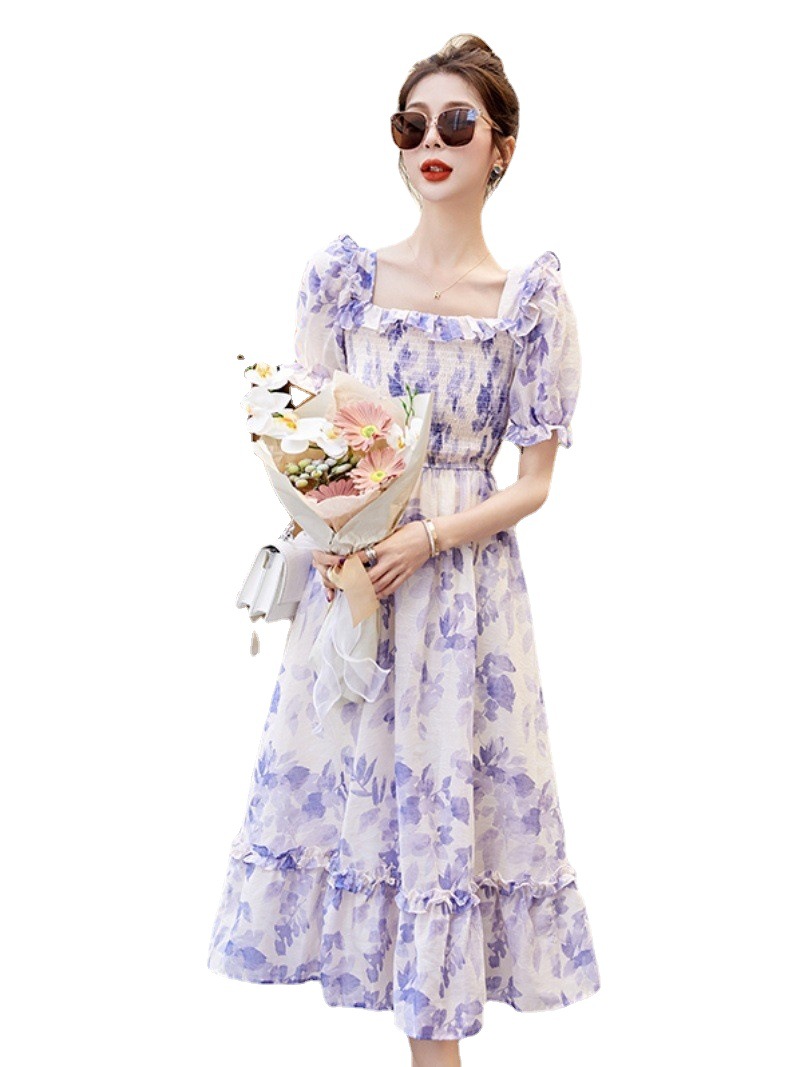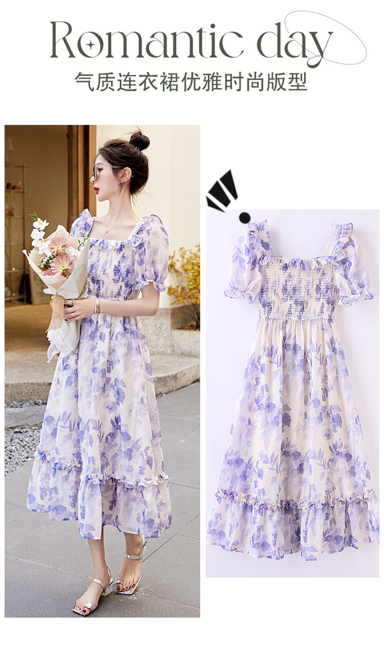 水墨雪纺碎花泡泡袖连衣裙女中长款夏2023新款法式很仙过膝字长裙