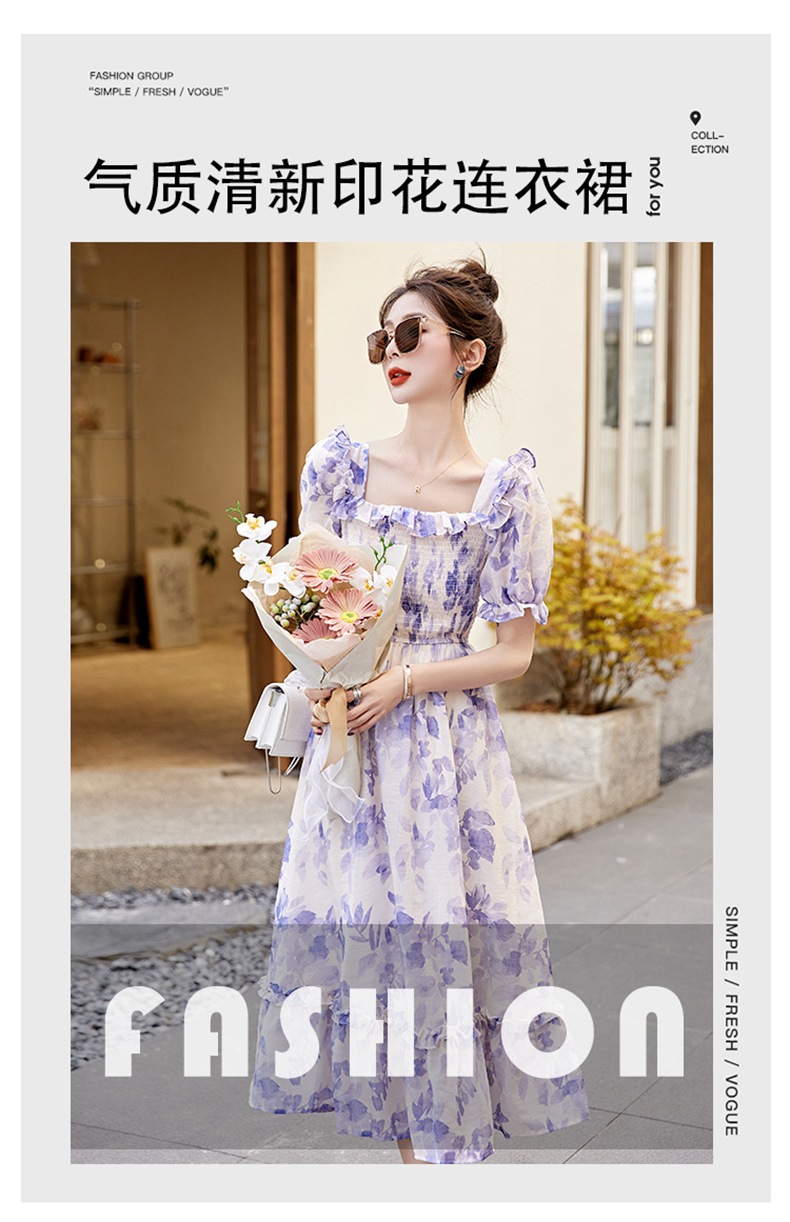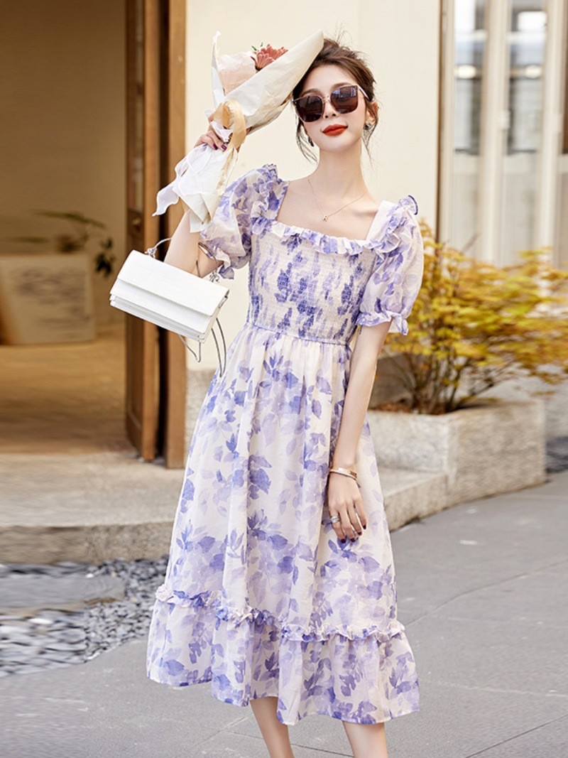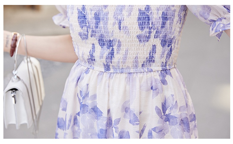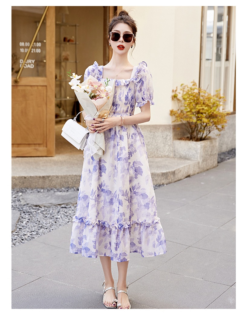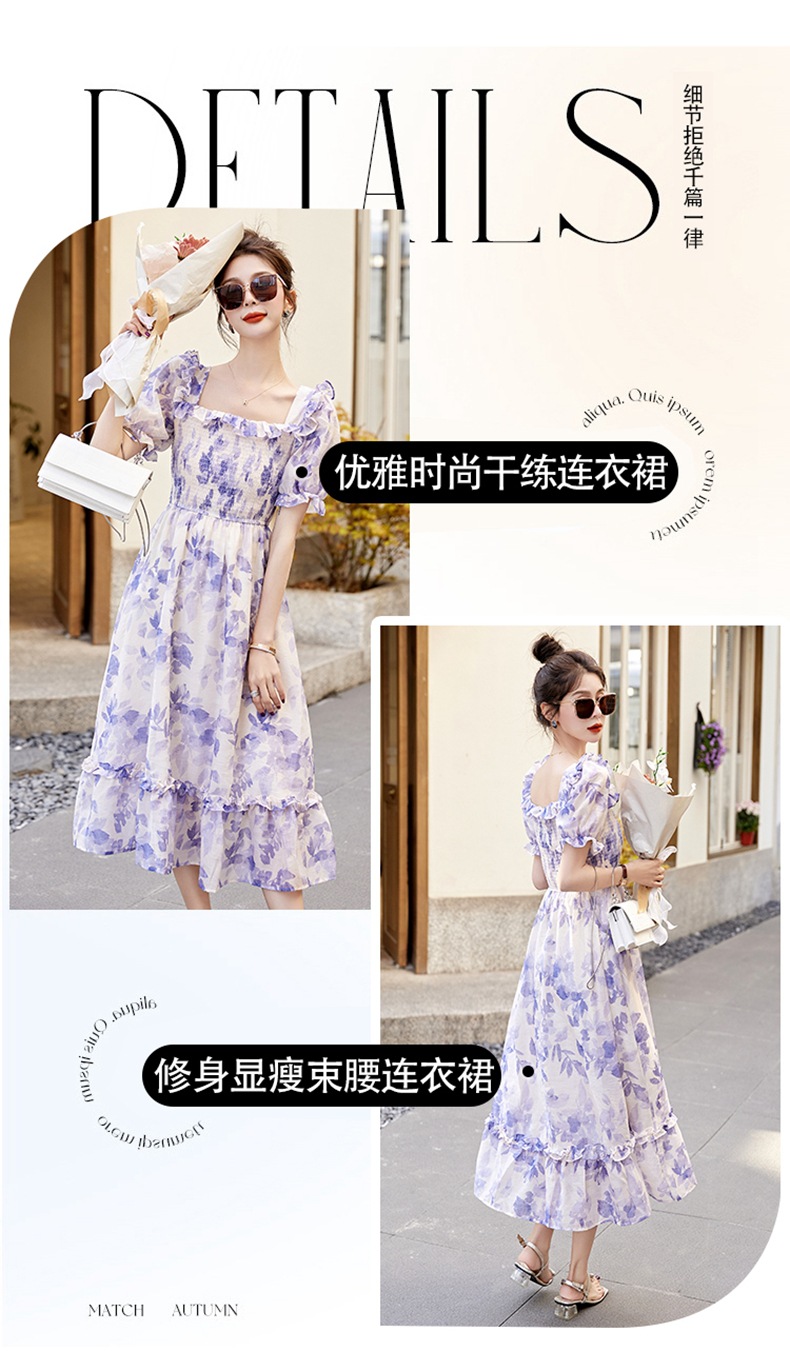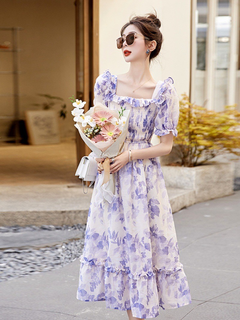 水墨雪纺碎花泡泡袖连衣裙女中长款夏2023新款法式很仙过膝字长裙