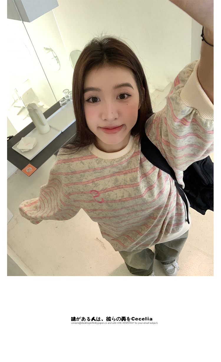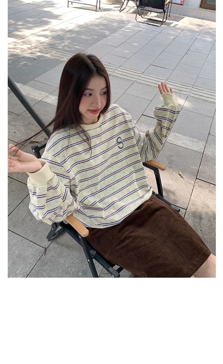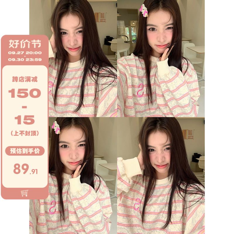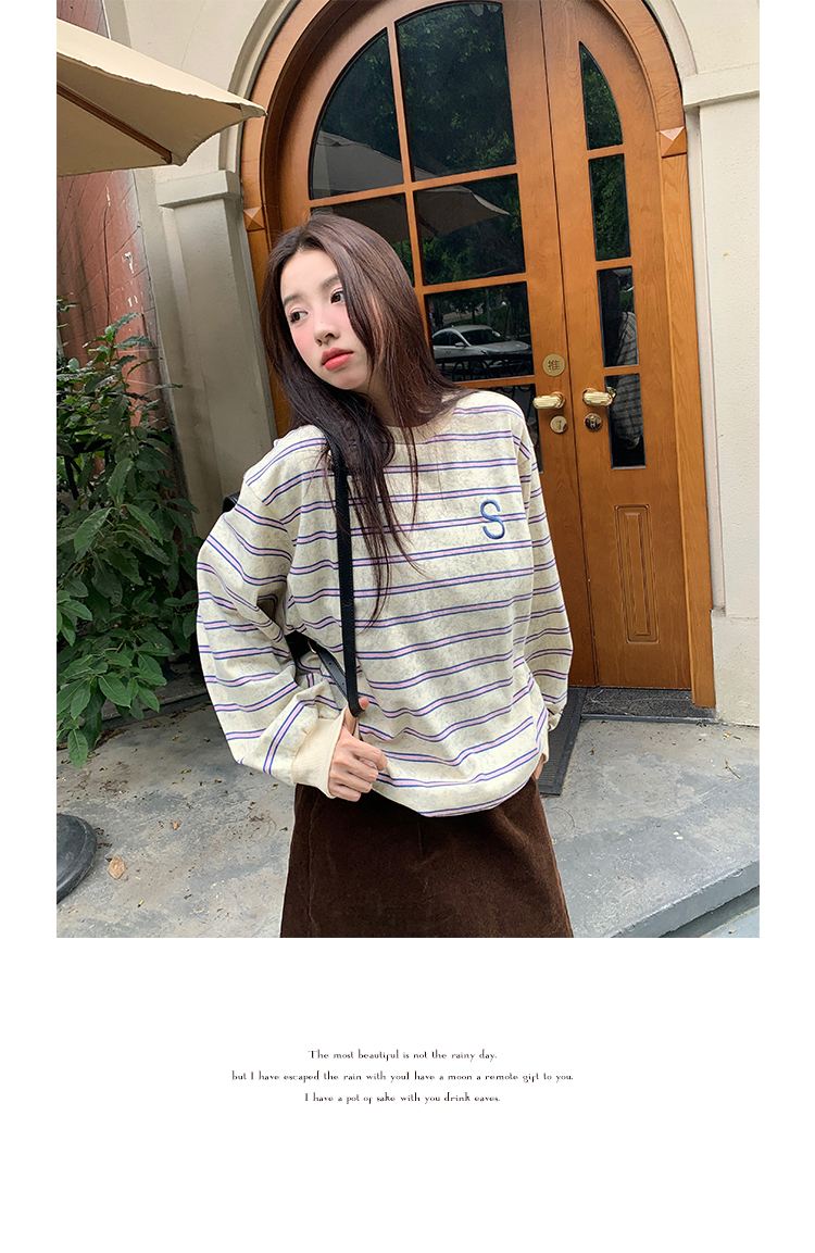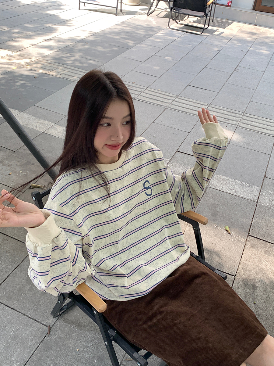 馨幫幫自制長袖上衣設計感2023早秋新款慵懶風復古寬鬆條紋休閒上衣女