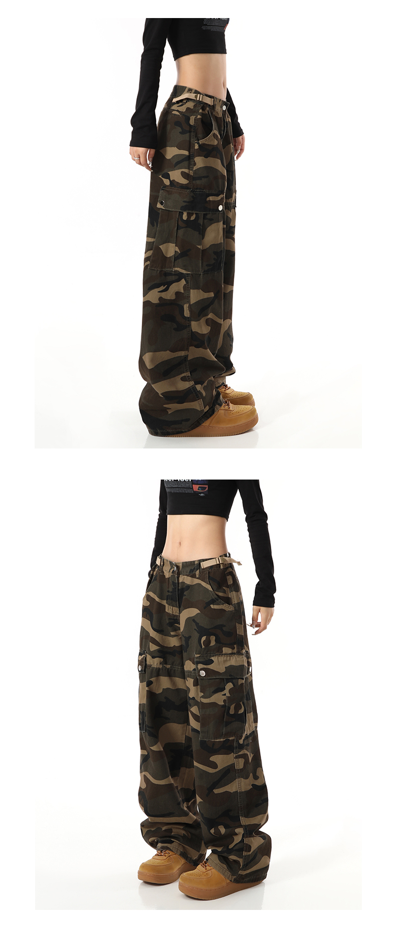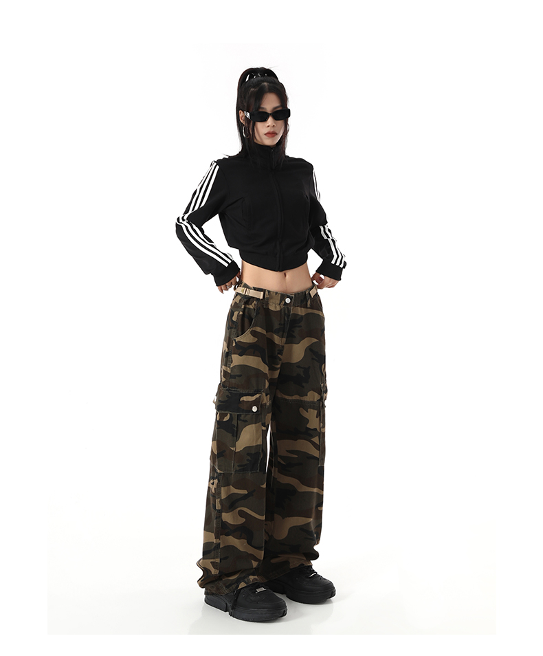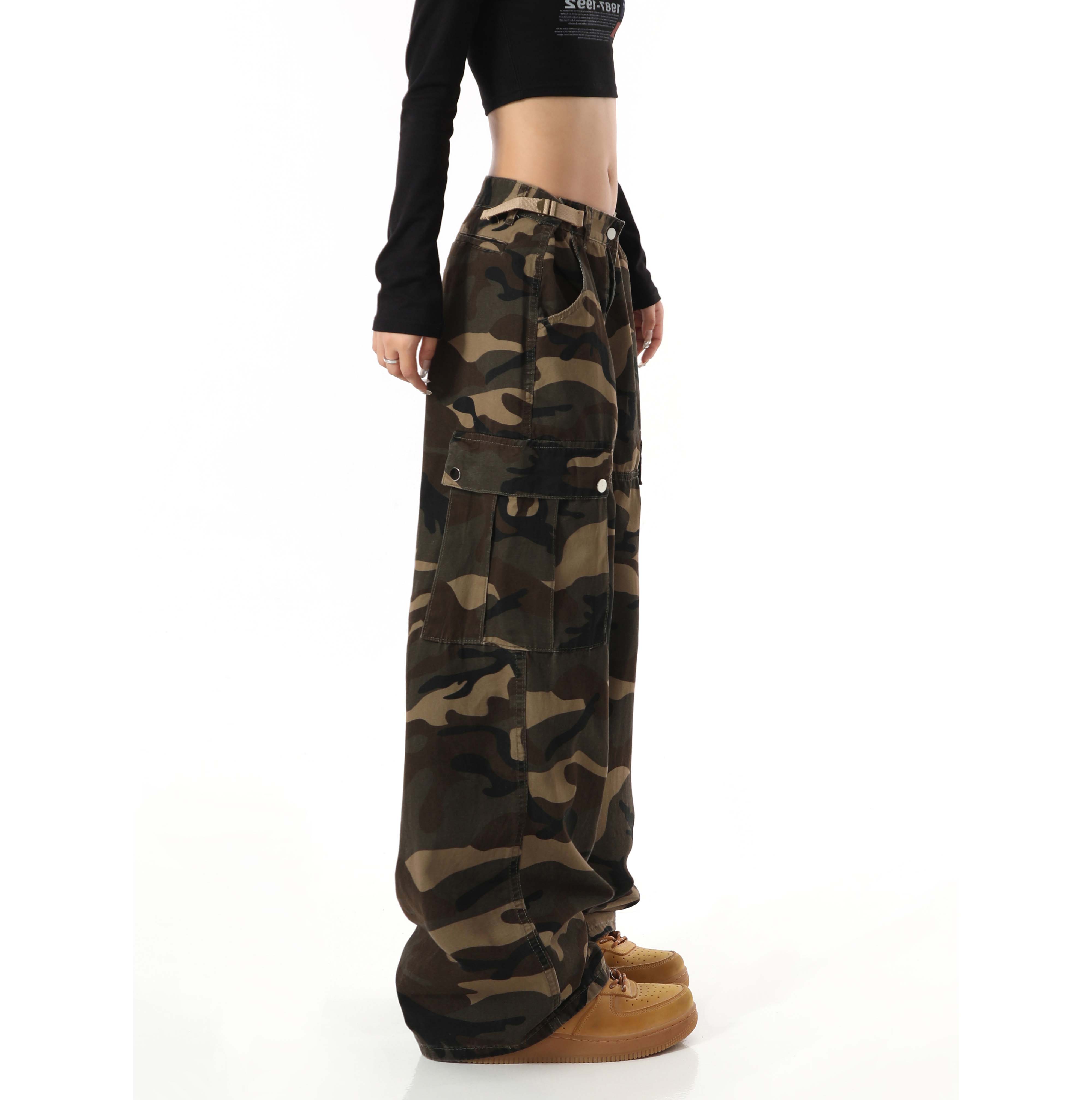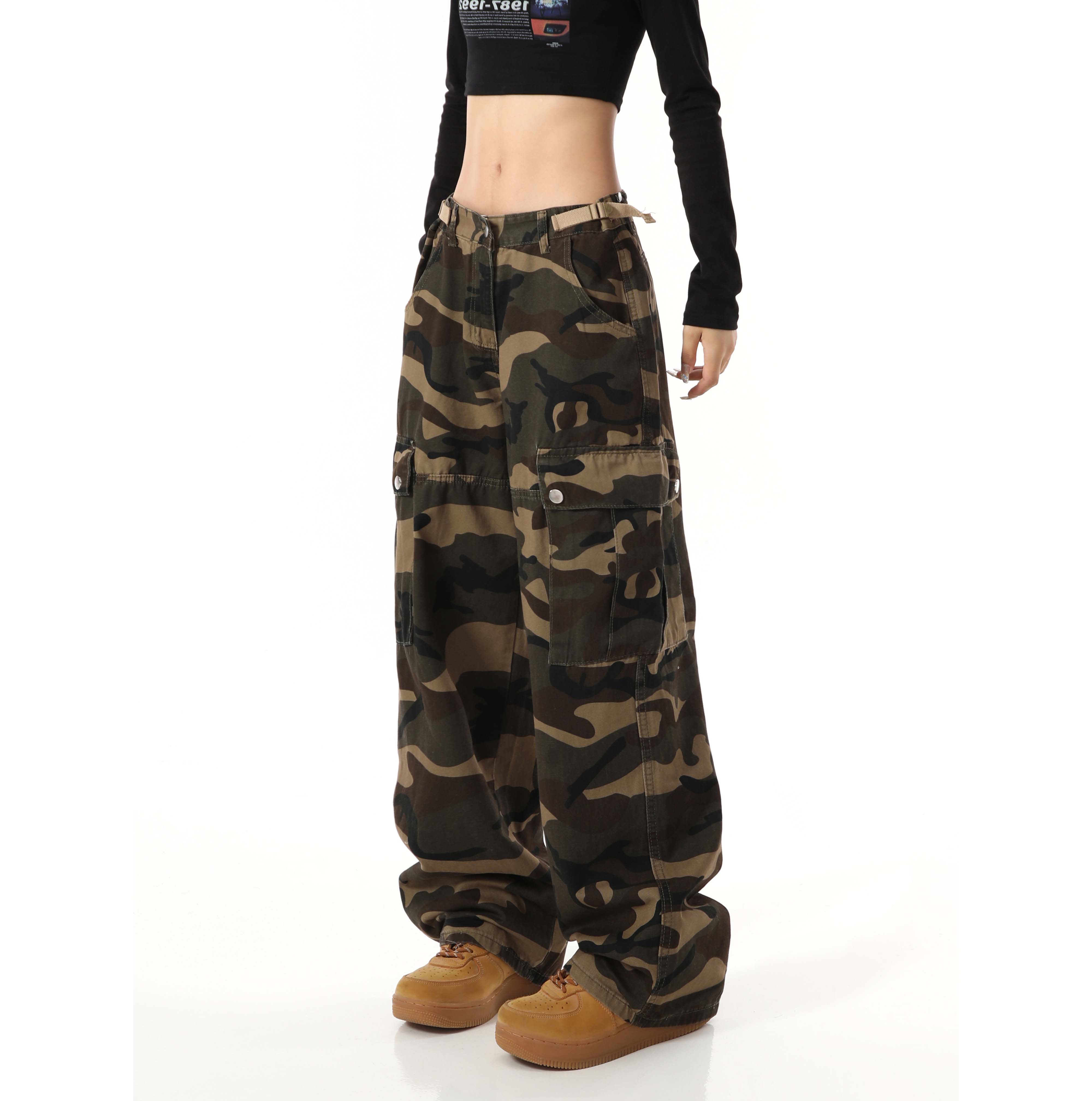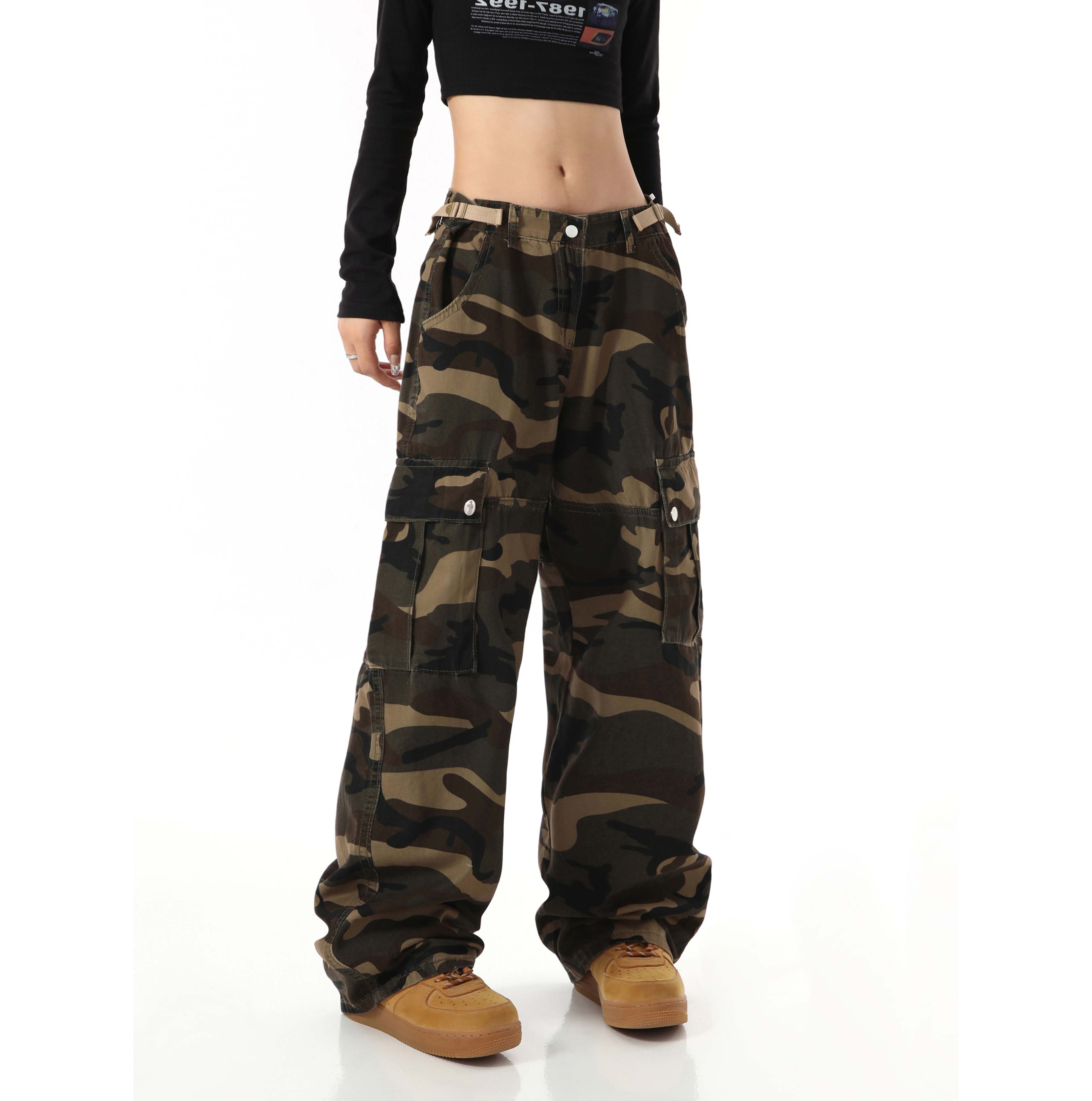 歐美復古迷彩高街寬鬆直筒大口袋潮牌百搭工裝褲男女高腰顯瘦褲子