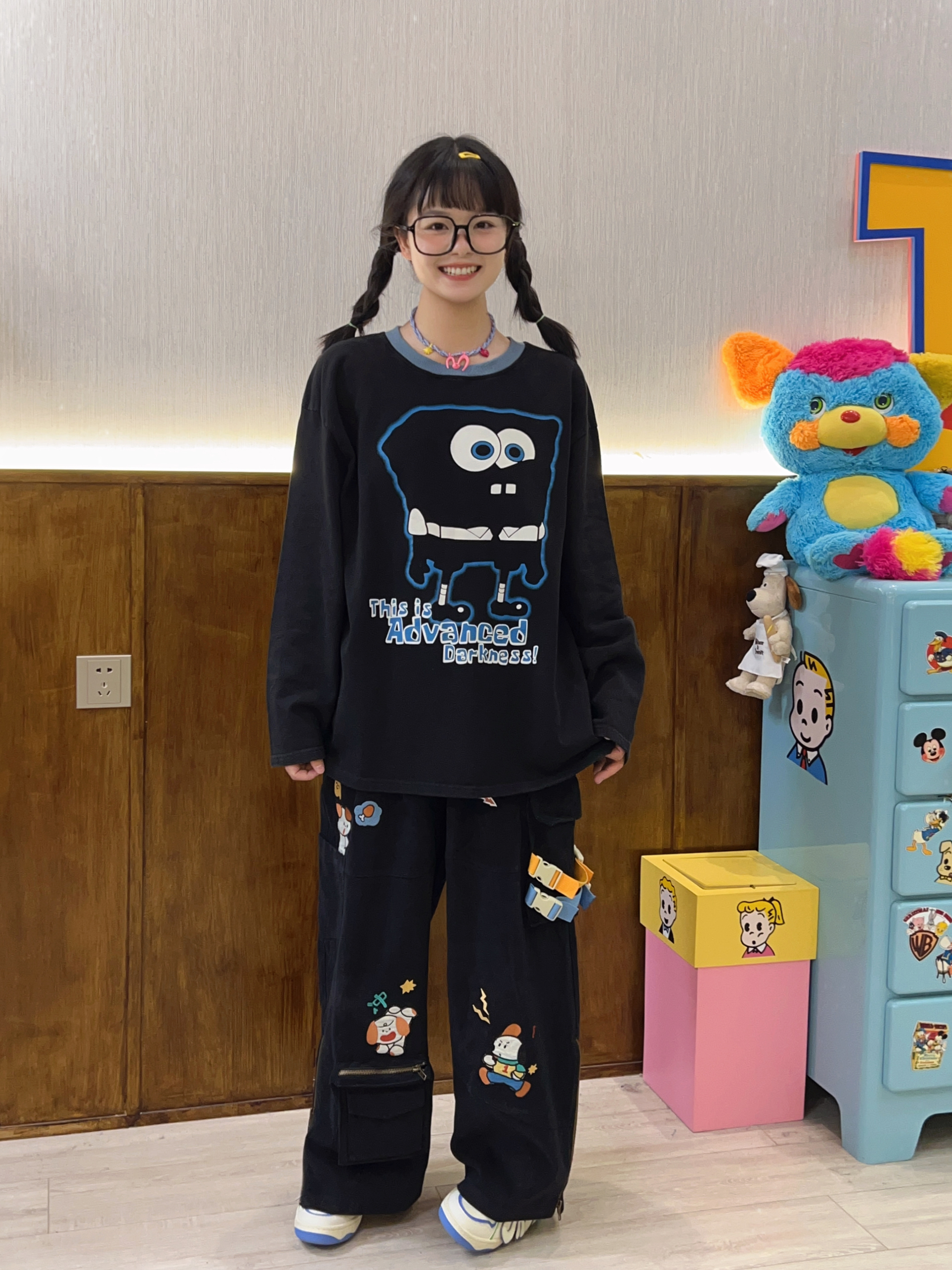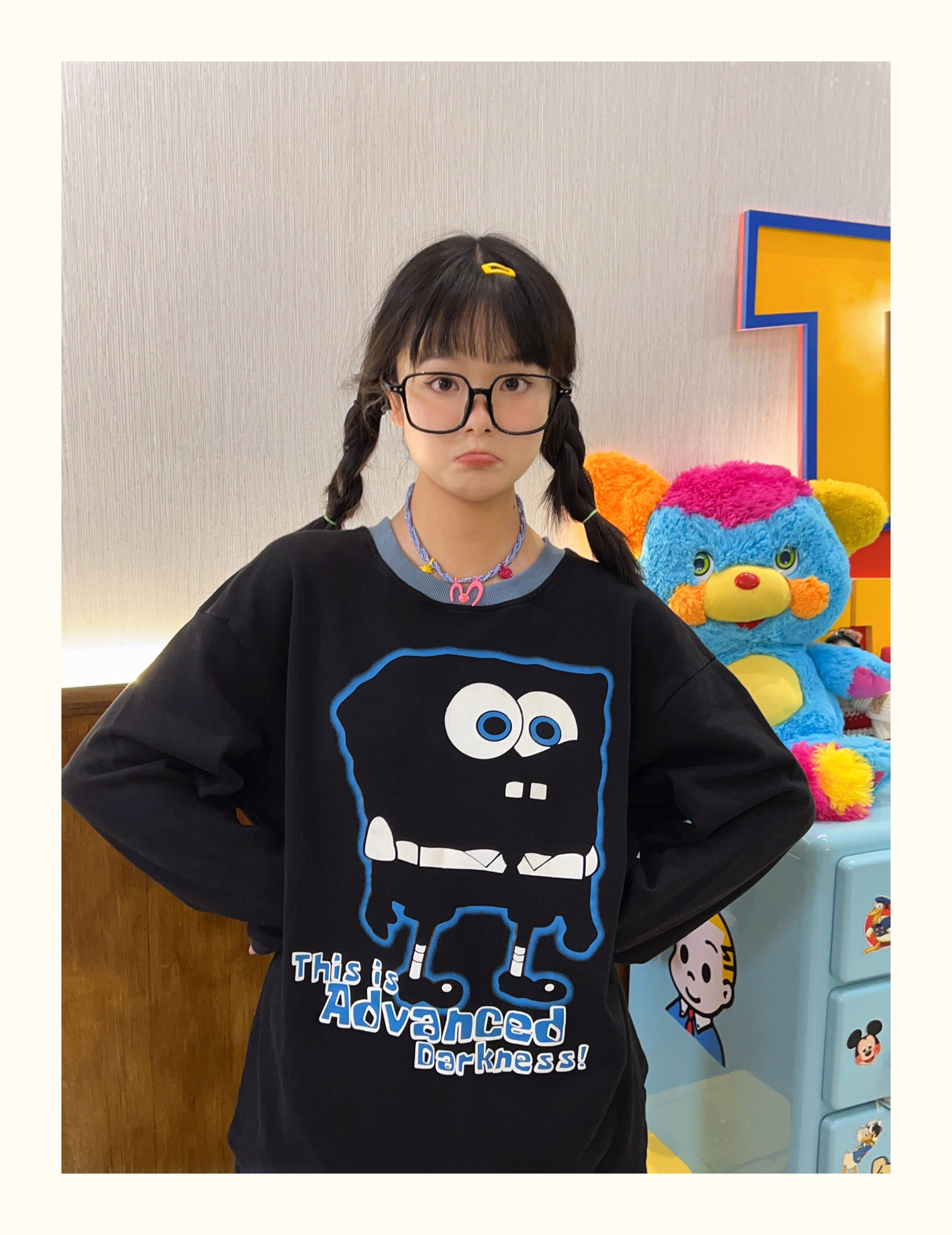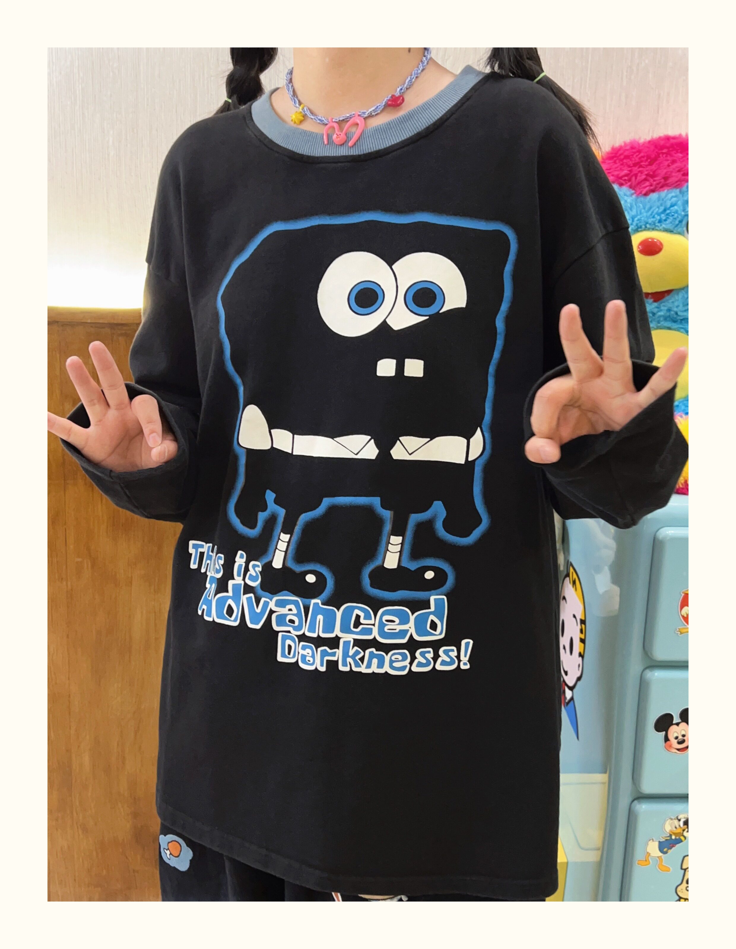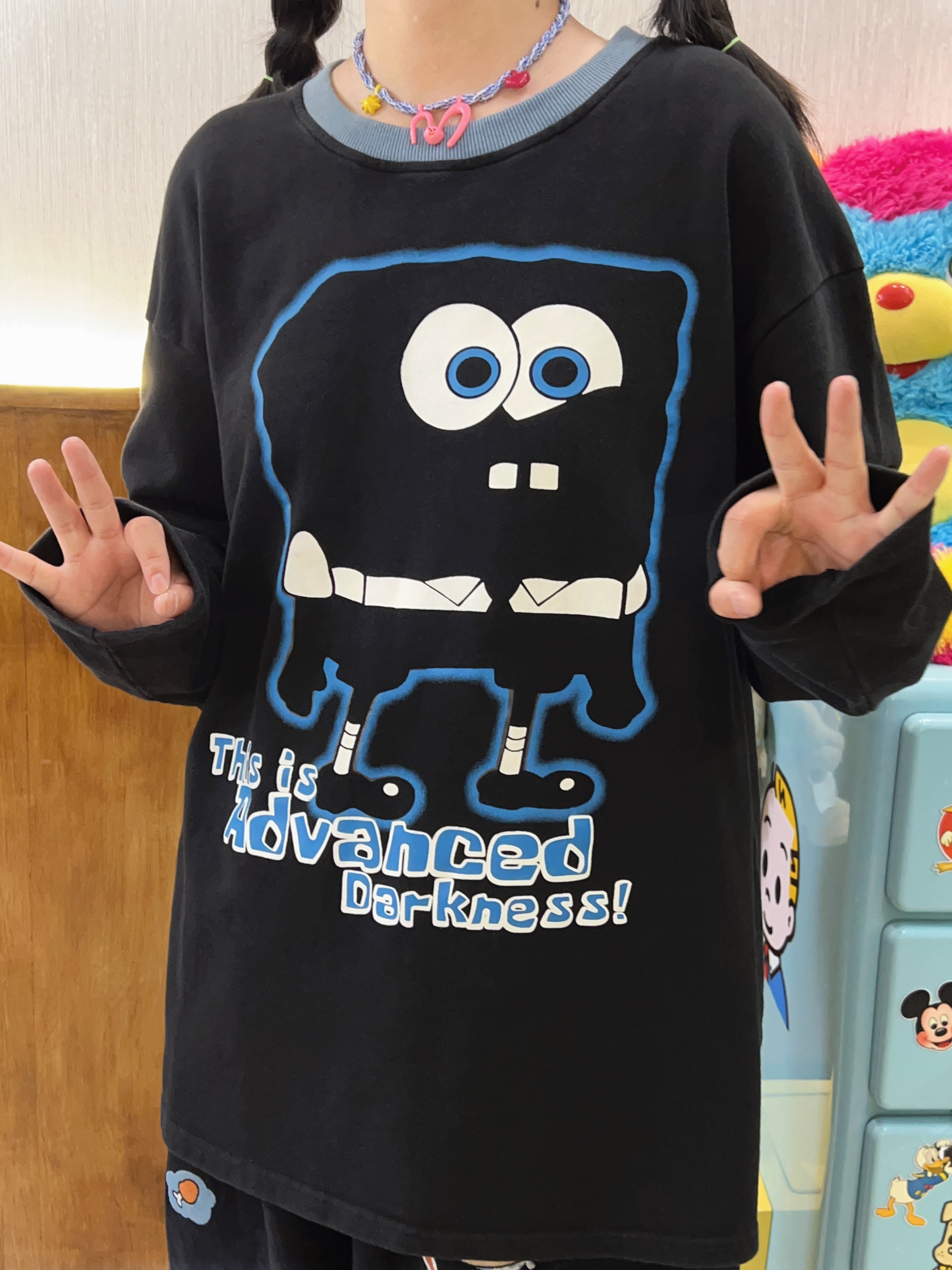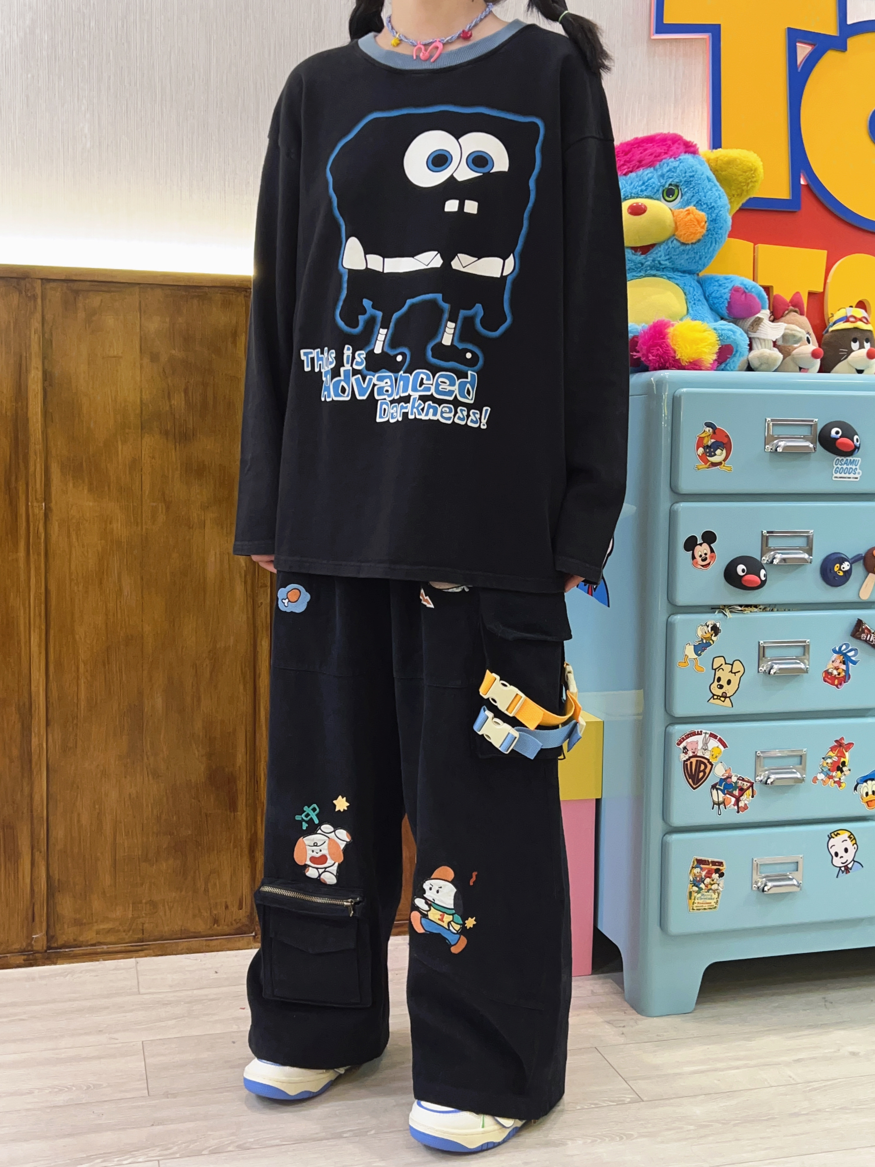 Robootoo童趣古著美式卡通印花減齡甜酷黑色全棉圓領厚棉T2023年秋