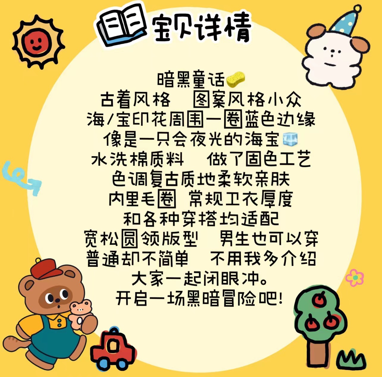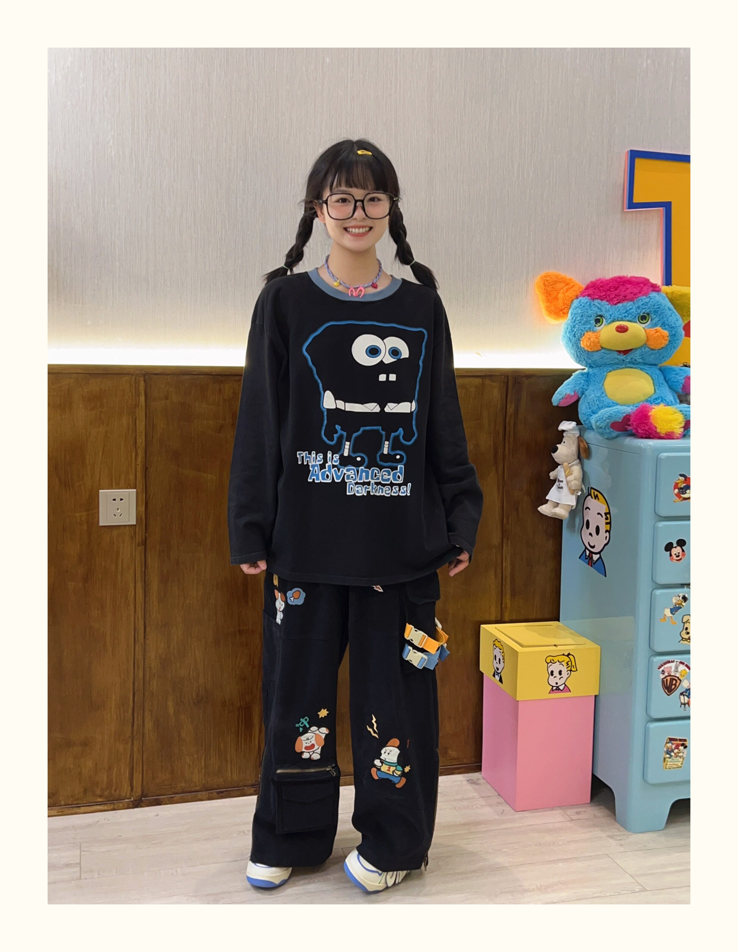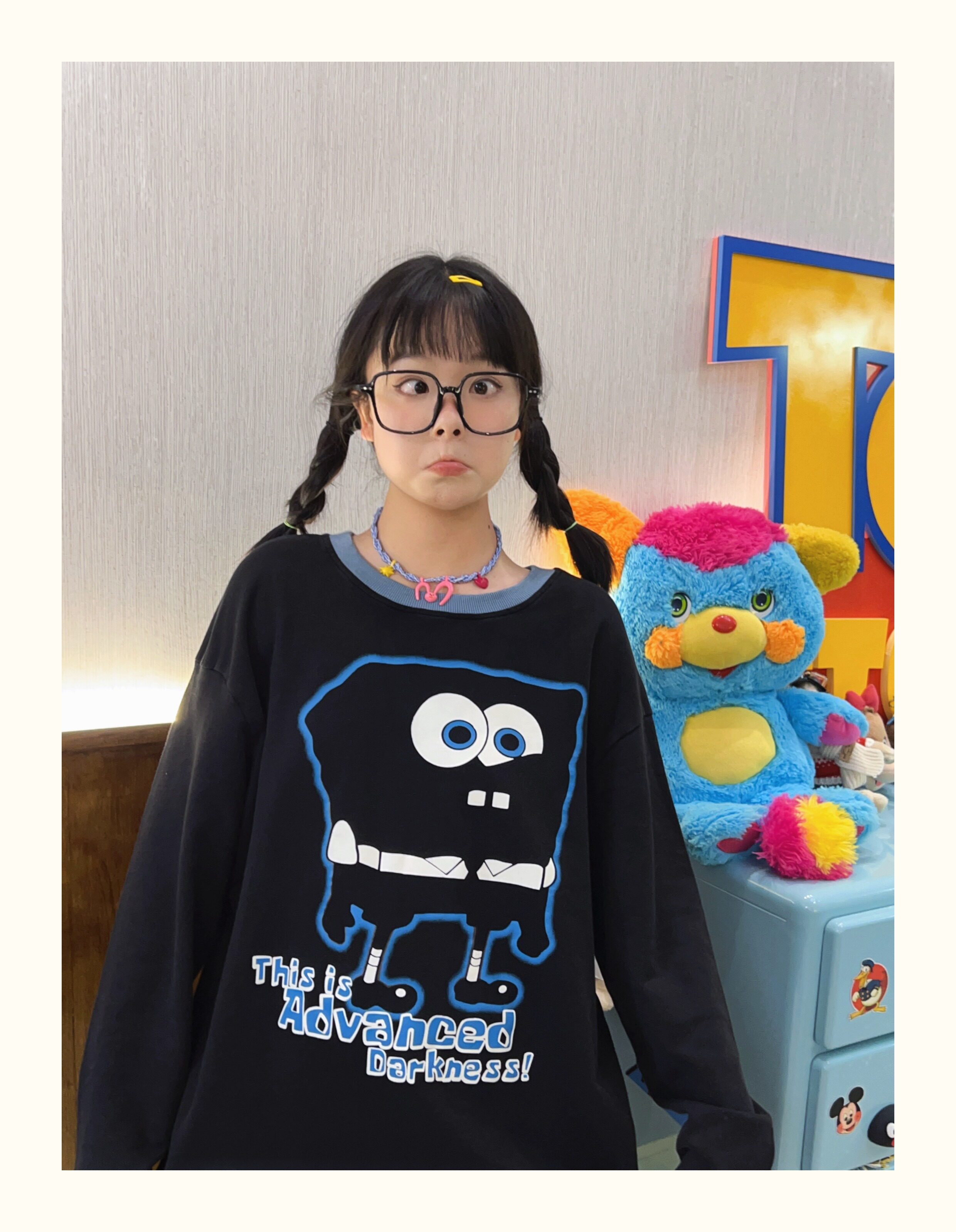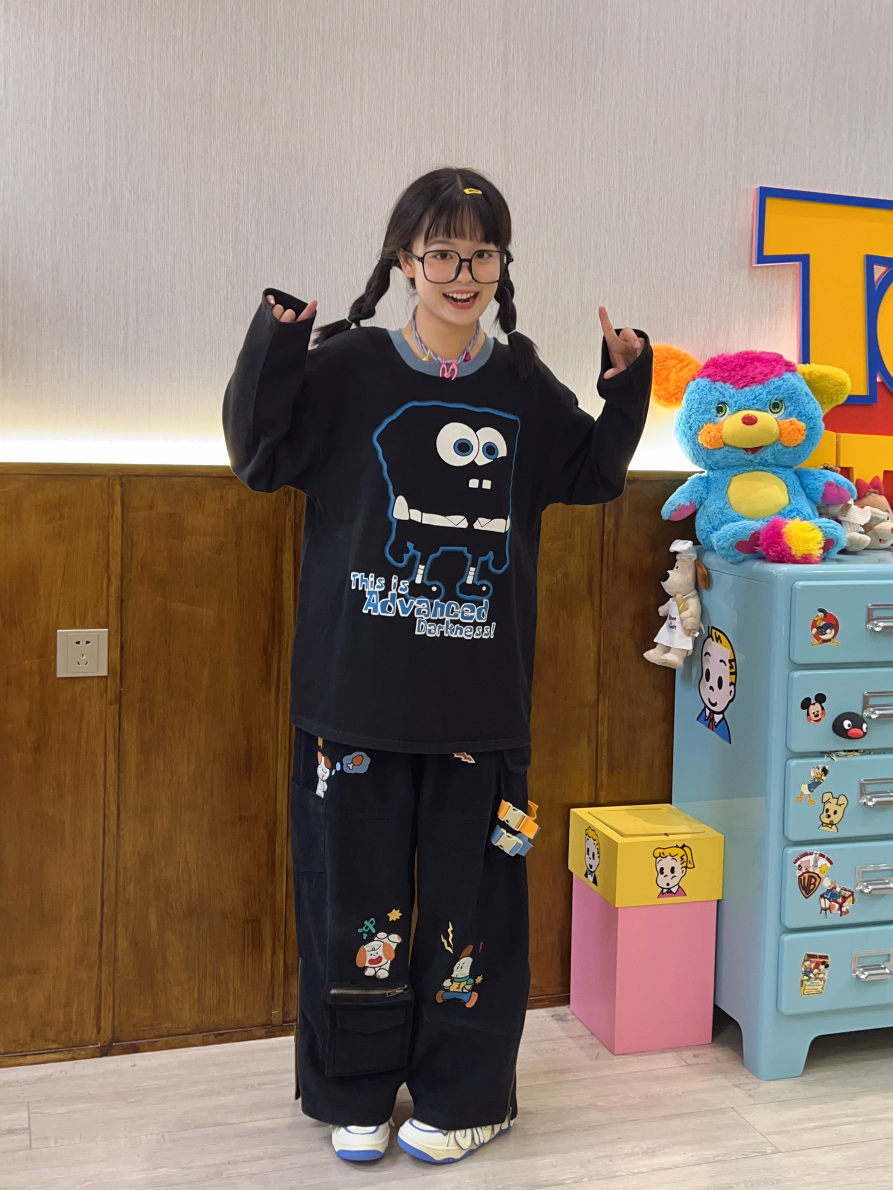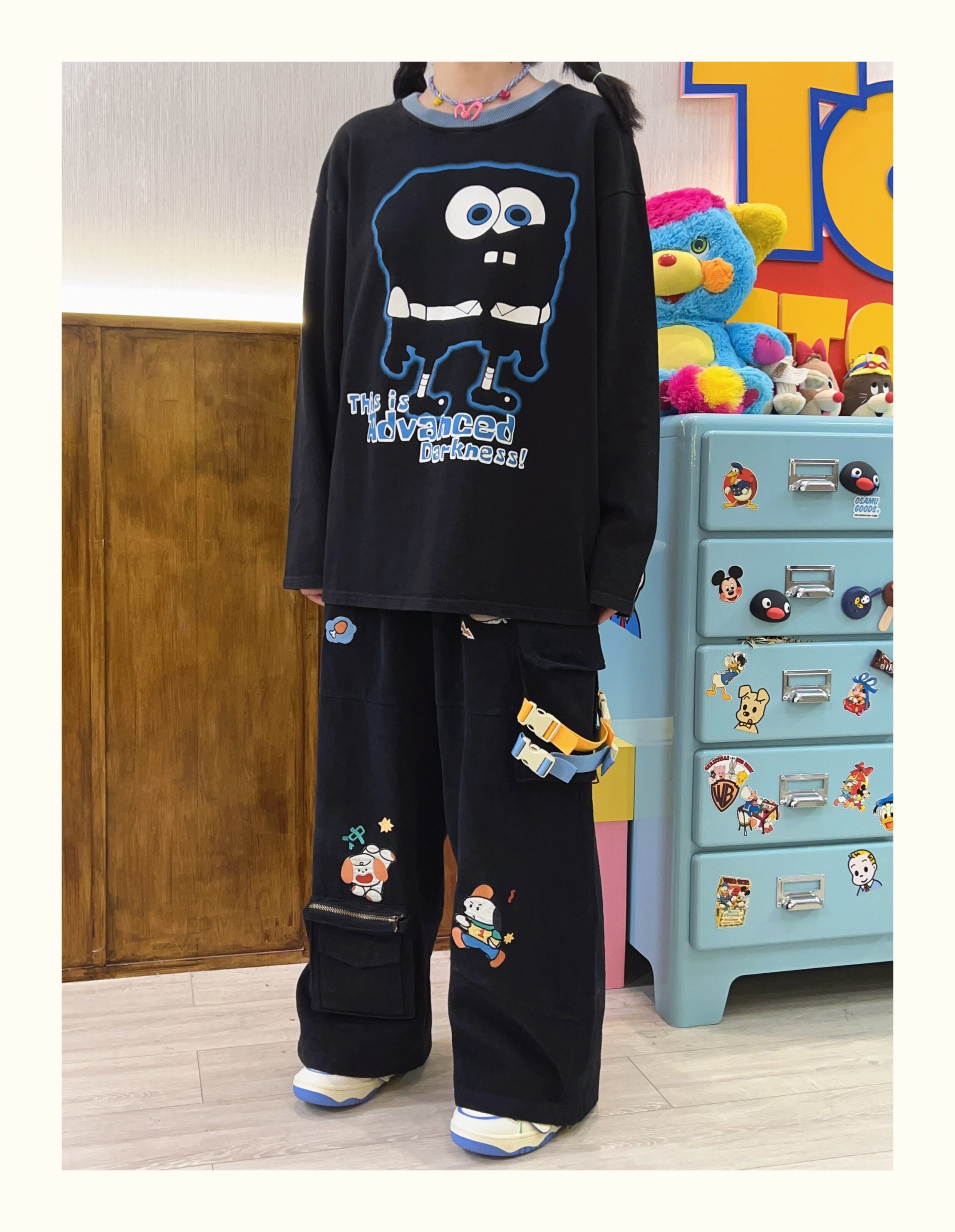 Robootoo童趣古著美式卡通印花減齡甜酷黑色全棉圓領厚棉T2023年秋