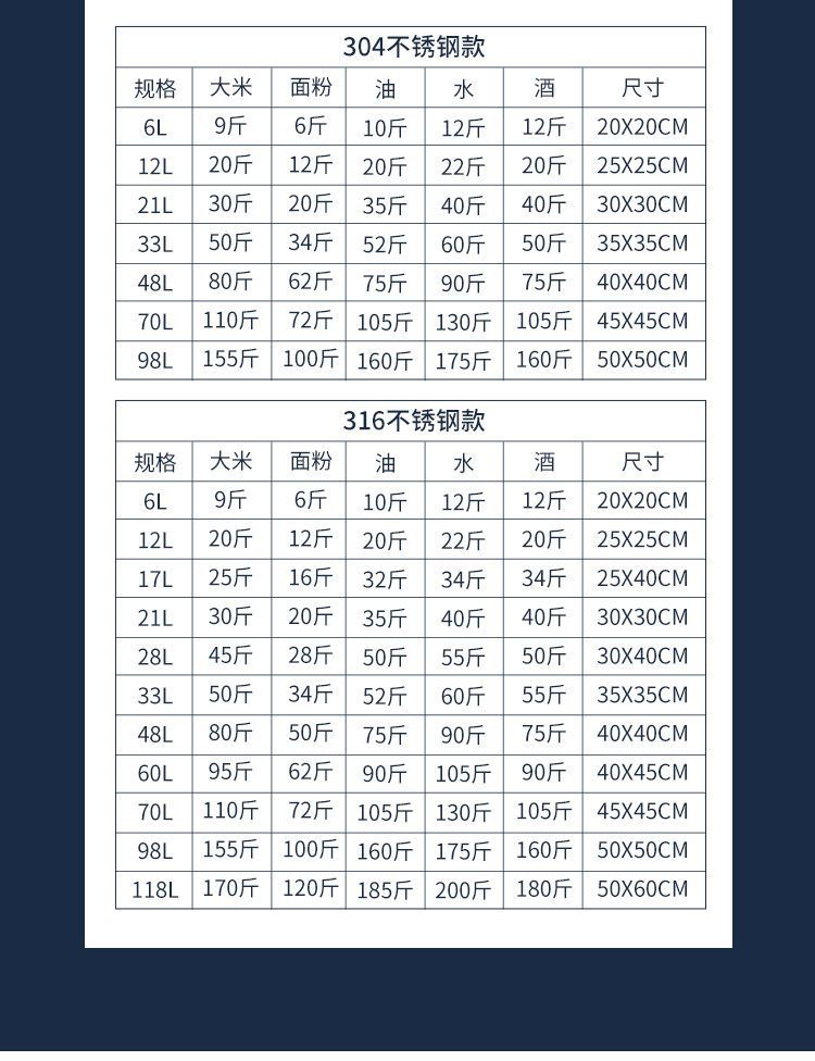 规格 6.2L无卡扣不密封,12升米20斤油20斤,21升米30斤油35斤,33升米50斤油53斤,48升米80斤油80斤,70升米110斤油115斤,98升米155斤油150斤