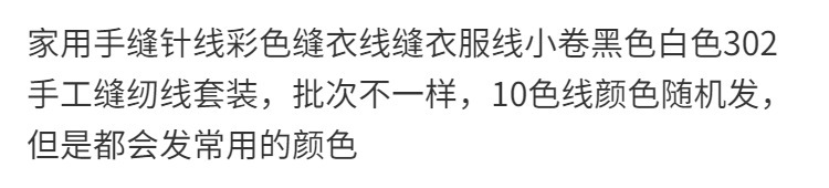 颜色 白色1卷,白色1卷+免穿针,黑色1卷,白色+黑色各1卷,白色+黑色各1卷+免穿针,白色+黑色各1卷+圆盘针,白色+黑色+红色各1卷,白色+黑色+红色各1卷+免穿针,白色+黑色各2卷,白色10卷,黑色10卷,白色+黑色各5卷,白色+黑色各5卷+免穿针,白色5卷+免穿针,黑色5卷+免穿针,10色 各1卷,10色 各1卷+免穿针,10色 各1卷+圆盘针,红色1卷