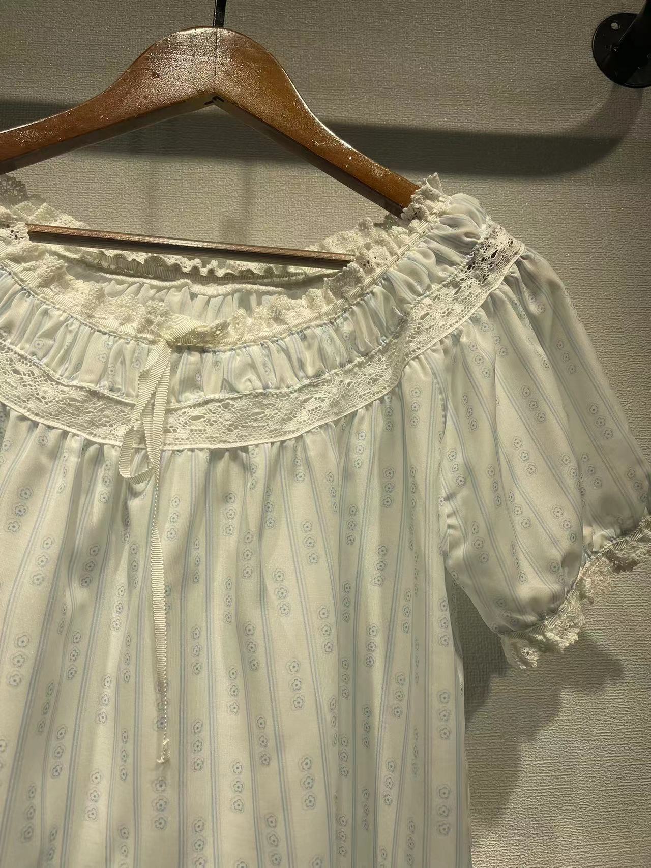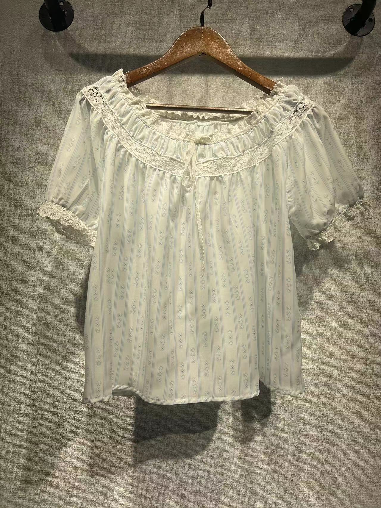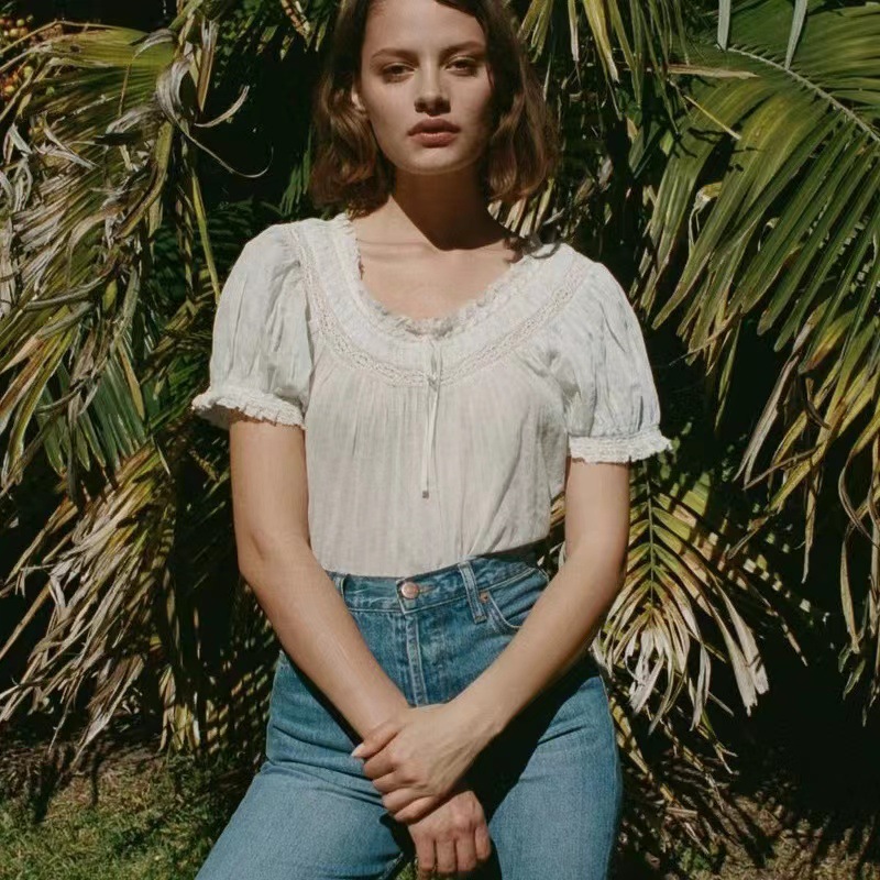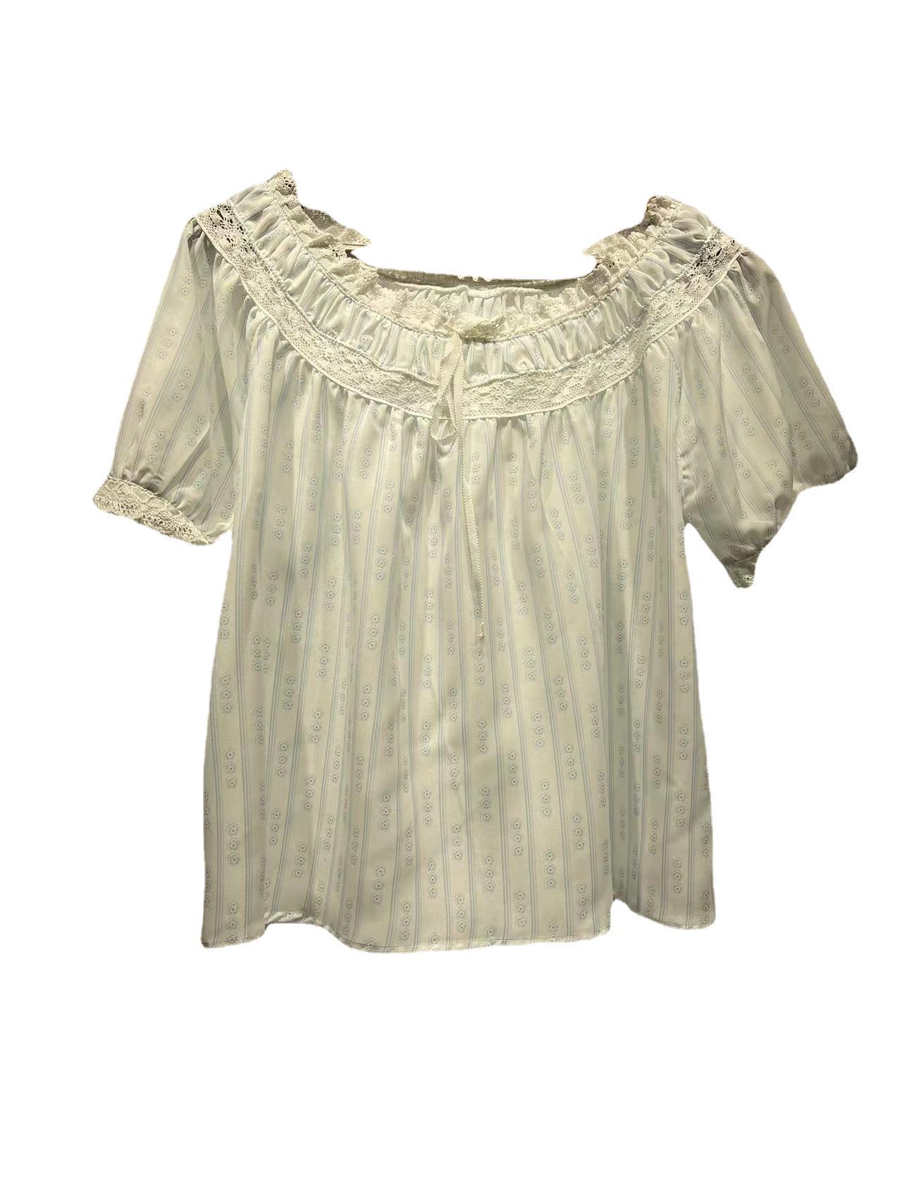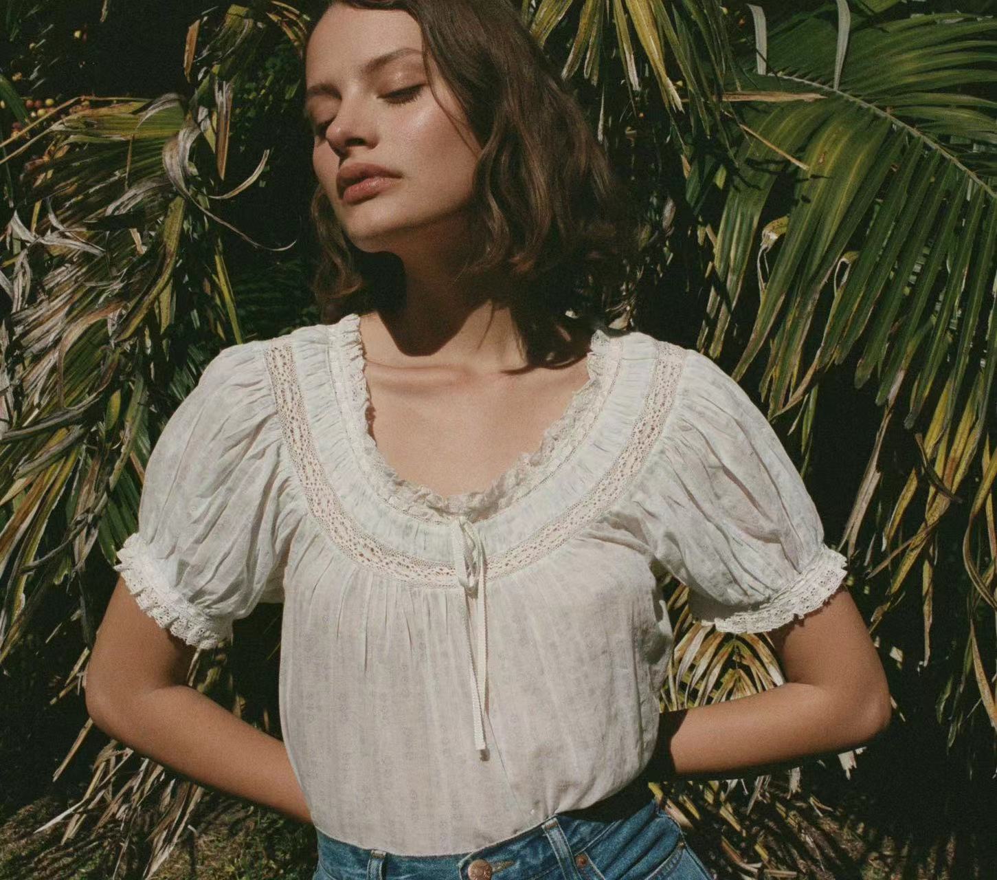 美系DO2023春夏新款碎花泡泡袖衬衣蕾丝拼接圆领系带短袖女31265