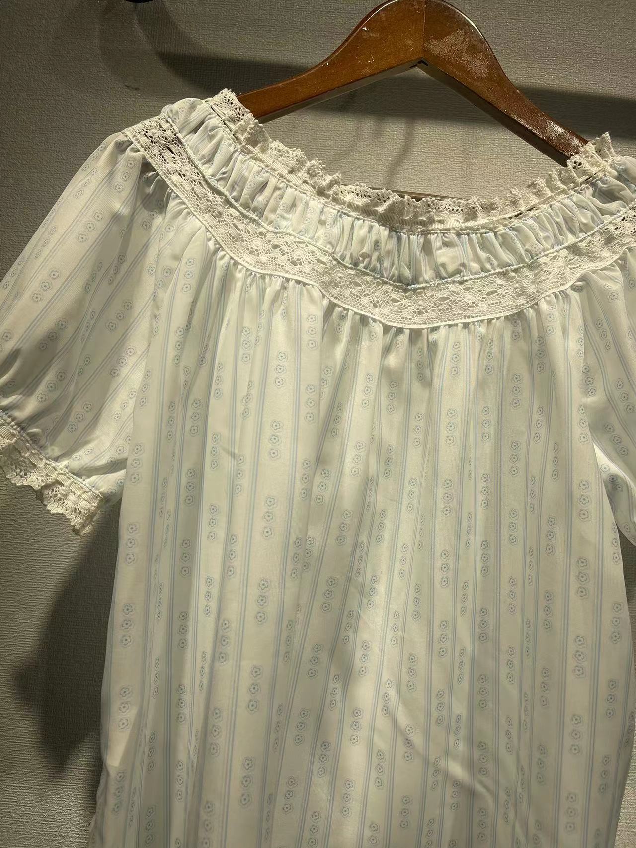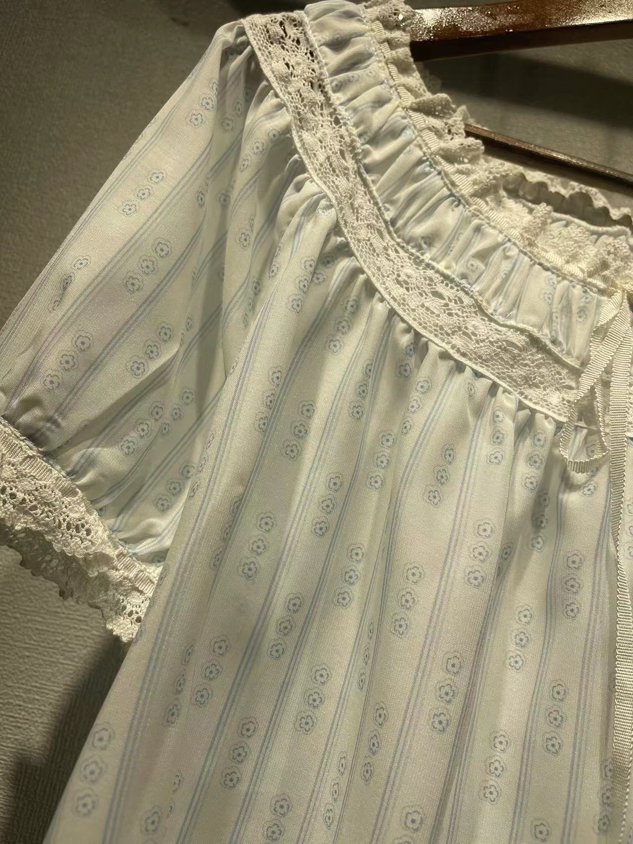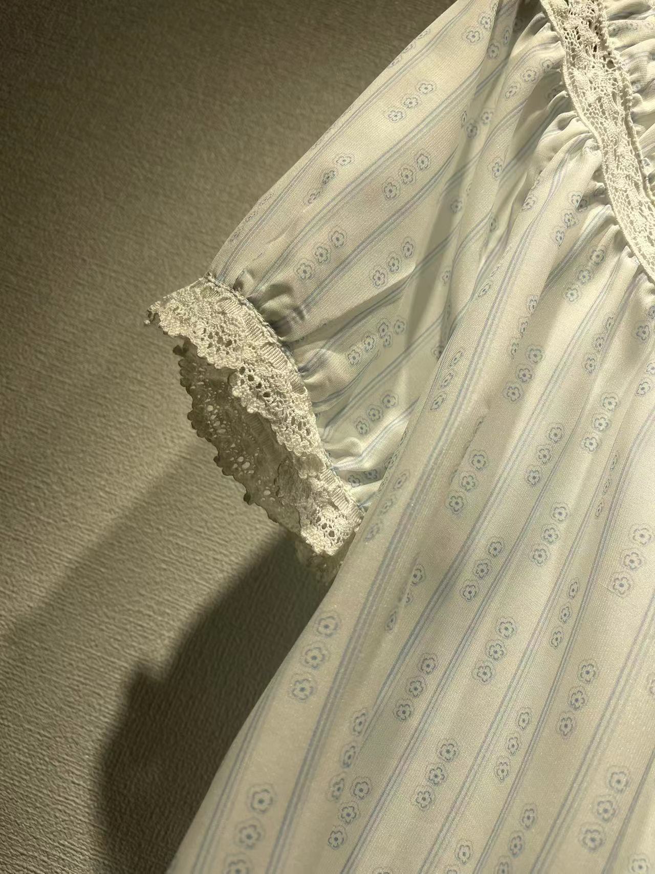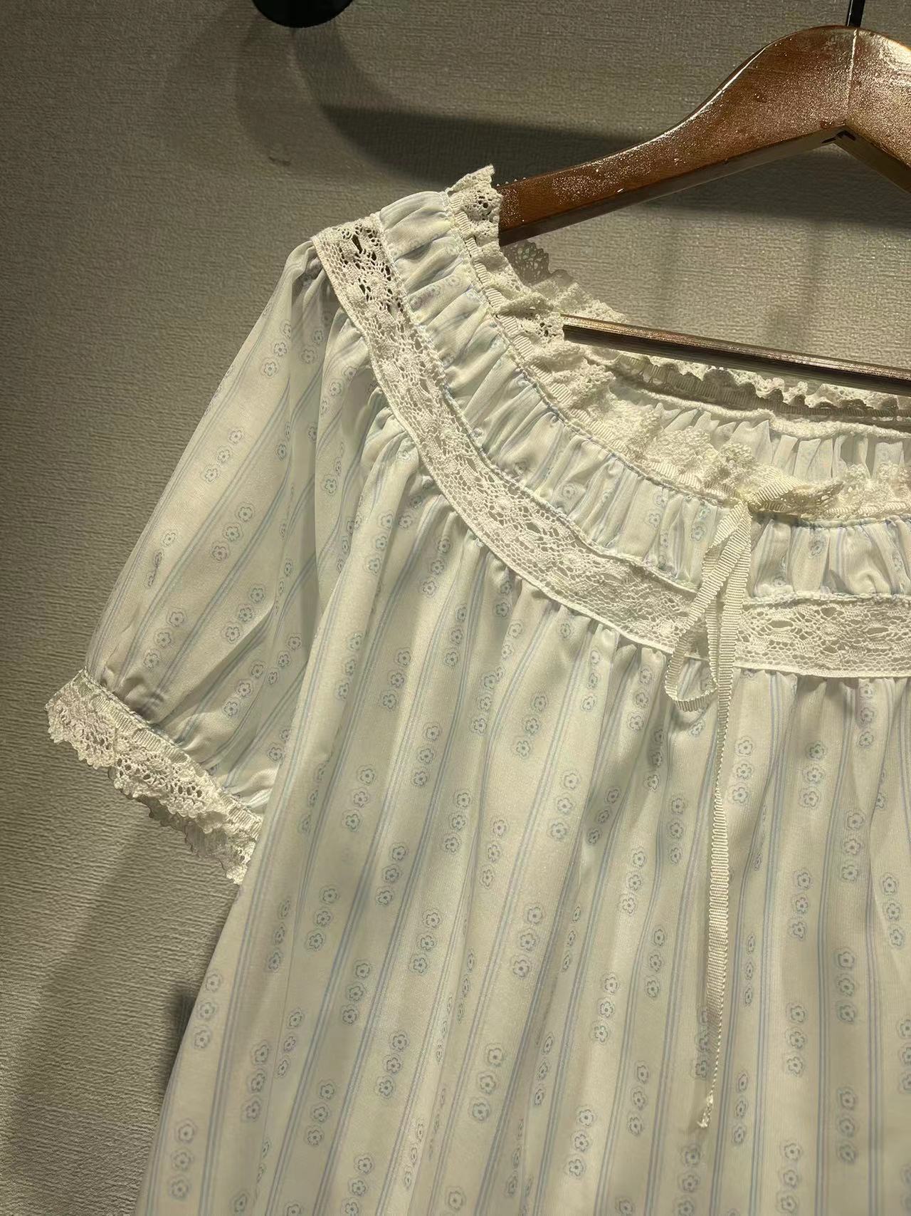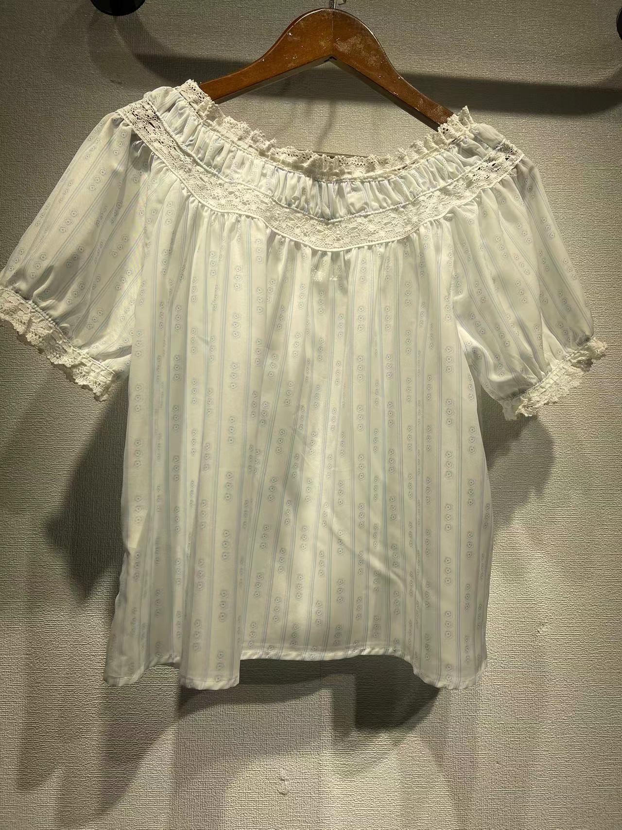 美系DO2023春夏新款碎花泡泡袖衬衣蕾丝拼接圆领系带短袖女31265