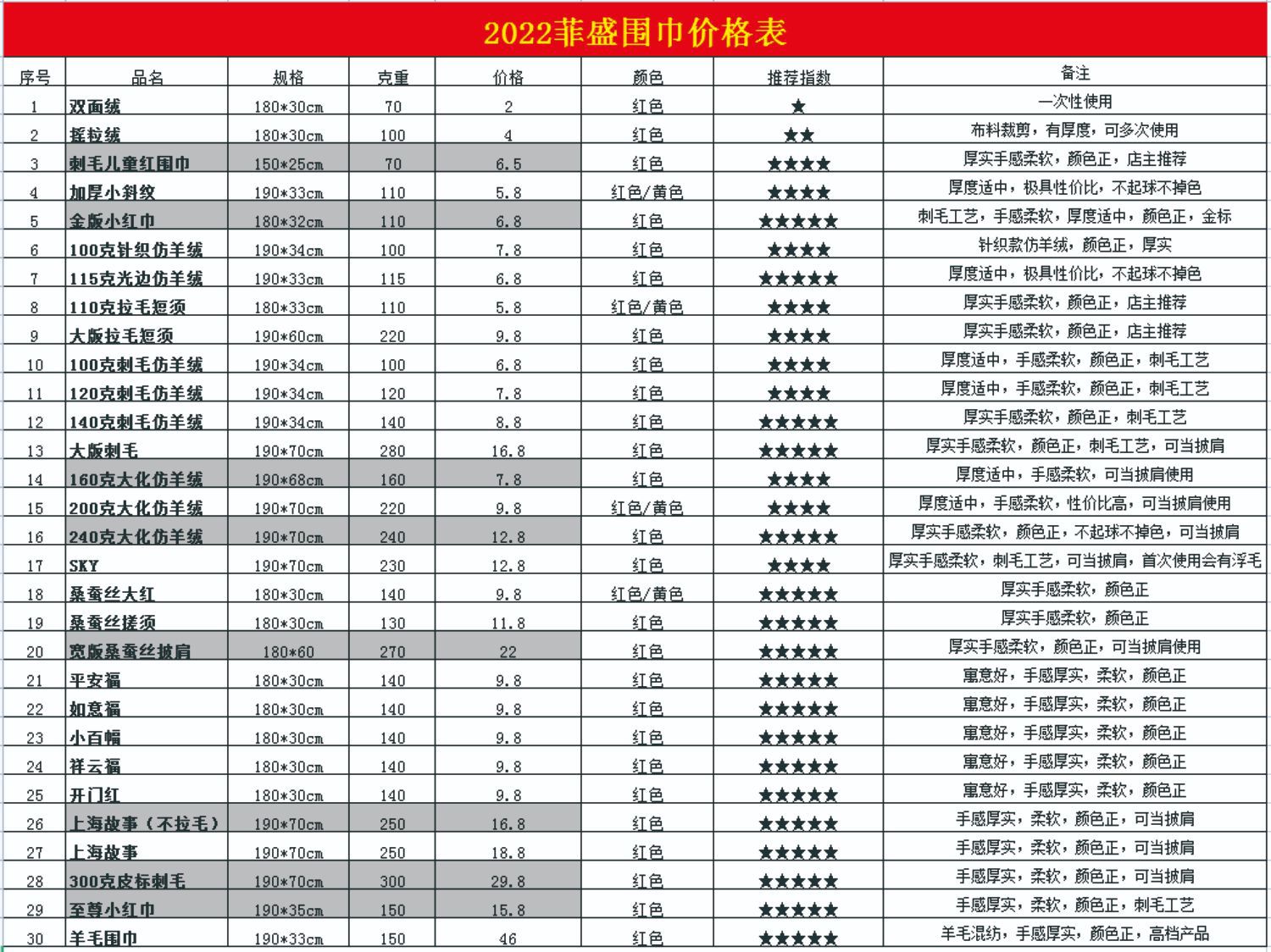 颜色 双面绒180*30,摇粒绒180*30,110克加厚小斜纹190*34,金标小红巾180*32,100克针织仿羊绒180*34,120克小刺毛,140克刺毛仿羊绒190*33,至尊小红巾190*35,羊毛围巾190*33,110克短须180*32,桑蚕丝大红180*30,宽版桑蚕丝披肩180*60,200克仿羊绒190*70,250克上海故事190*70,280克大版刺毛190*70,300克仿羊绒刺毛,平安福围巾180*30,祥云福180*30,百福围巾180*30,开门红180*30,如意福围巾180*30,包装盒整套