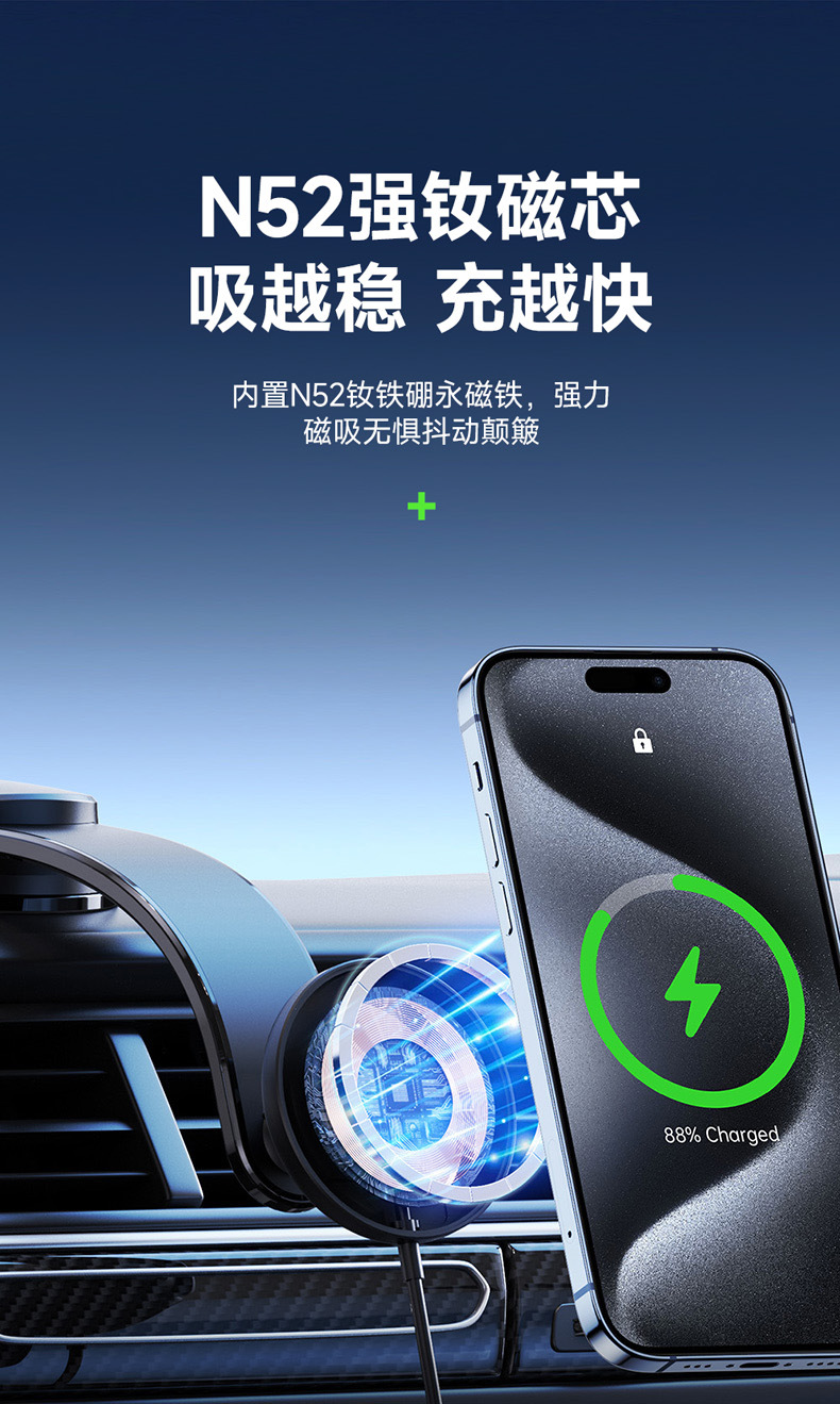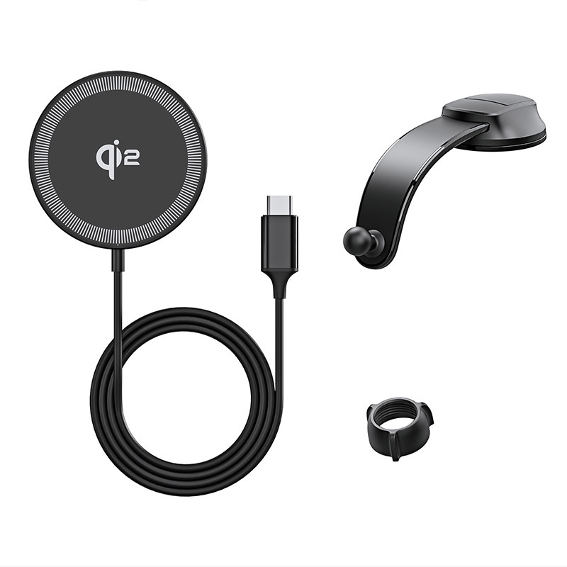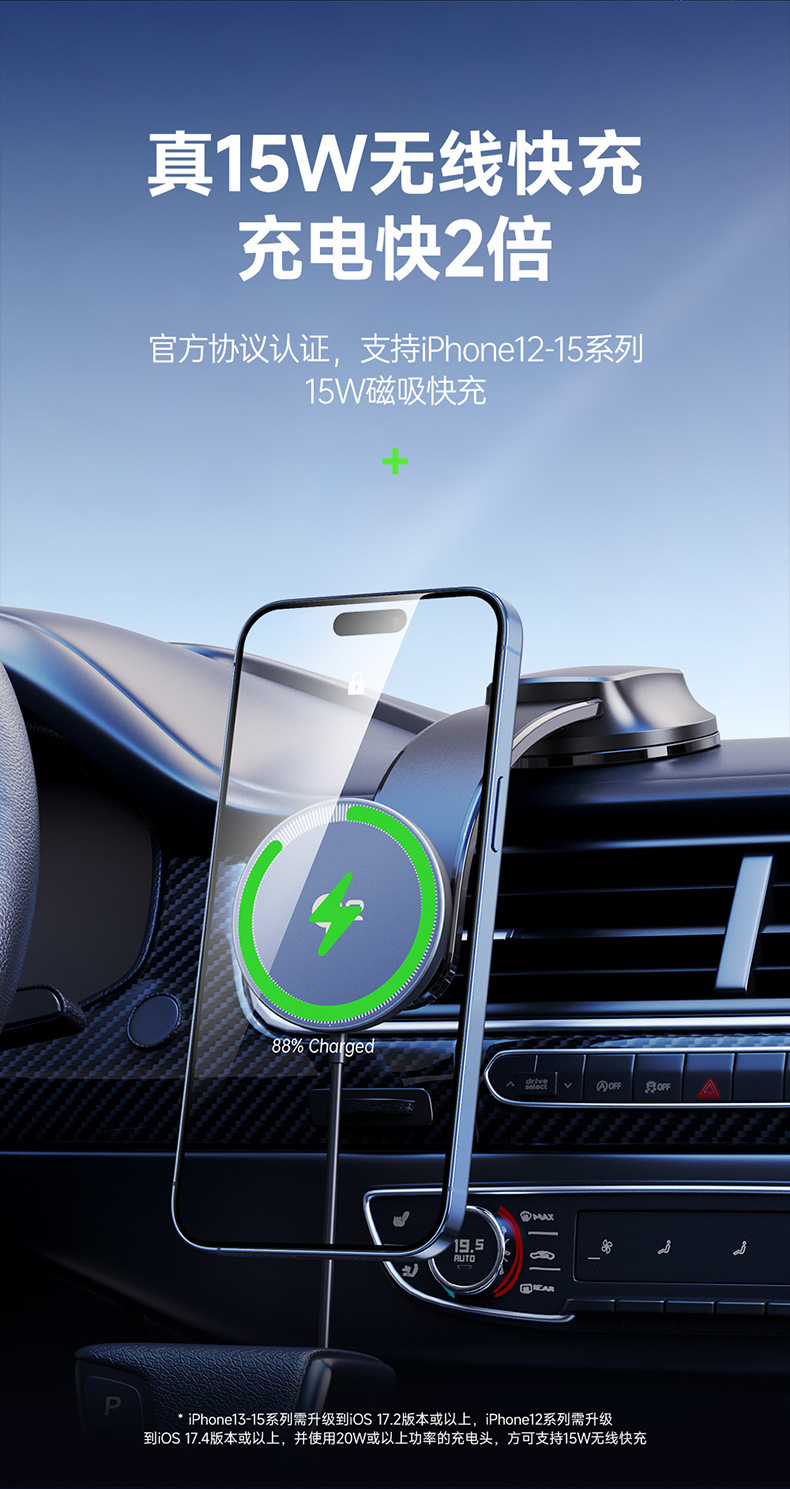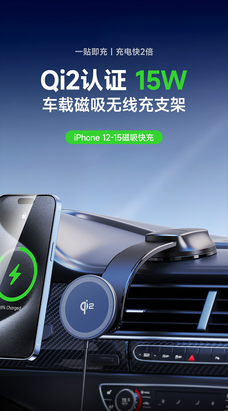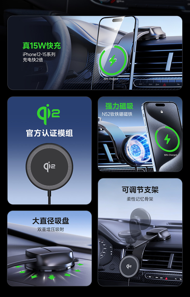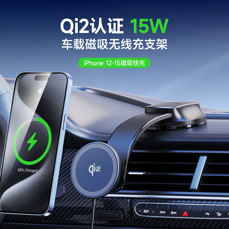 Qi2车载无线快充批发 适用MagSafe15W苹果磁吸无线充吸附车充跨境