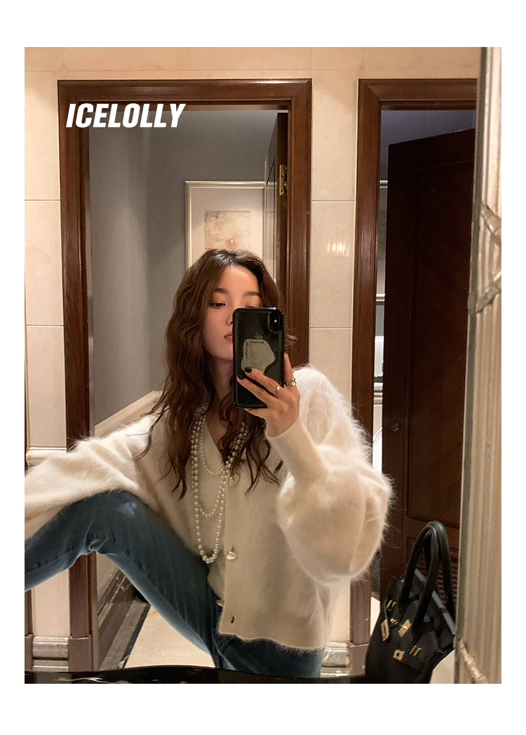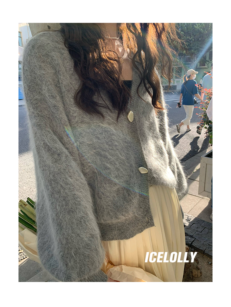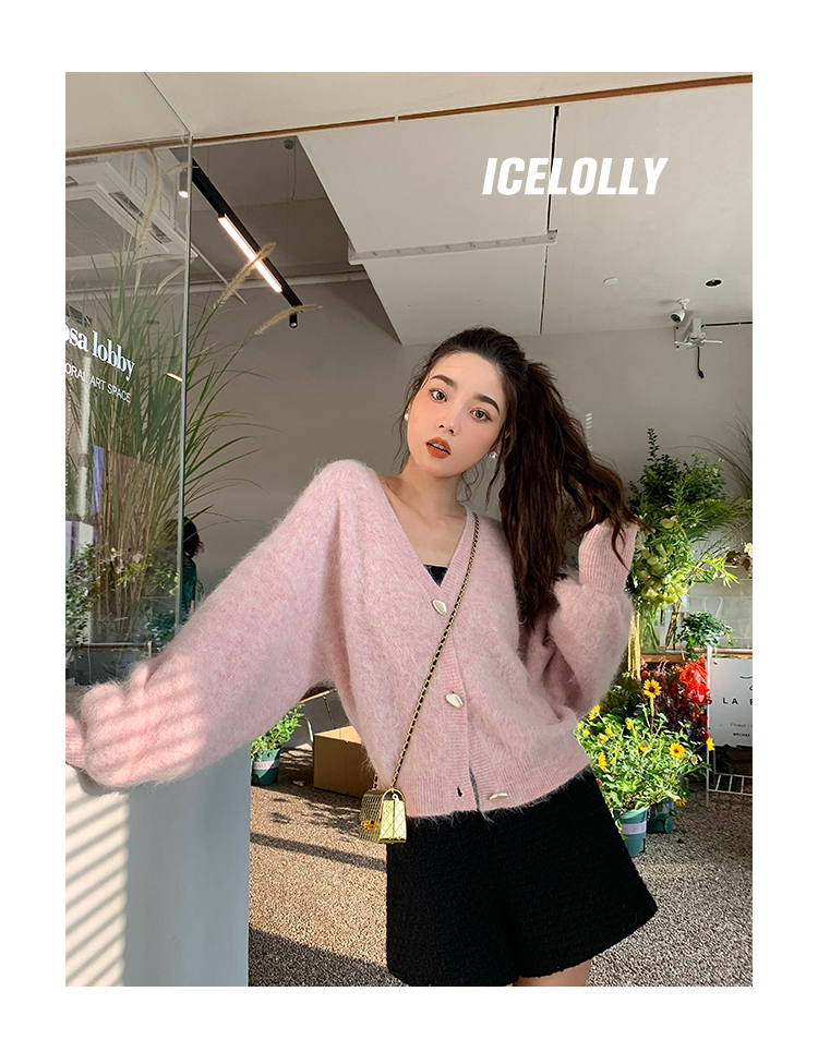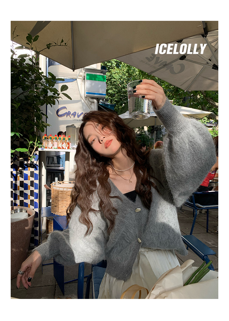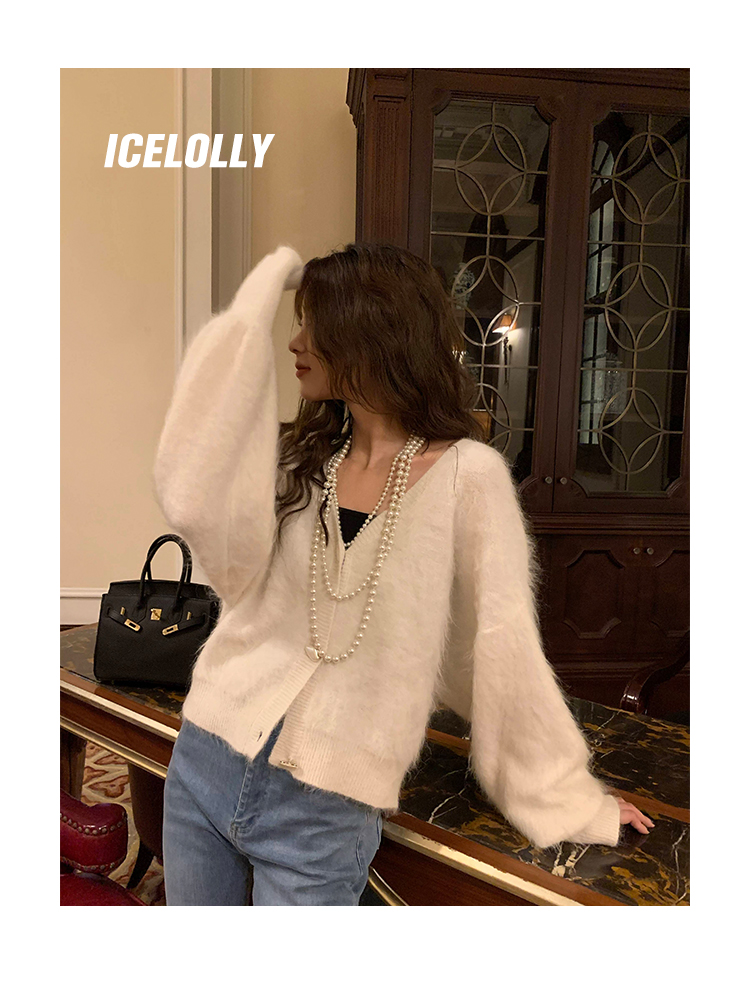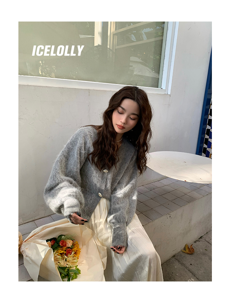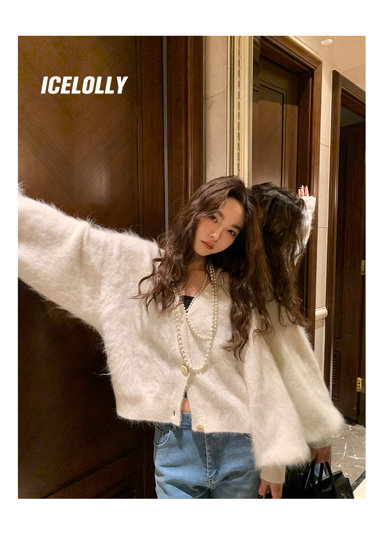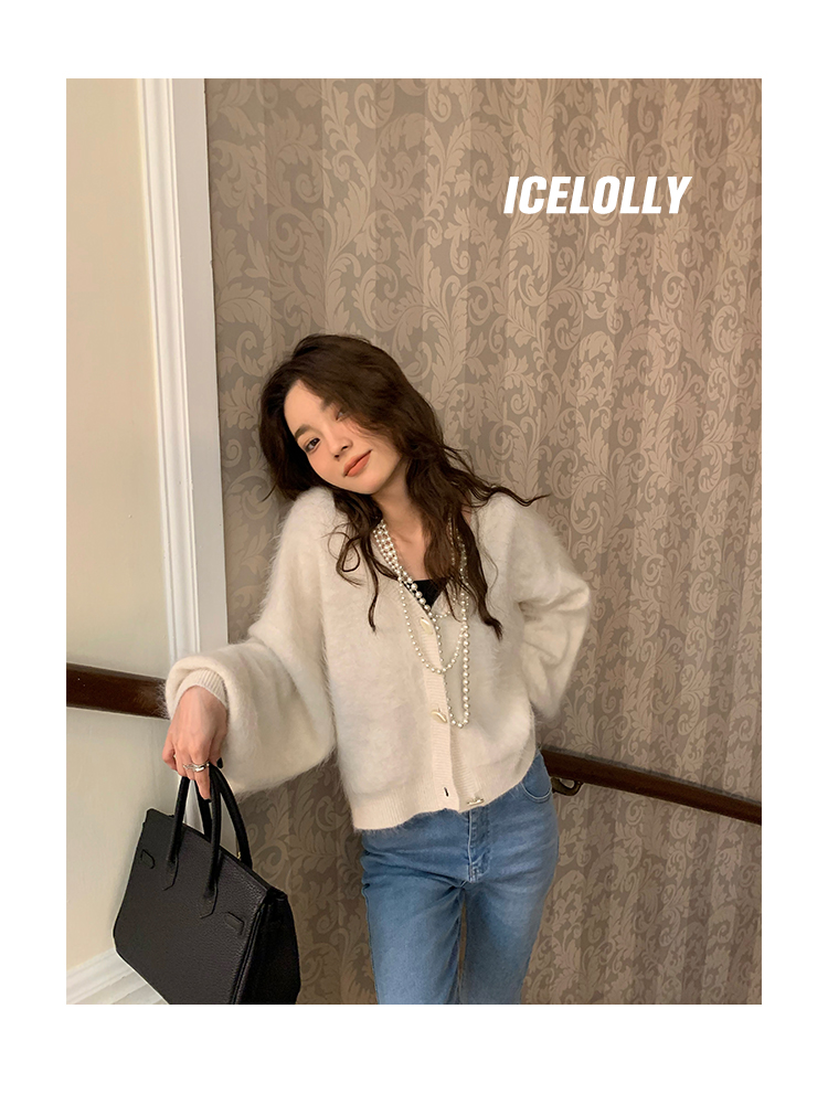 ICELOLLY慵懶風V領羊毛毛衣外套女秋冬外穿短款針織開衫深秋上衣