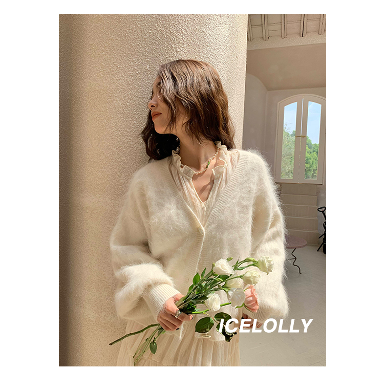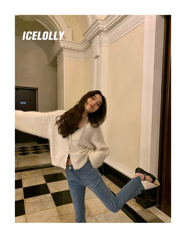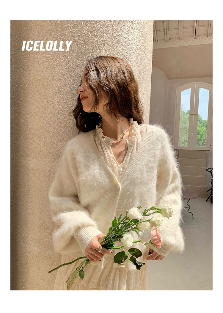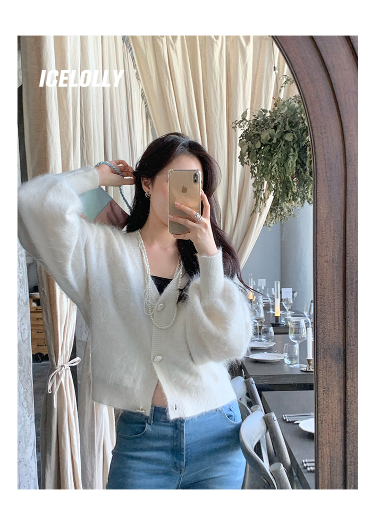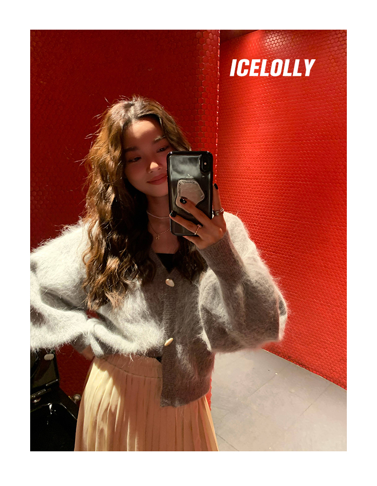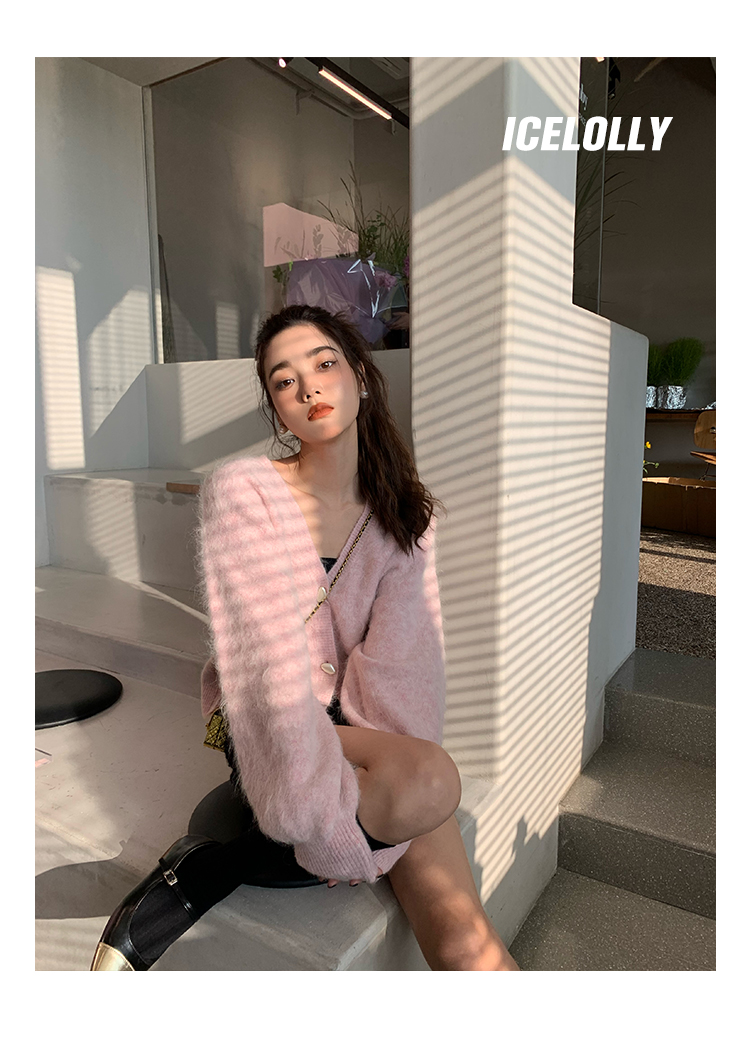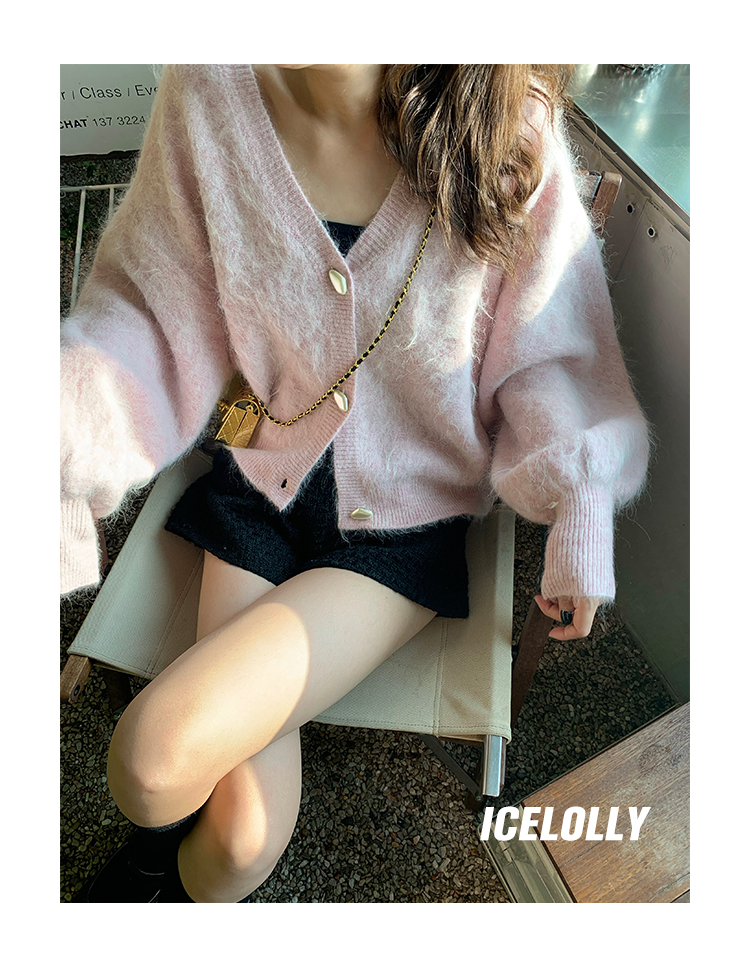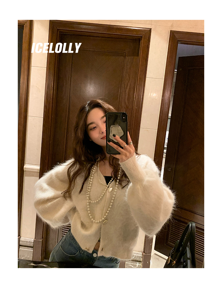 ICELOLLY慵懶風V領羊毛毛衣外套女秋冬外穿短款針織開衫深秋上衣