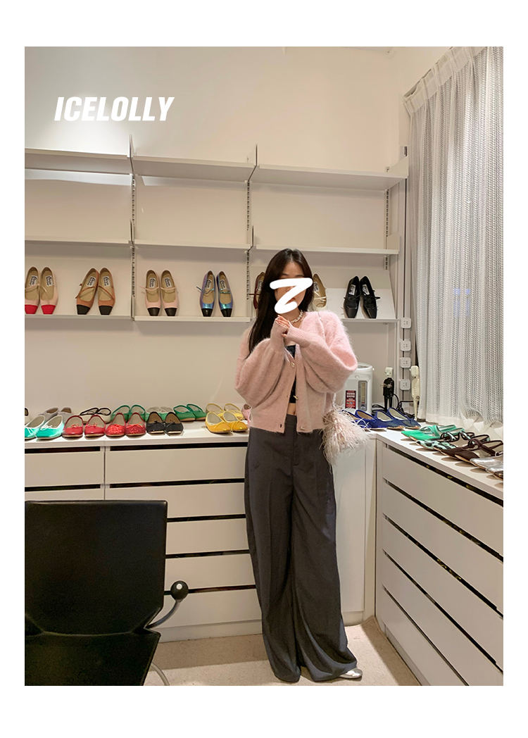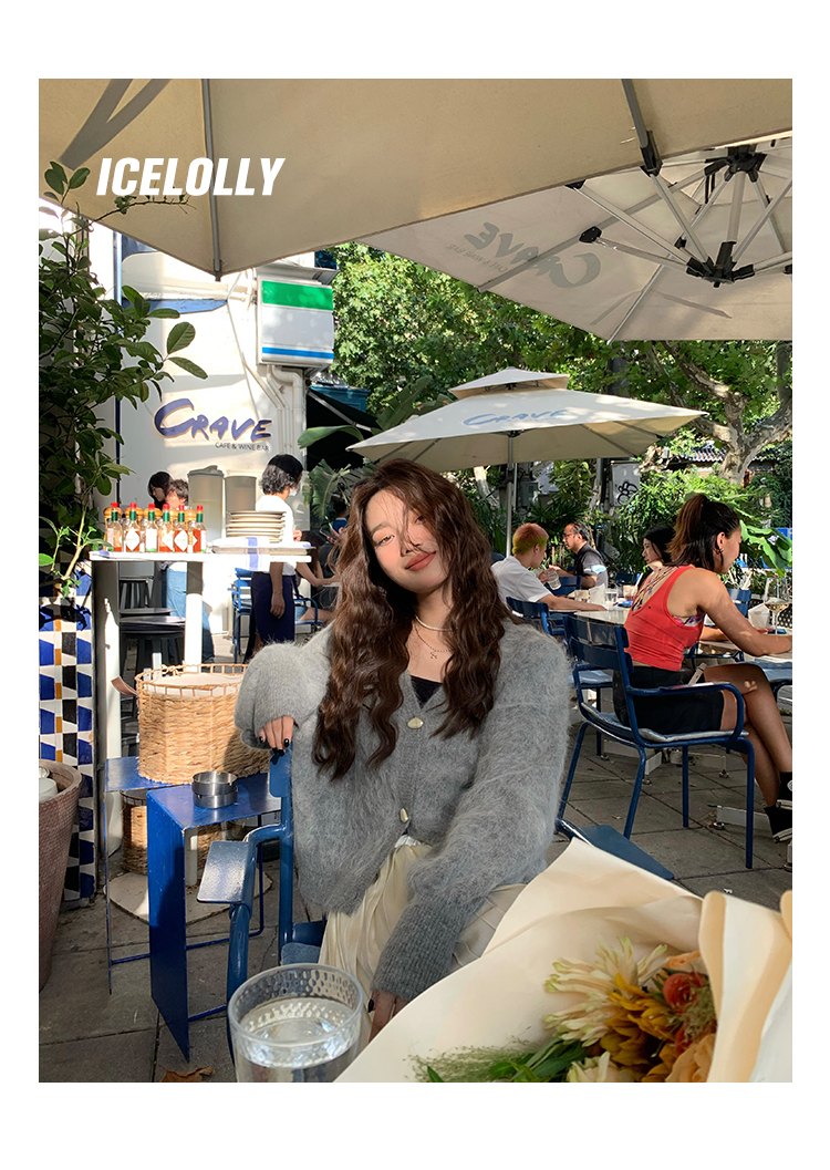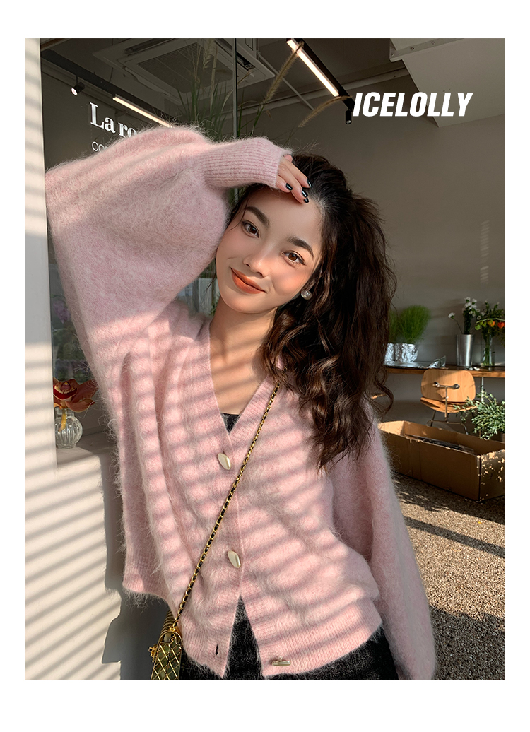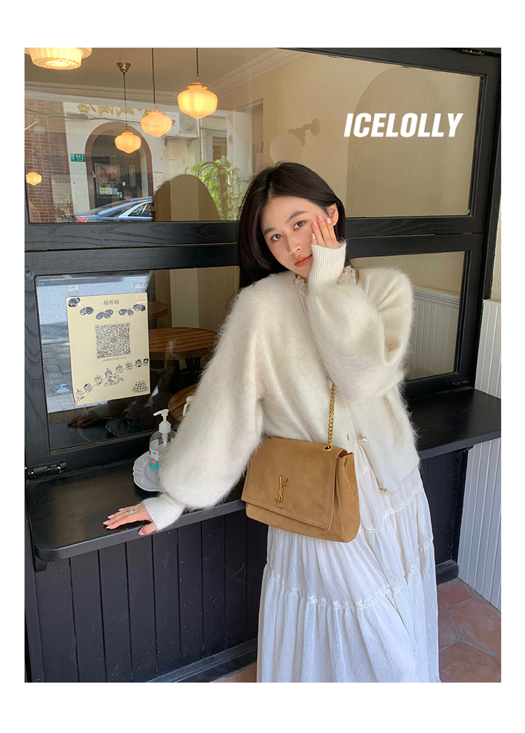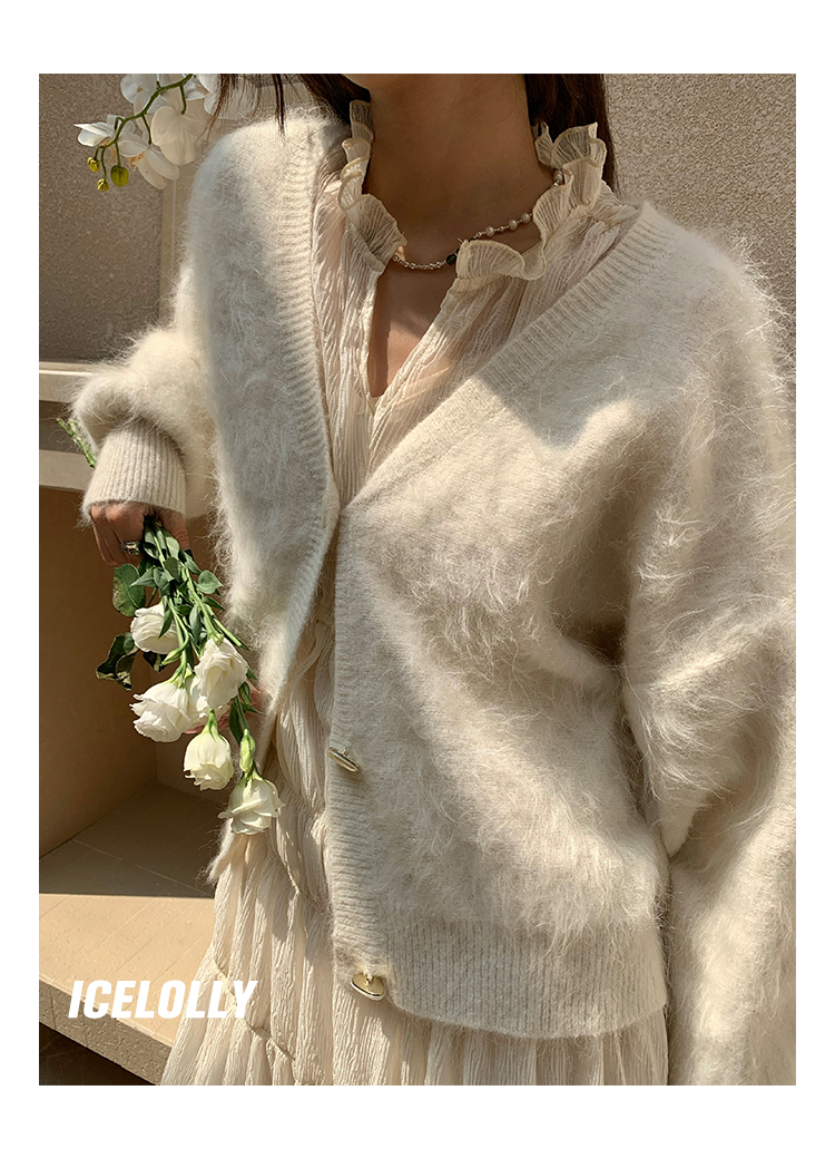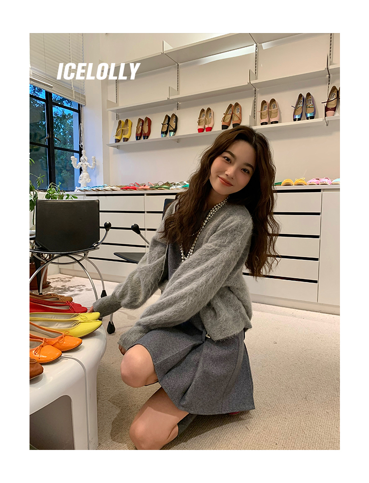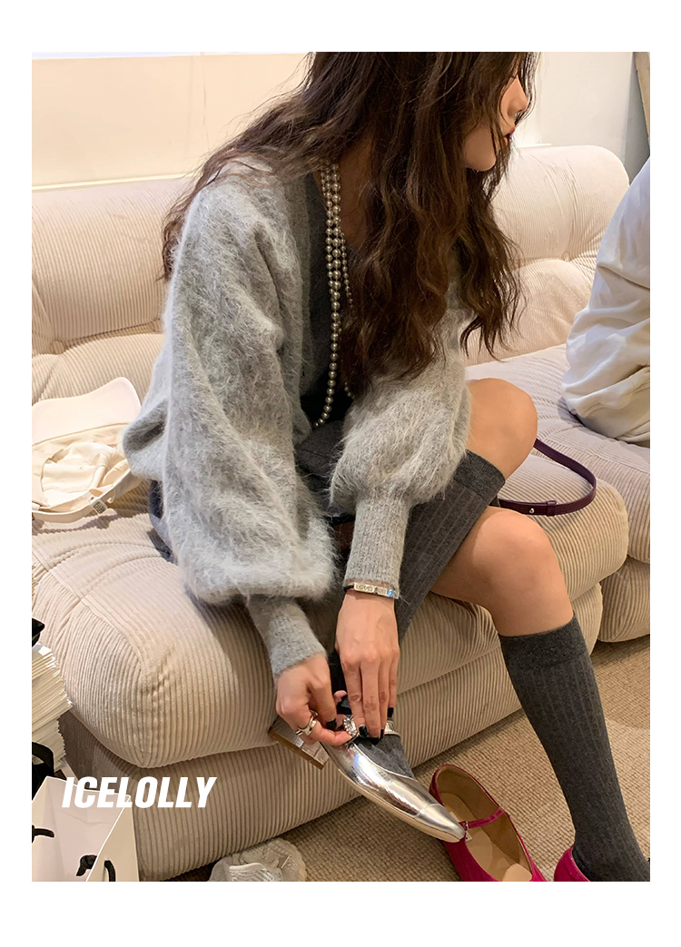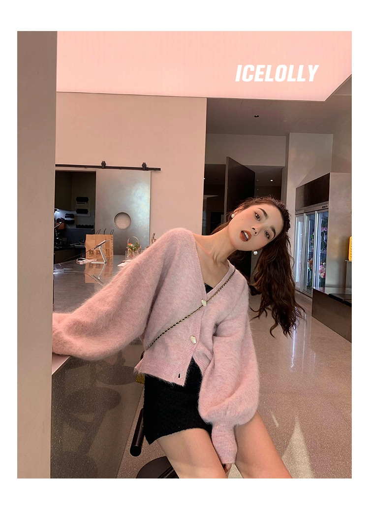 ICELOLLY慵懶風V領羊毛毛衣外套女秋冬外穿短款針織開衫深秋上衣