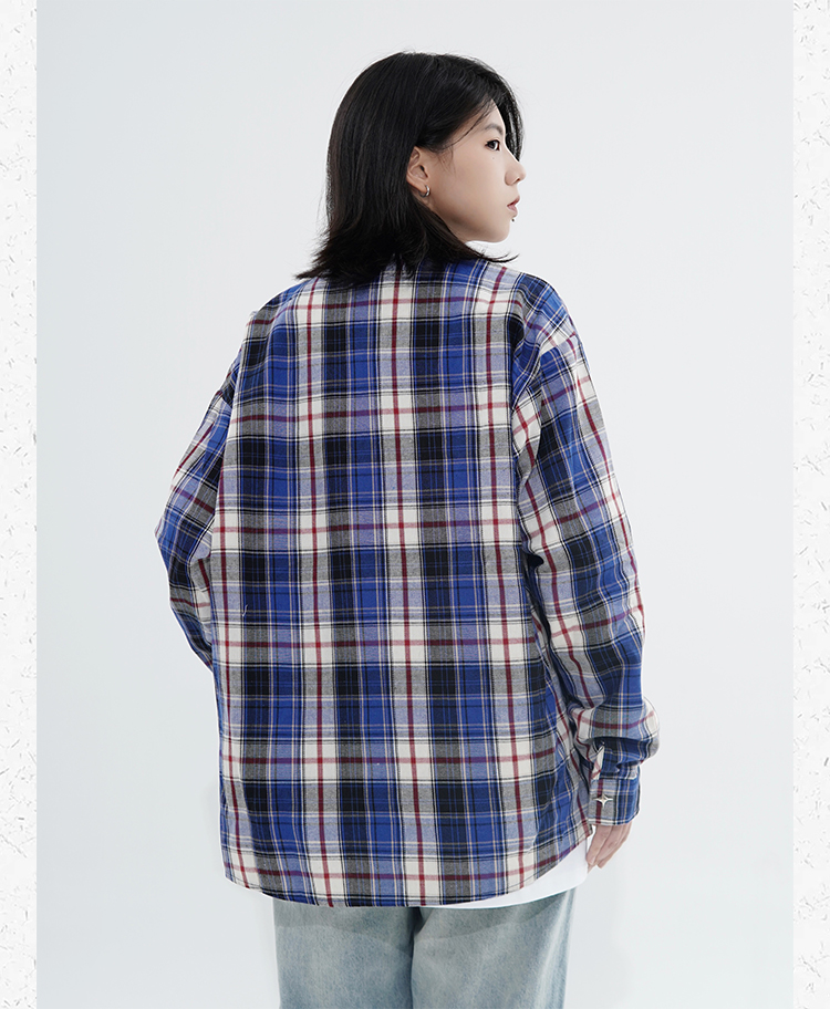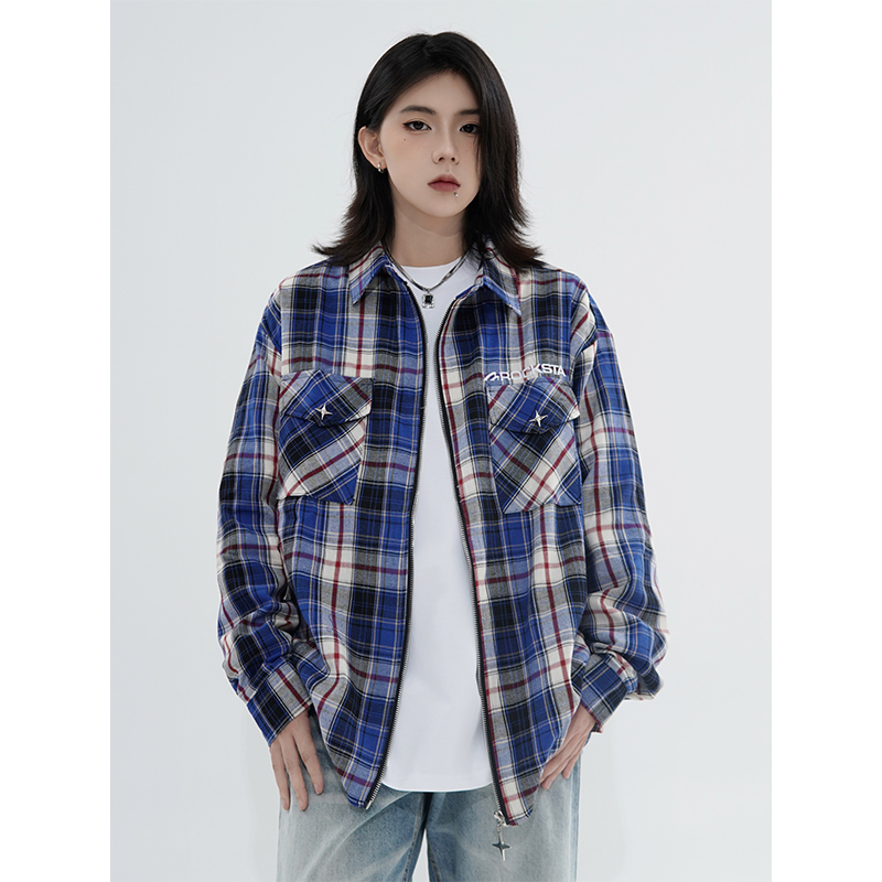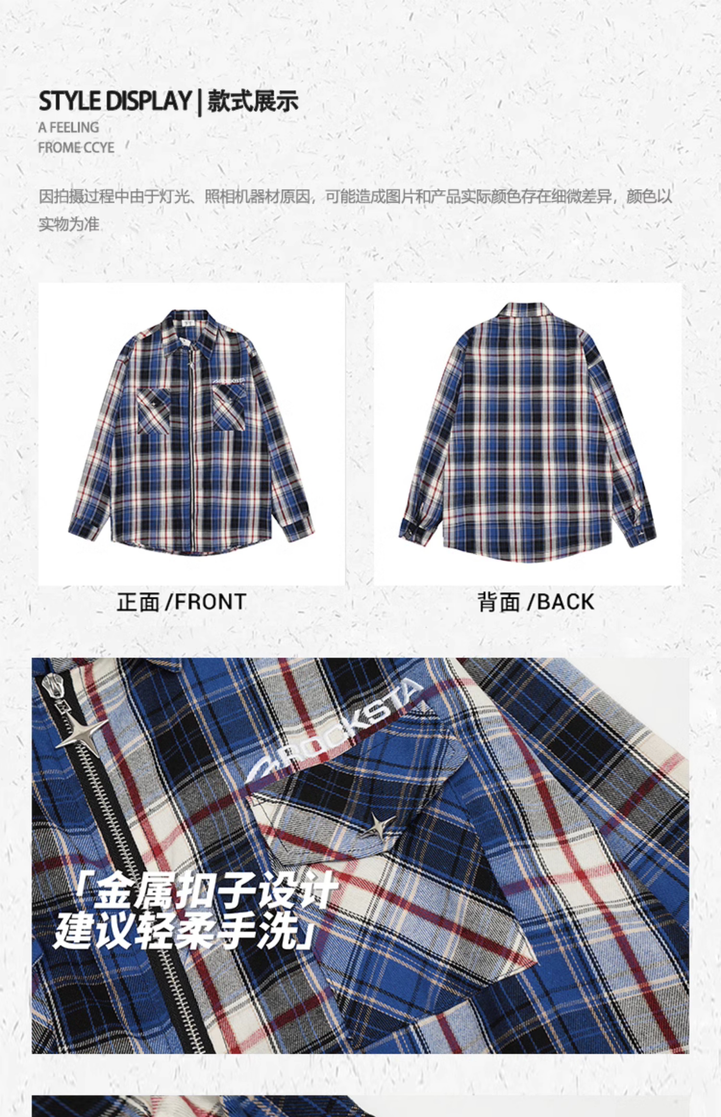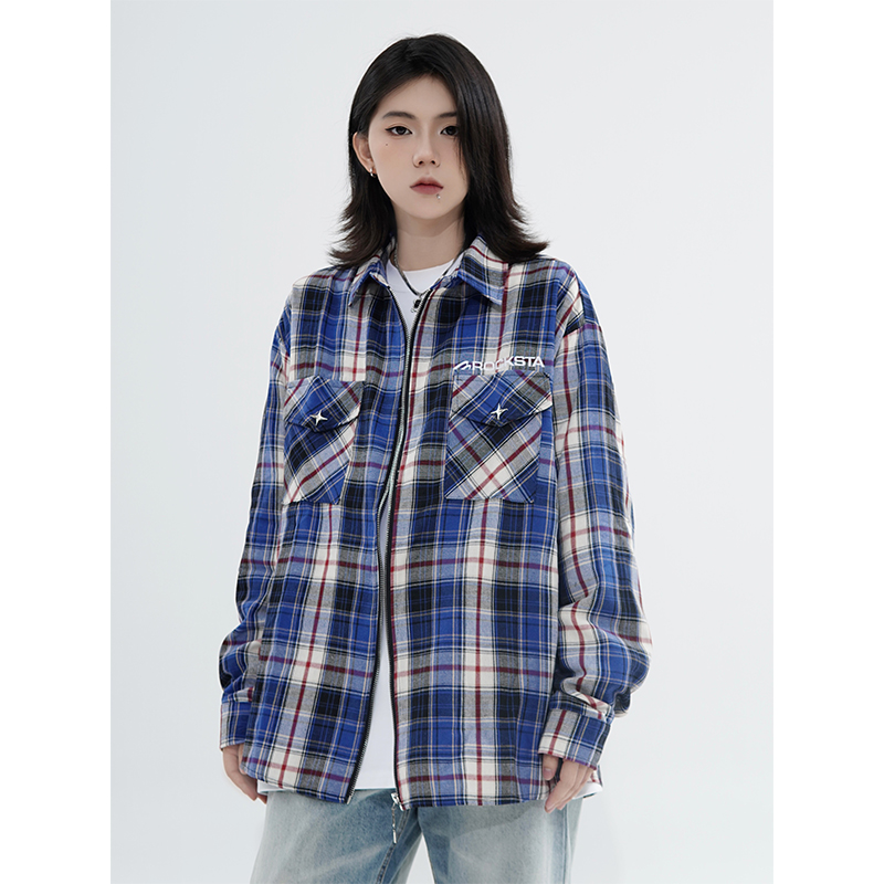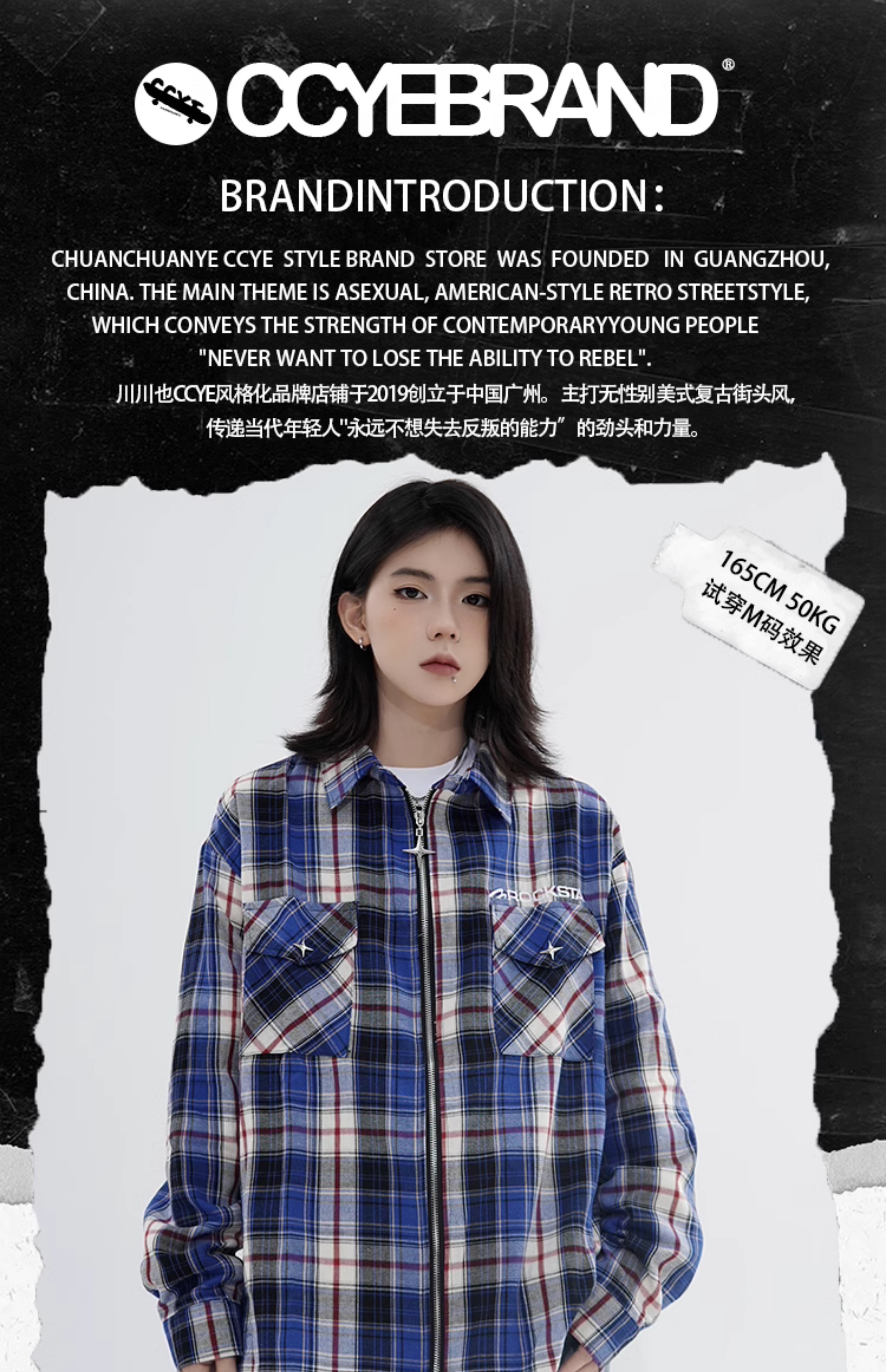 川川也美式街頭格子長袖襯衫外套男女復古寬鬆POLO衫開衫上衣潮牌