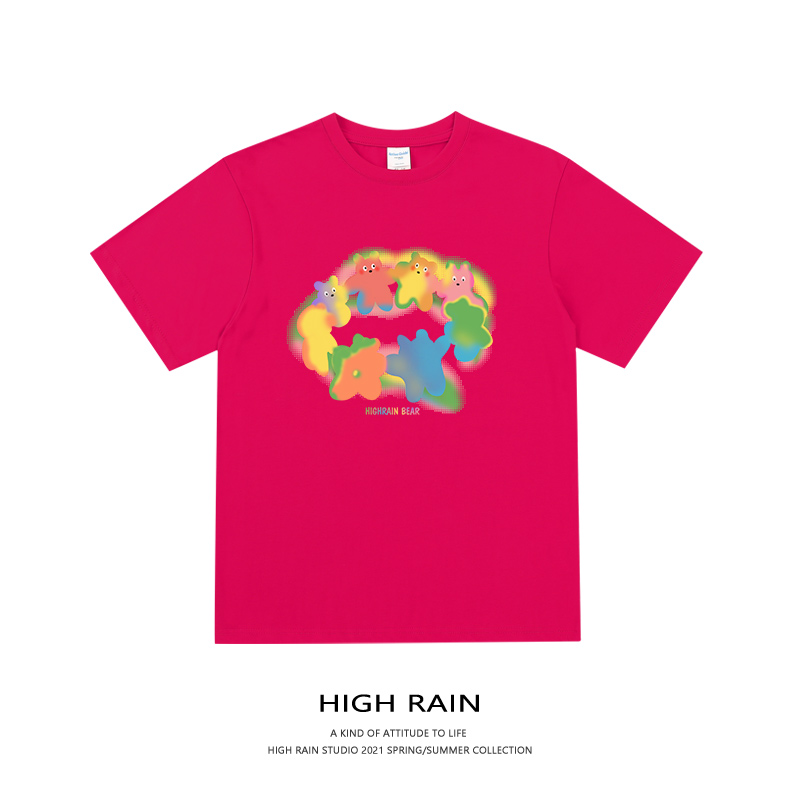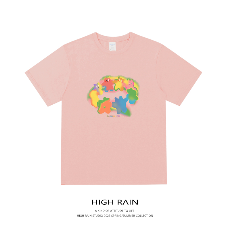 HIGH RAIN夏季新款彩虹熊短袖男女純棉寬鬆T恤設計感情侶上衣