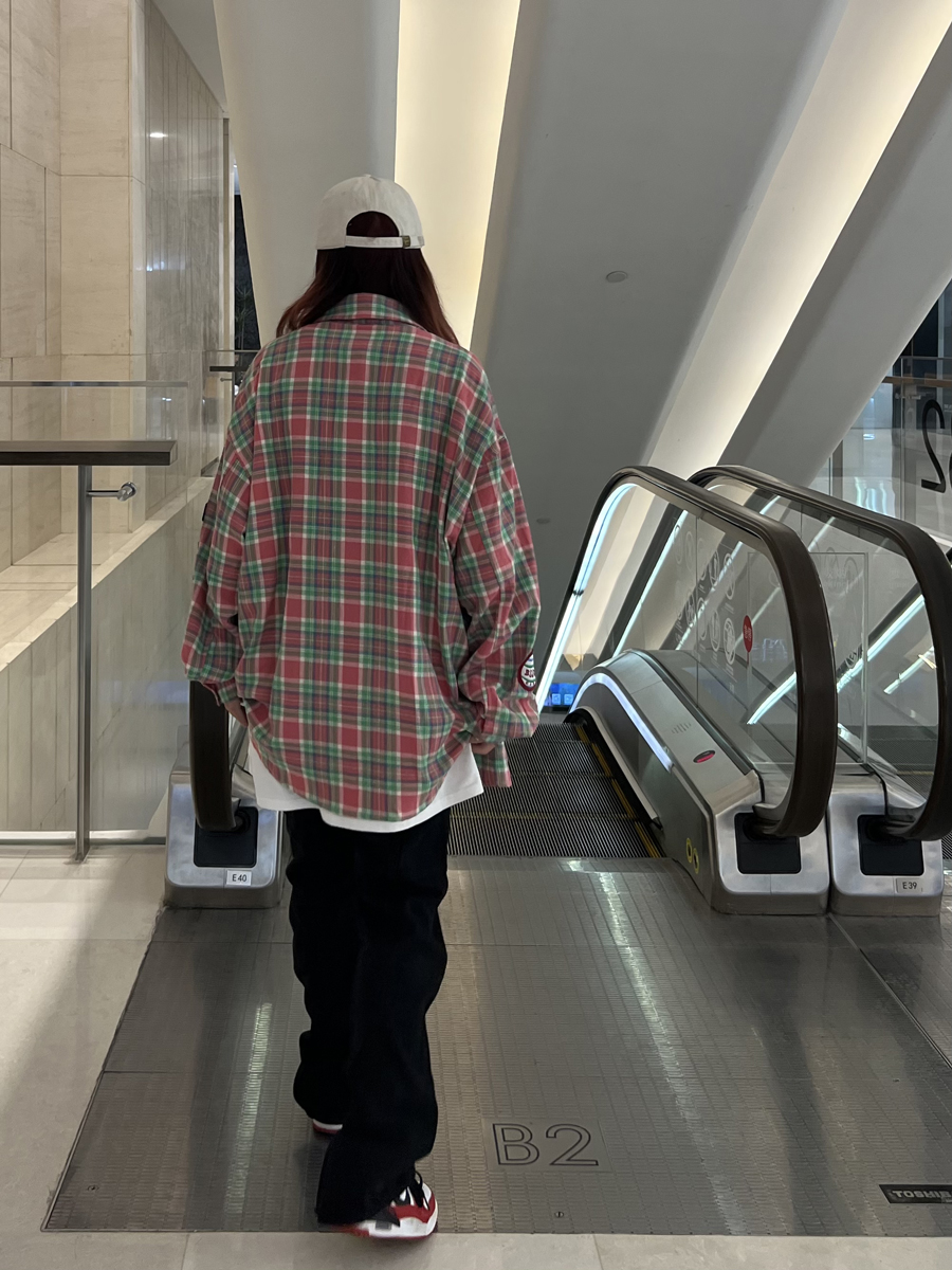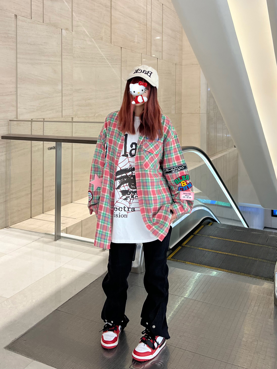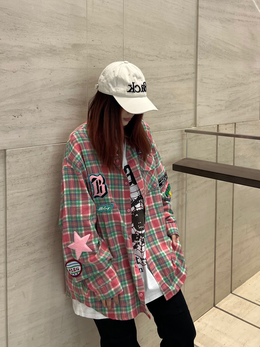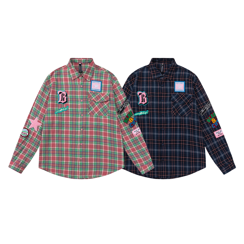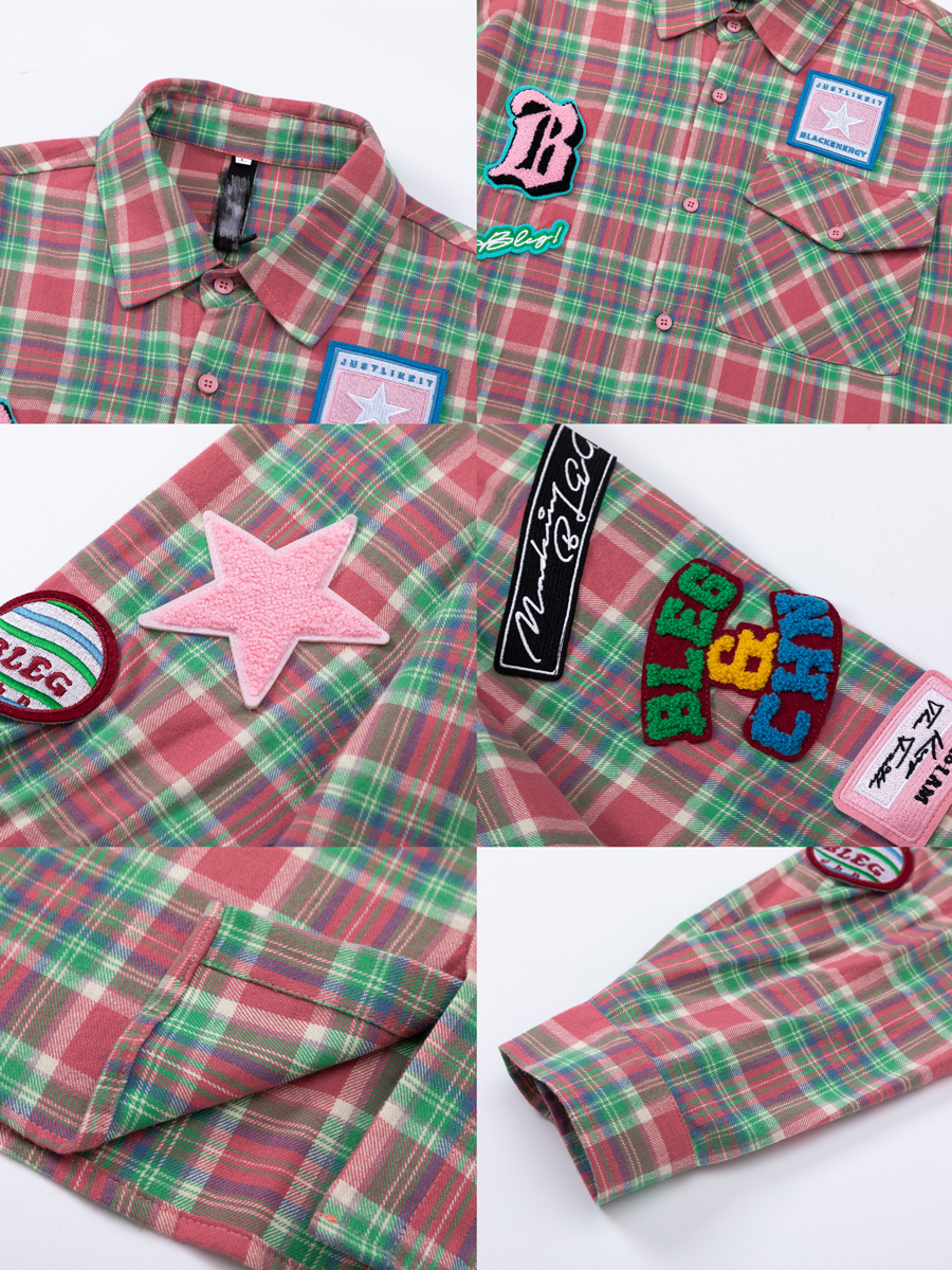 JU403 美式小眾毛巾繡布貼長袖格子襯衫秋季情侶寬鬆休閒襯衣外套