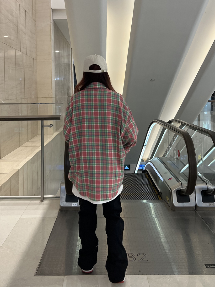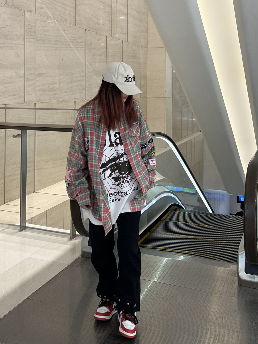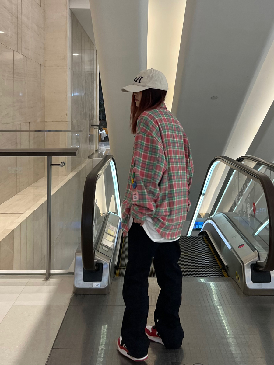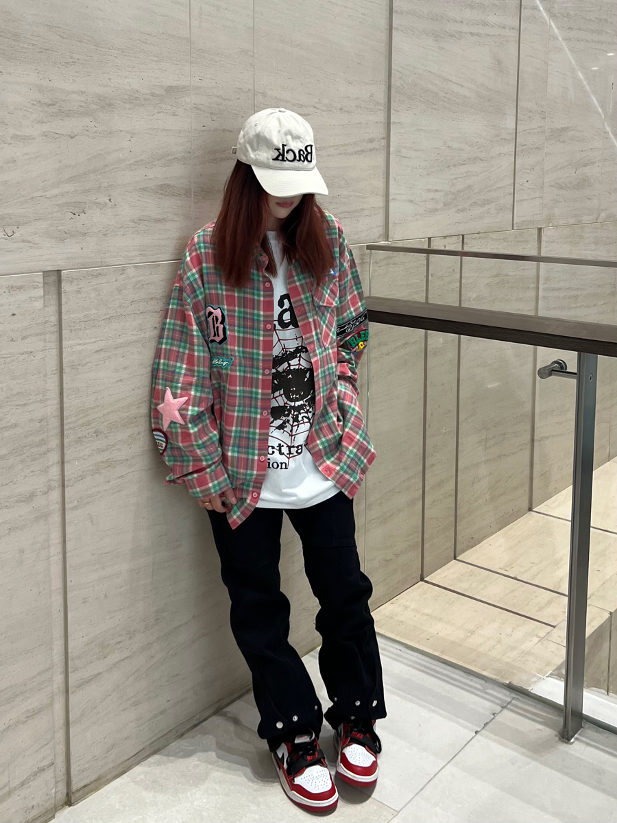 JU403 美式小眾毛巾繡布貼長袖格子襯衫秋季情侶寬鬆休閒襯衣外套