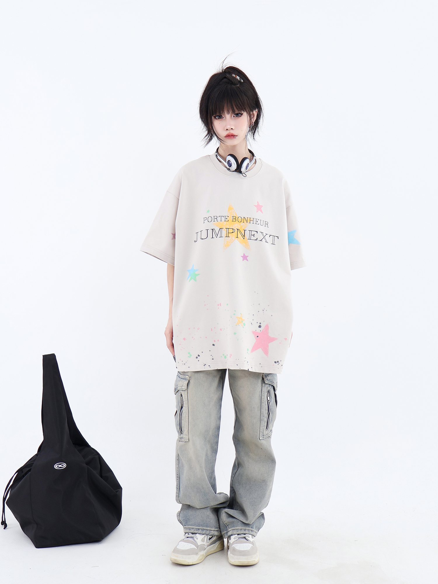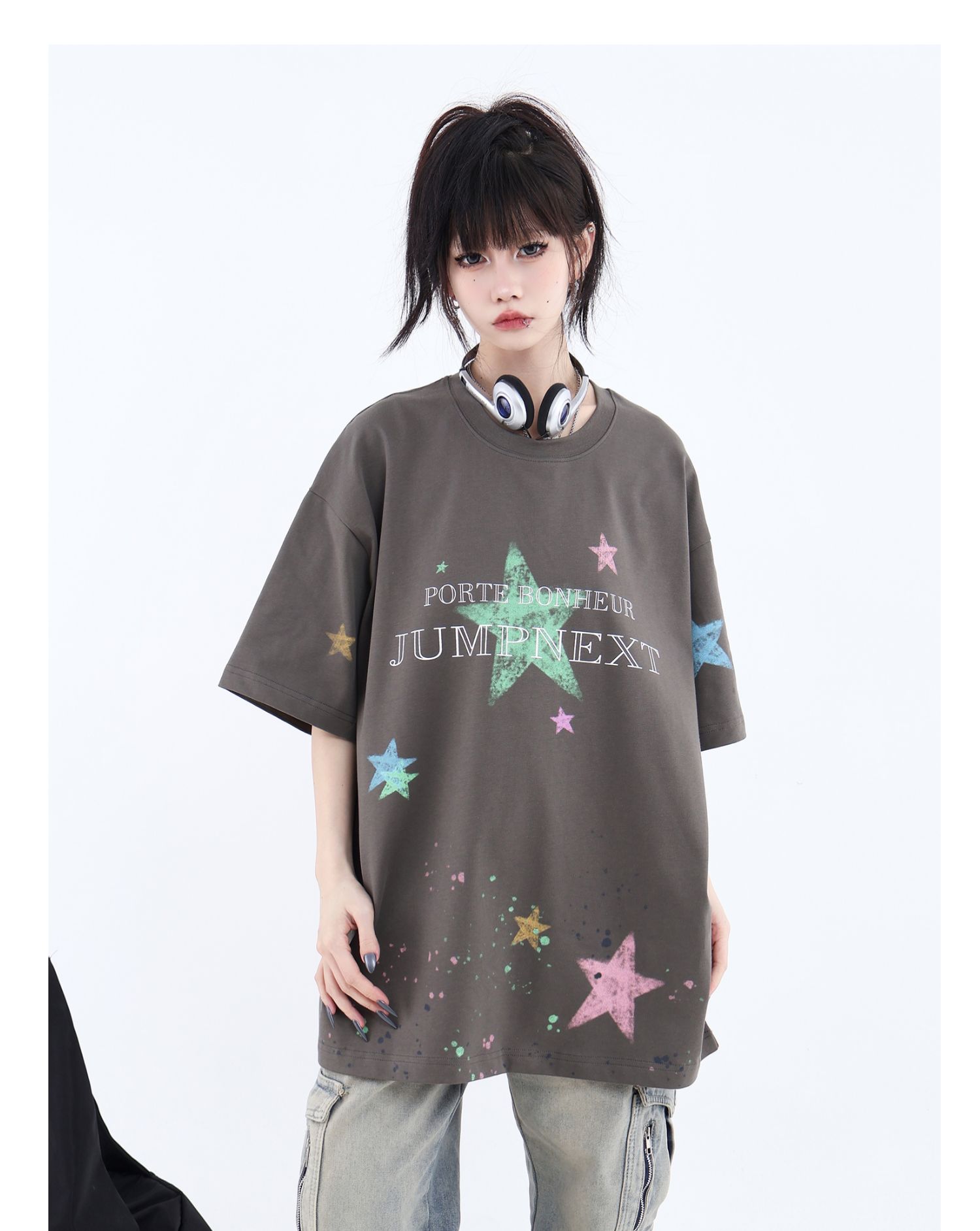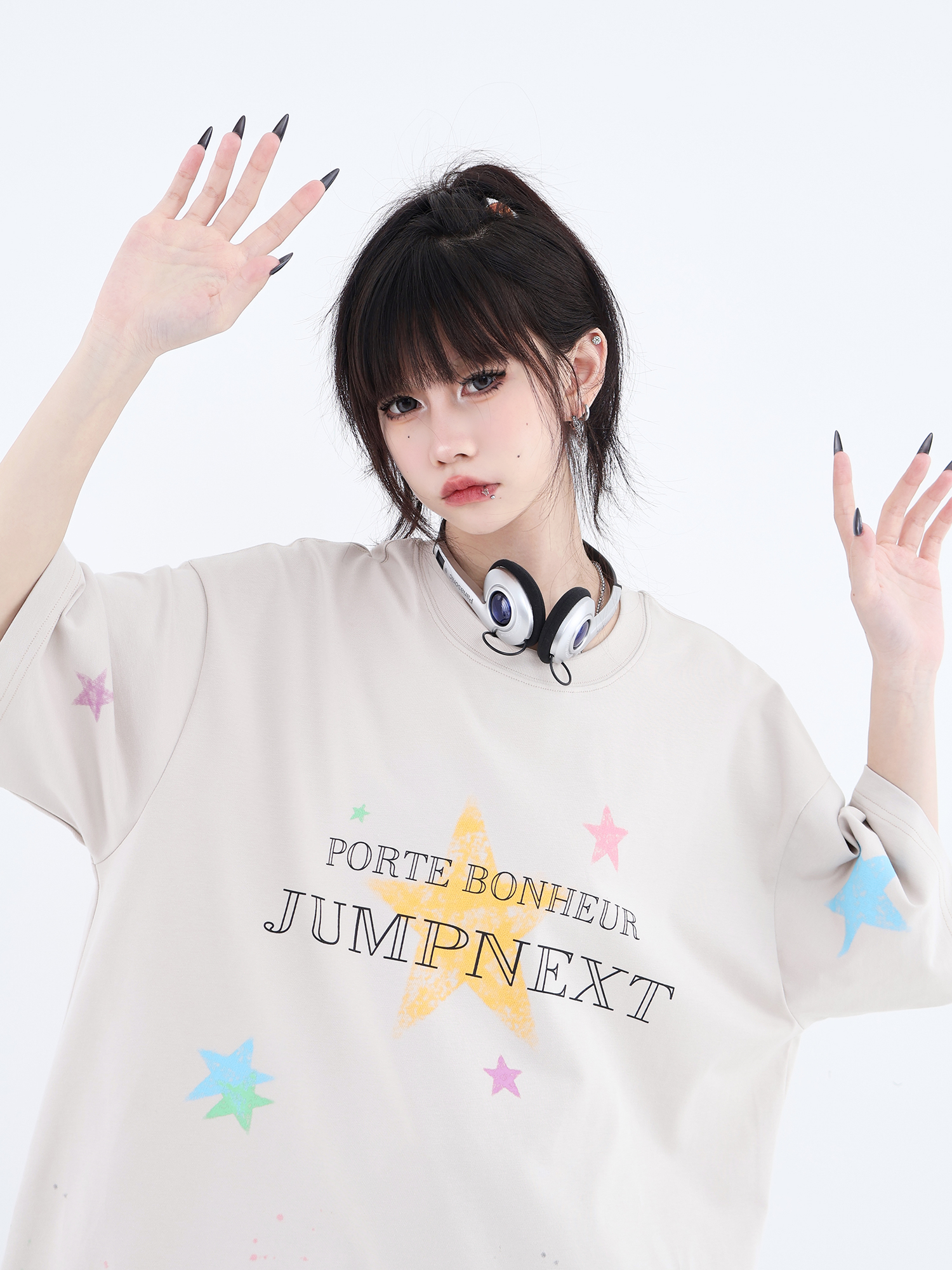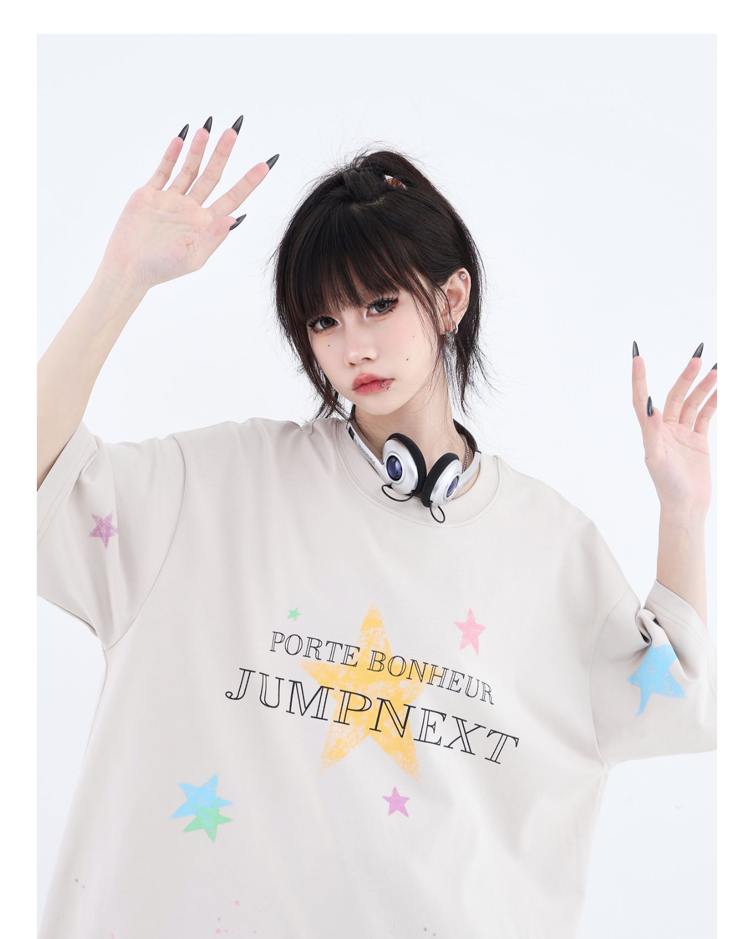 JUMPNEXT 國潮牌夏季星星印花圓領短袖寬鬆純棉設計感小眾情侶T恤