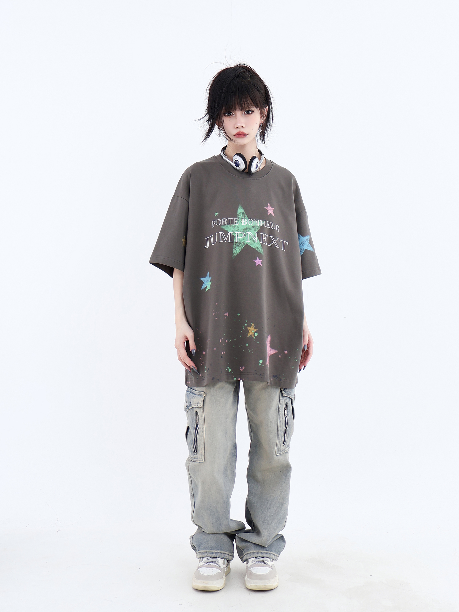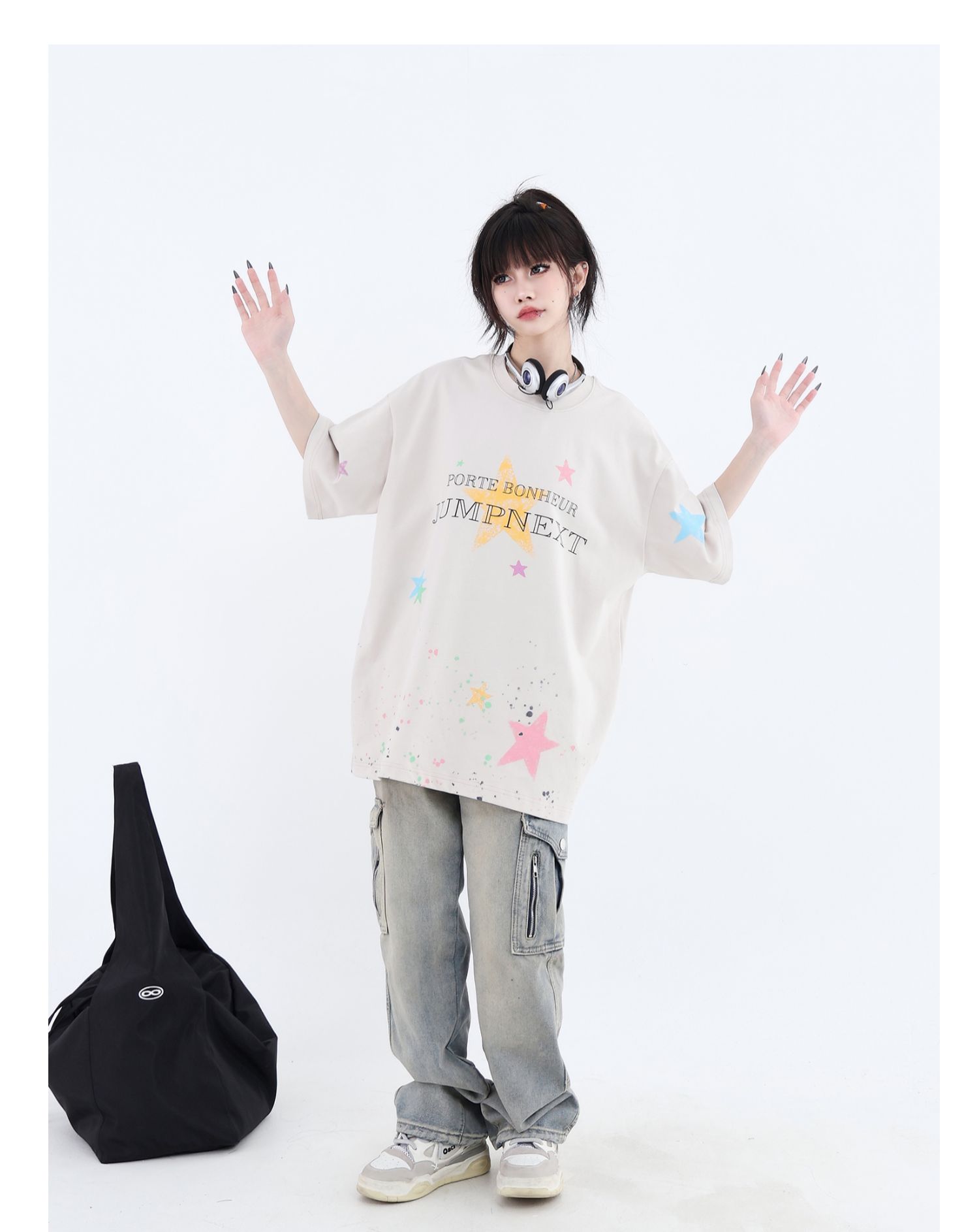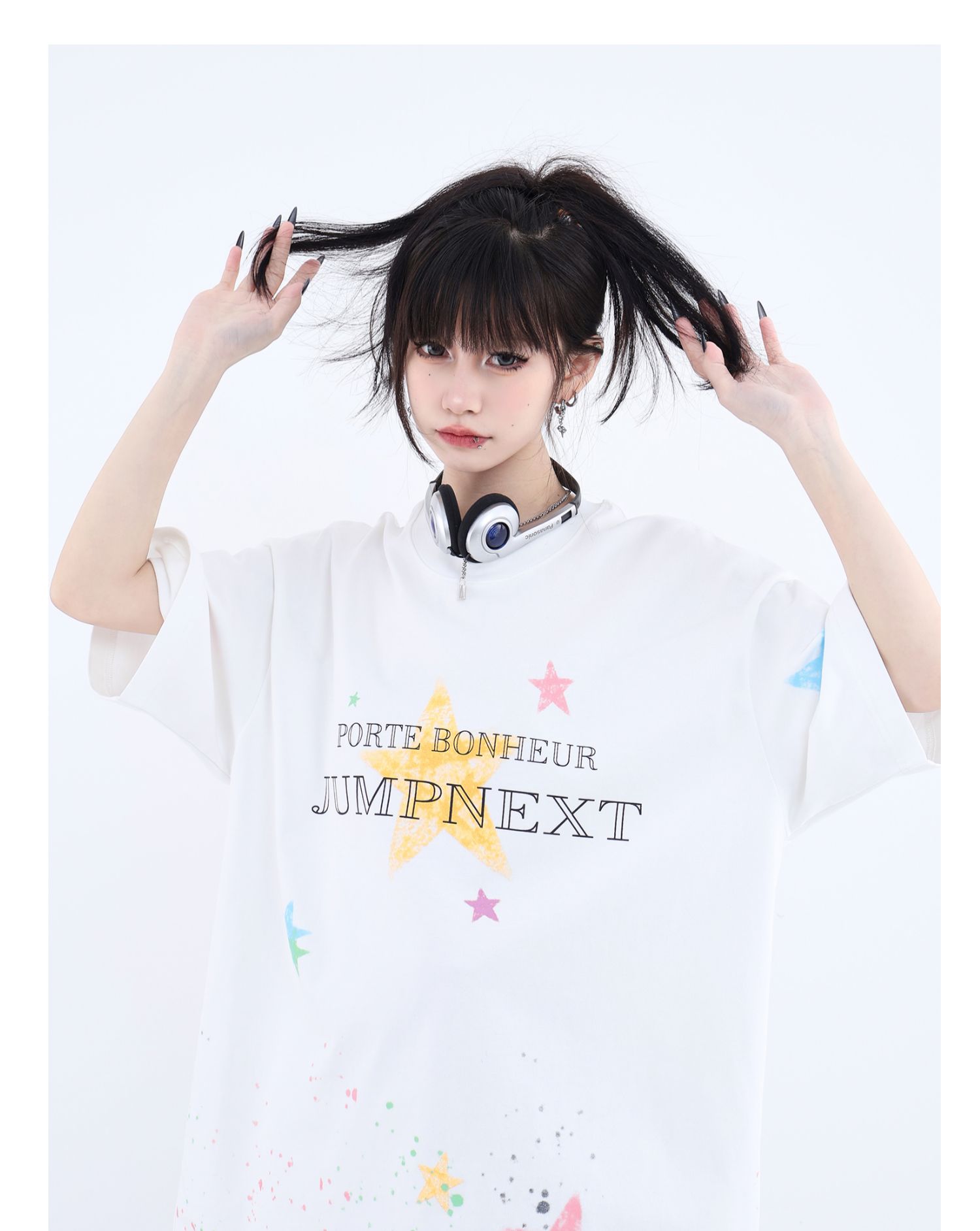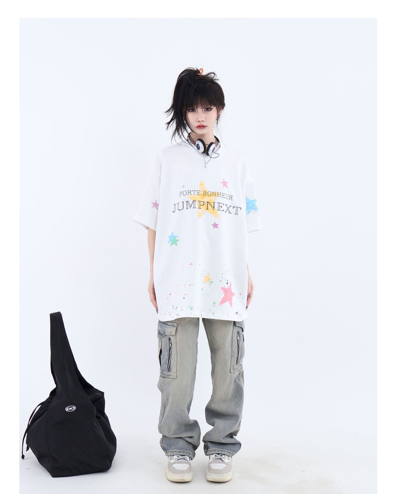 JUMPNEXT 國潮牌夏季星星印花圓領短袖寬鬆純棉設計感小眾情侶T恤