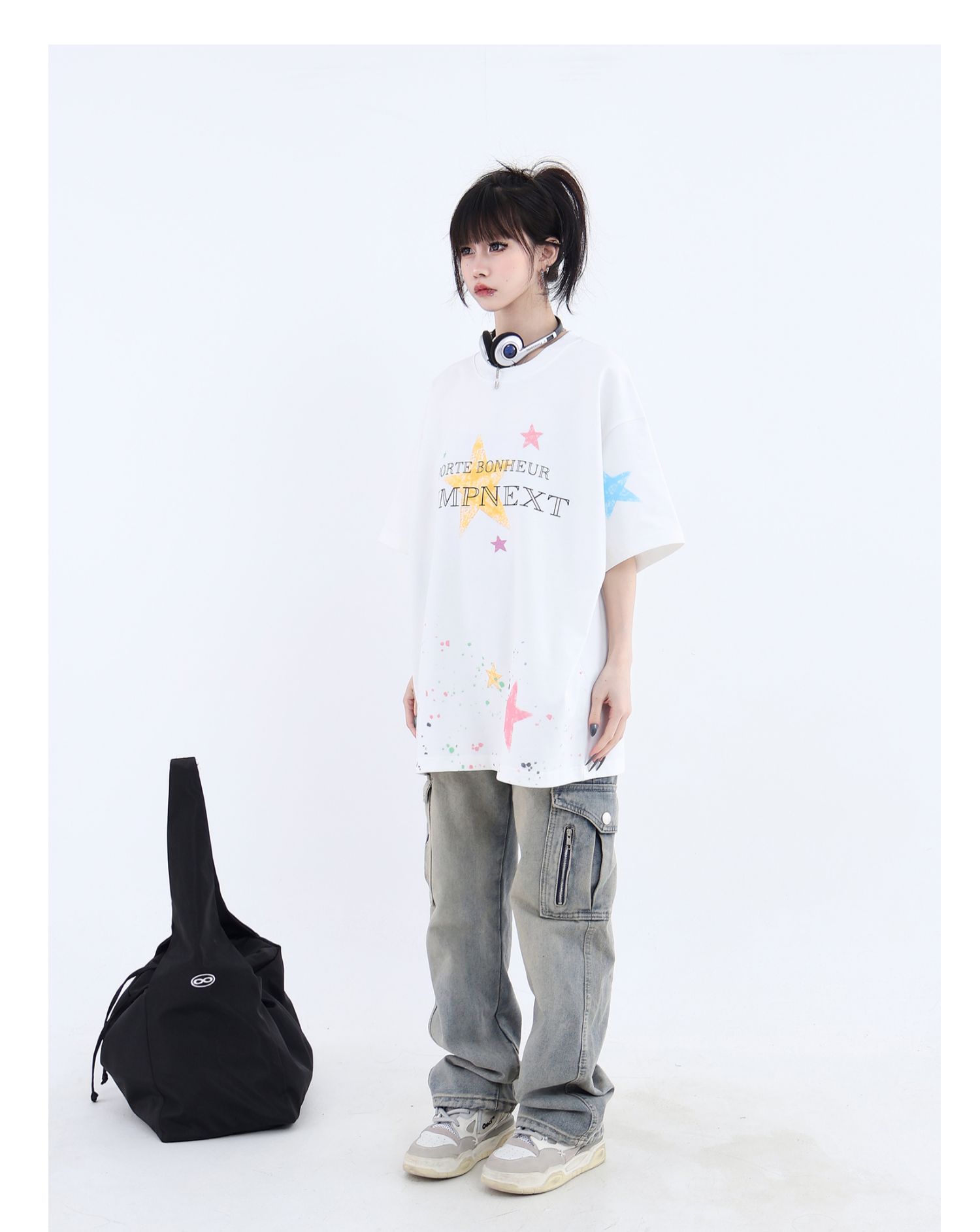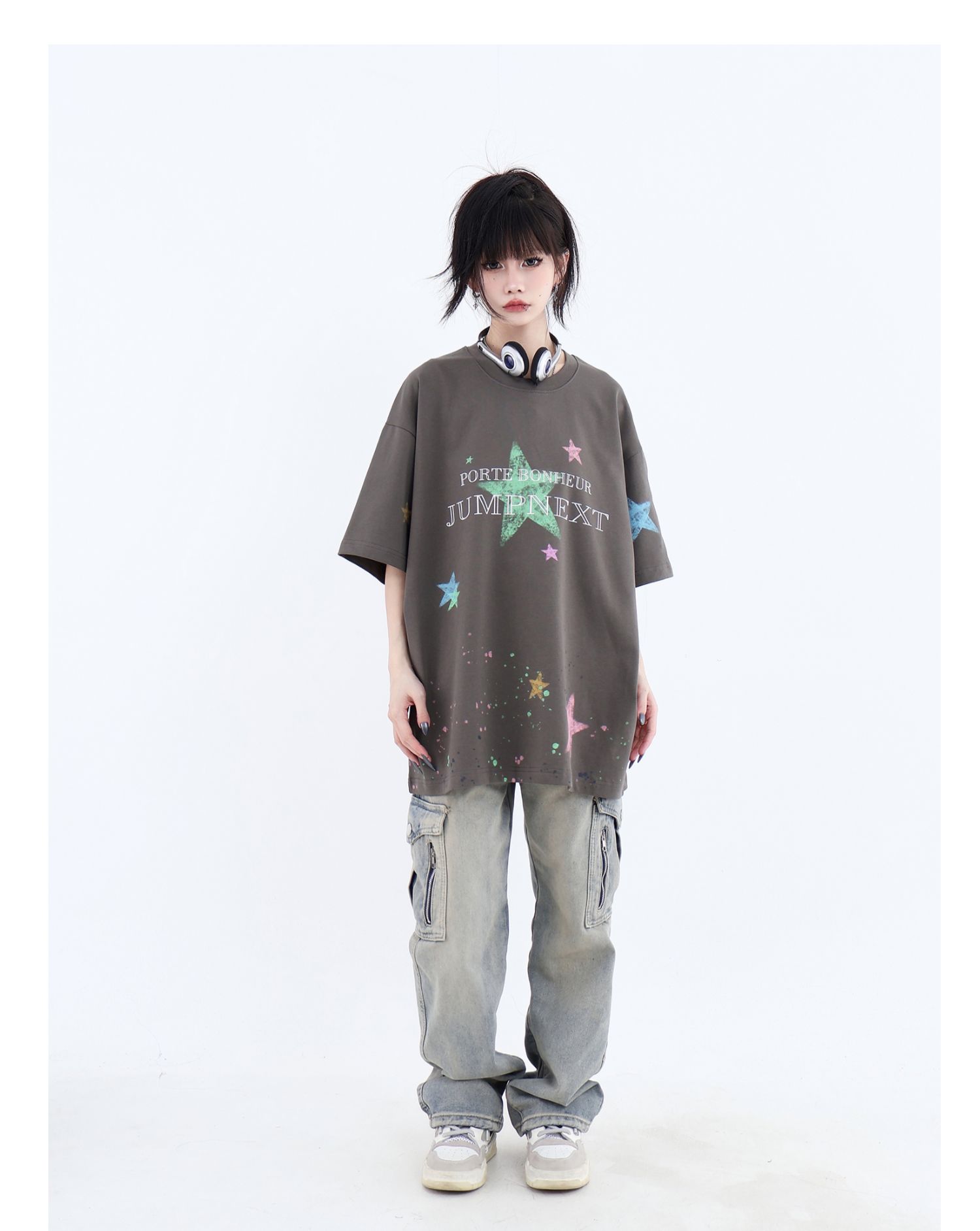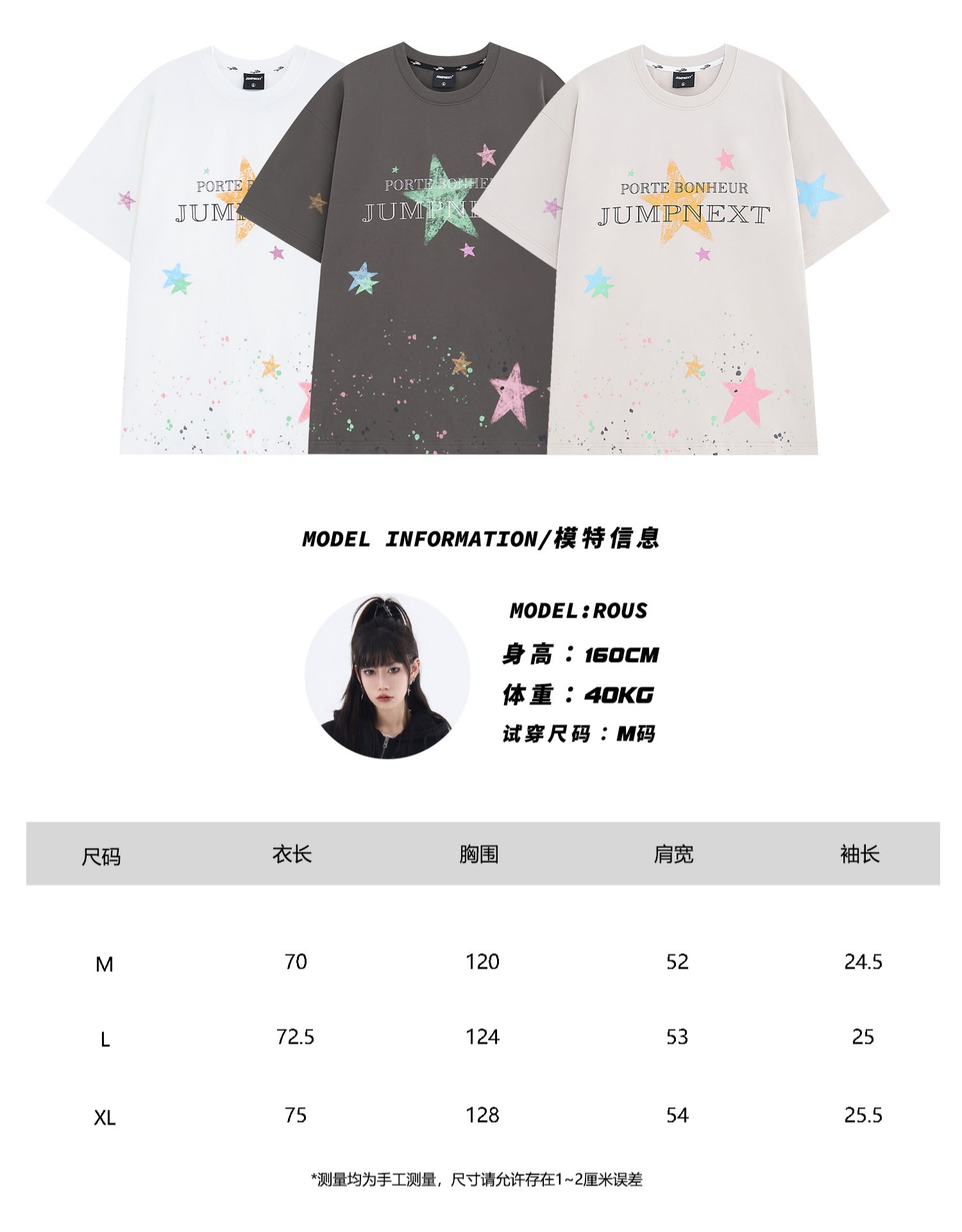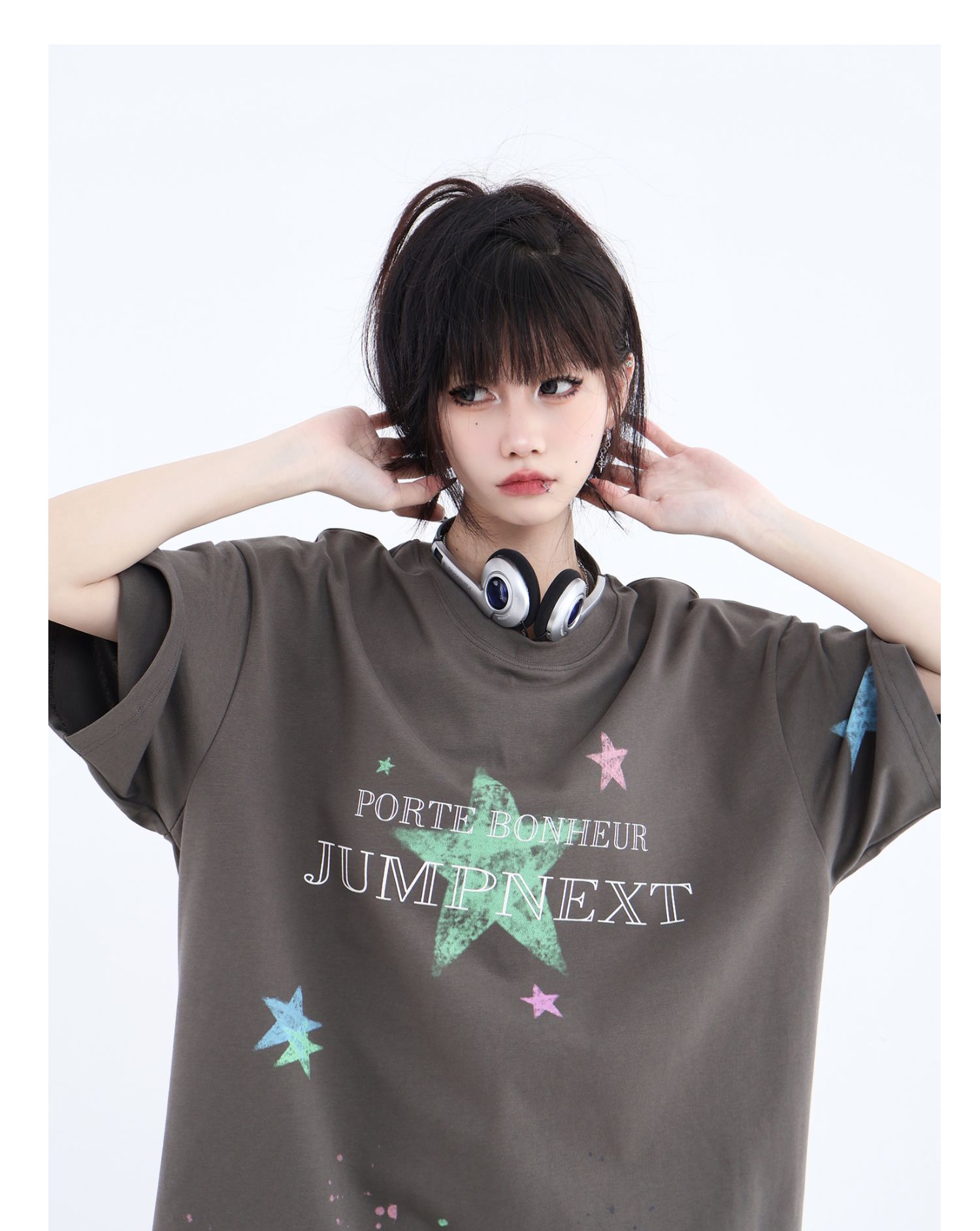 JUMPNEXT 國潮牌夏季星星印花圓領短袖寬鬆純棉設計感小眾情侶T恤
