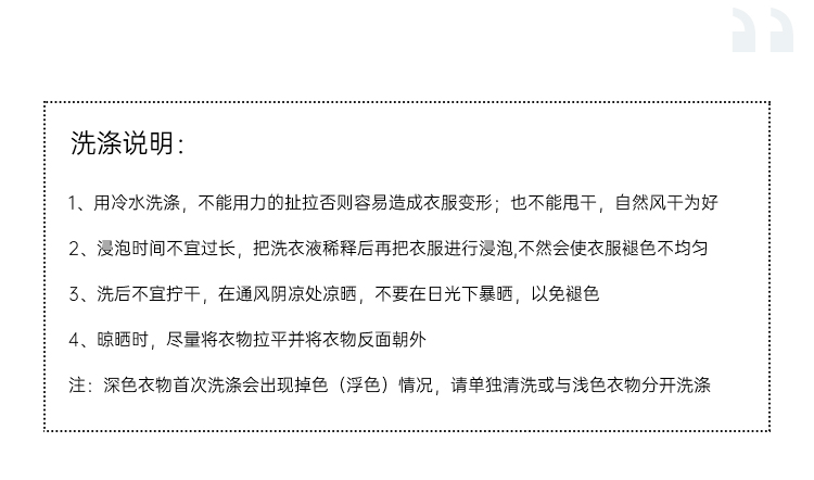 平铺晾晒 轻柔手洗 不可长时间浸泡 深浅色衣服分开洗