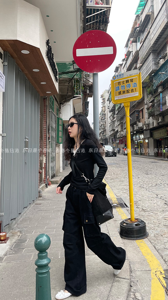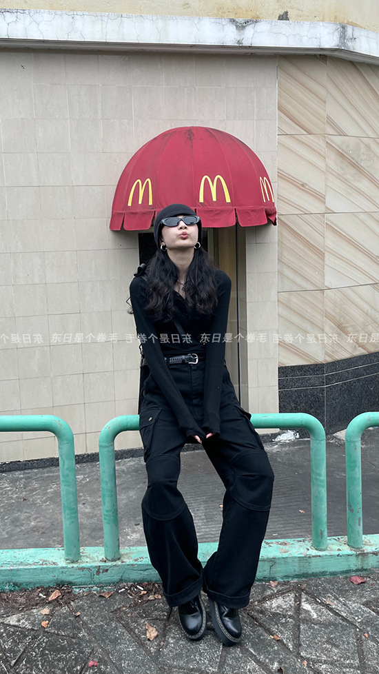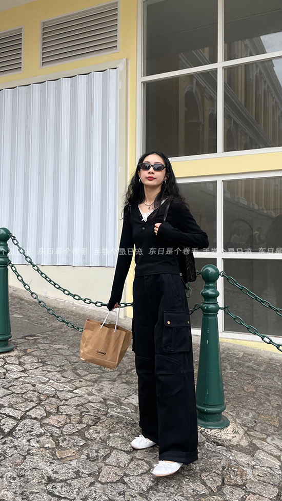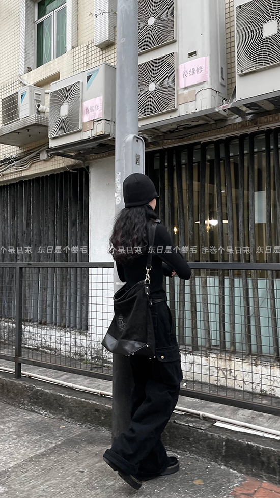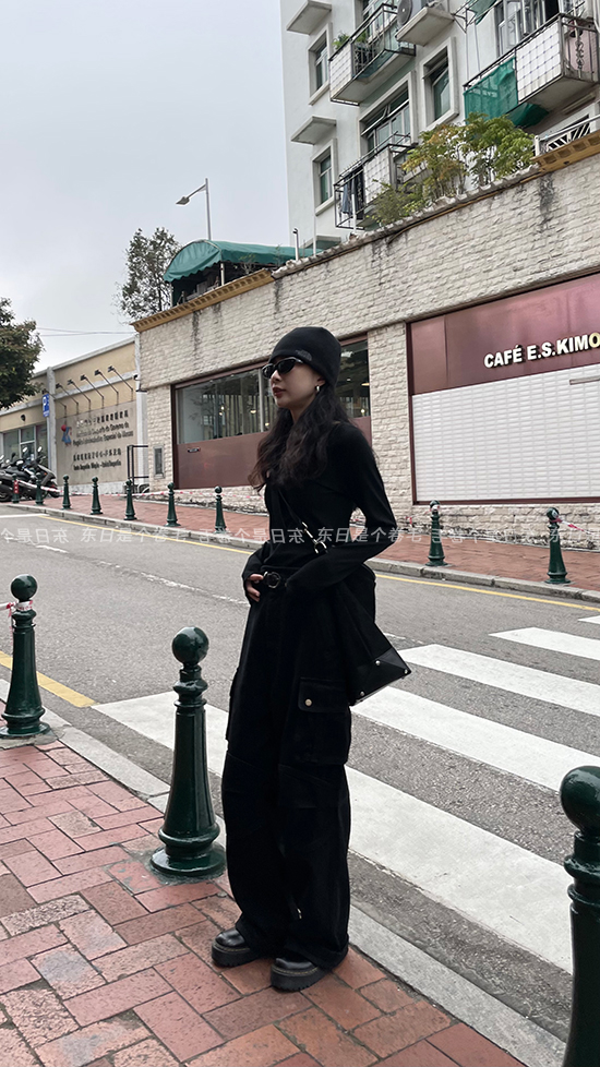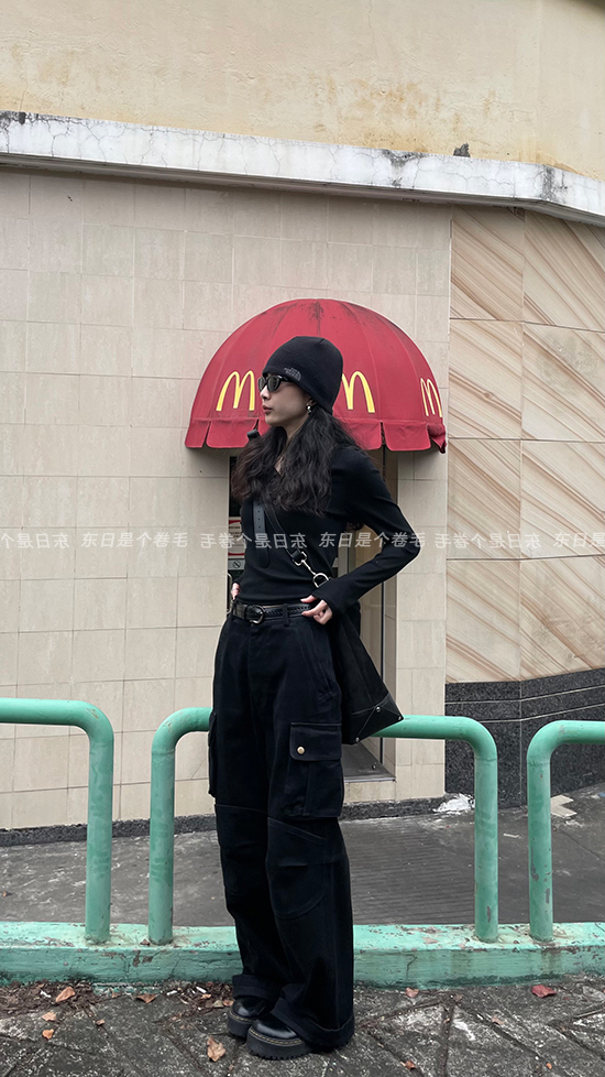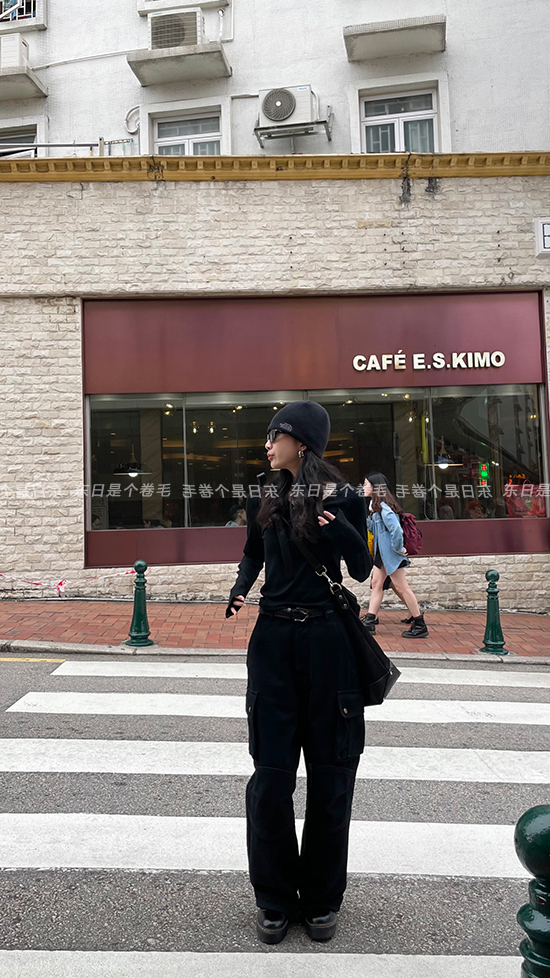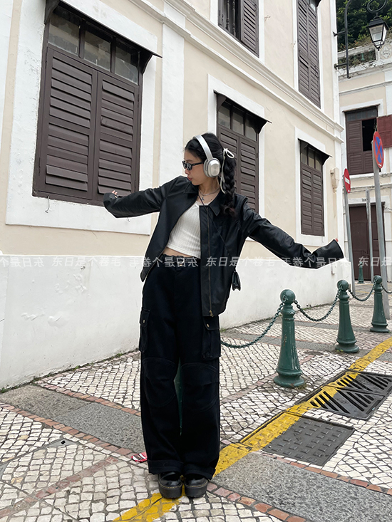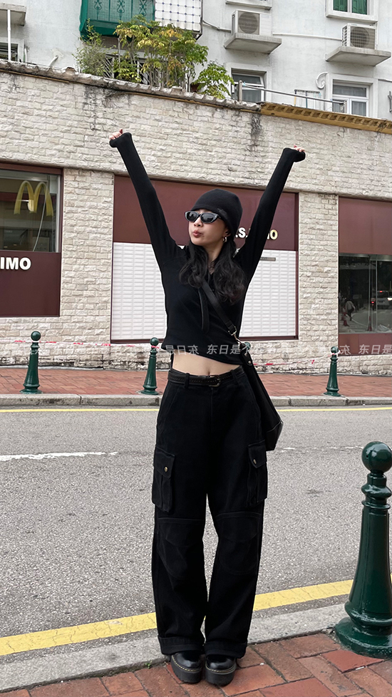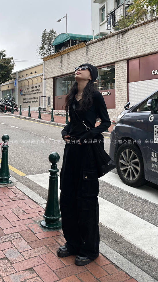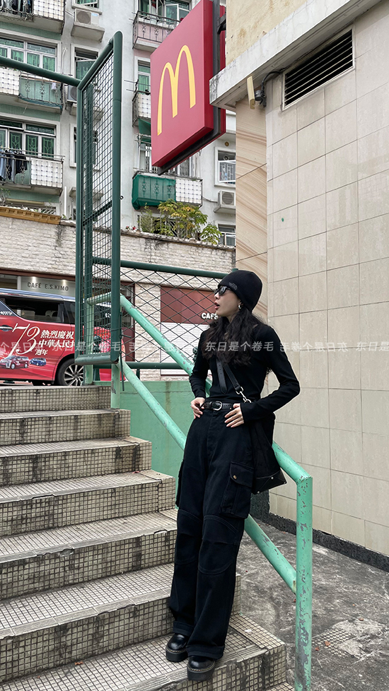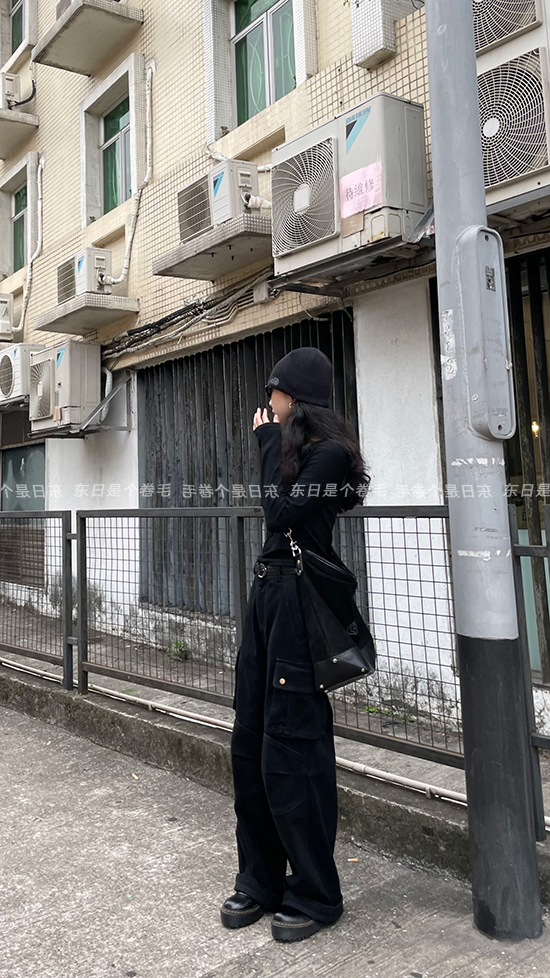 東日是個捲毛 曼切斯特 黑色直筒闊腿工裝褲女春寬鬆百搭休閒長褲