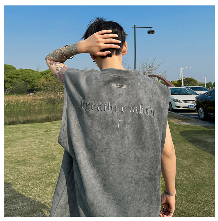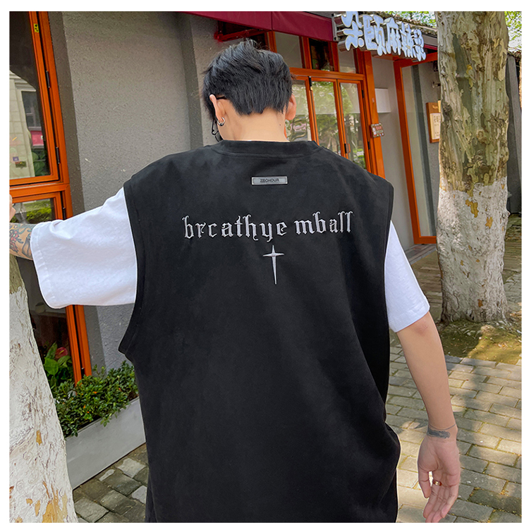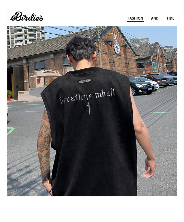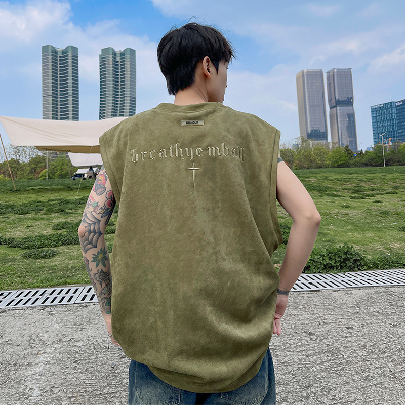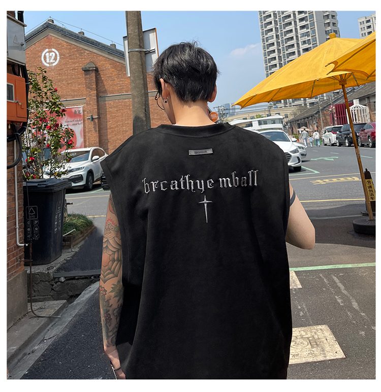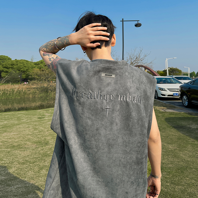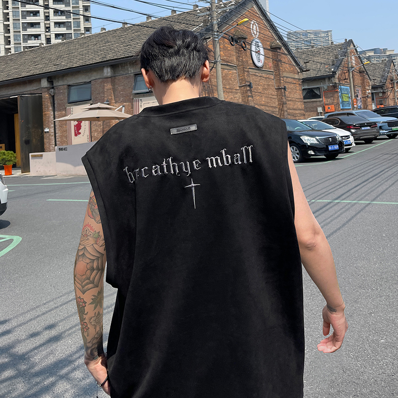 黑色麂皮絨刺繡背心美式高街重磅無袖t袖男cleanfit夏季上衣馬甲