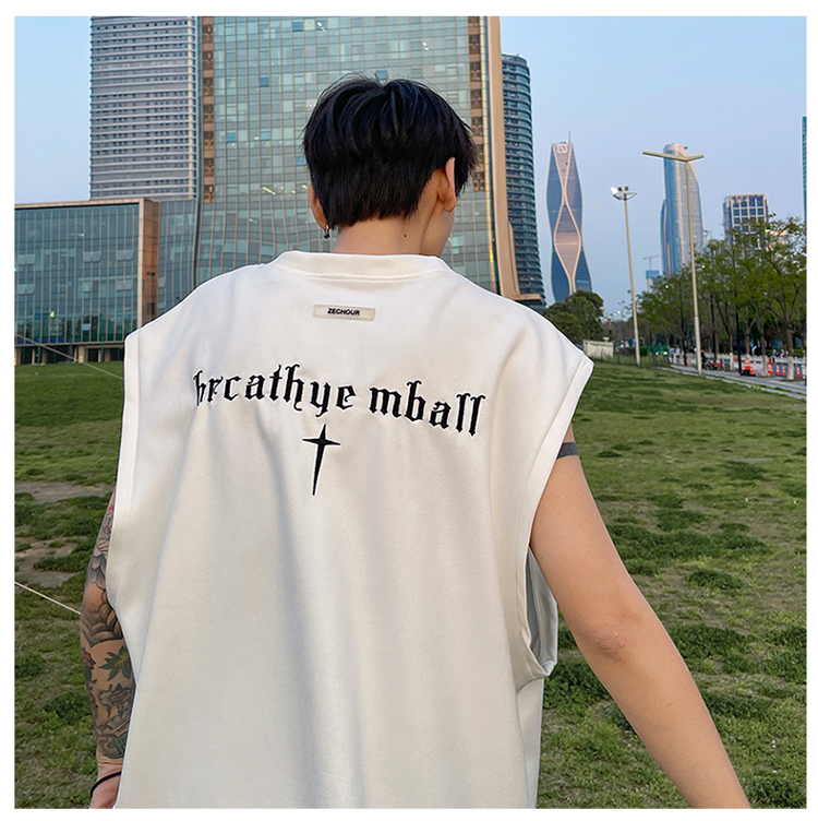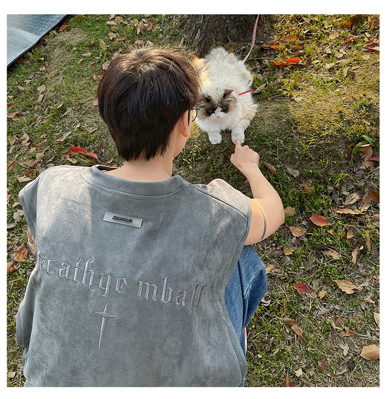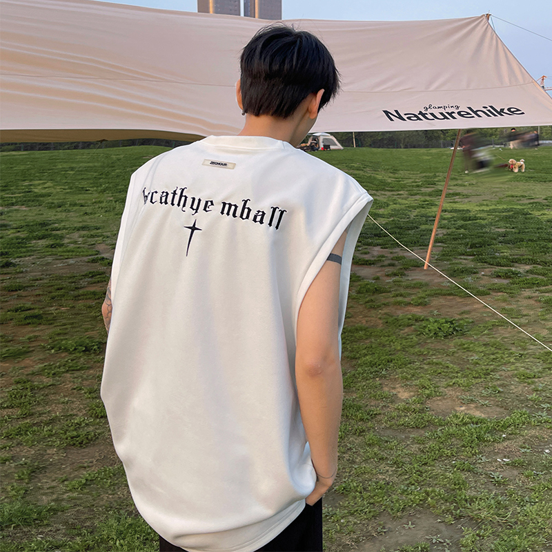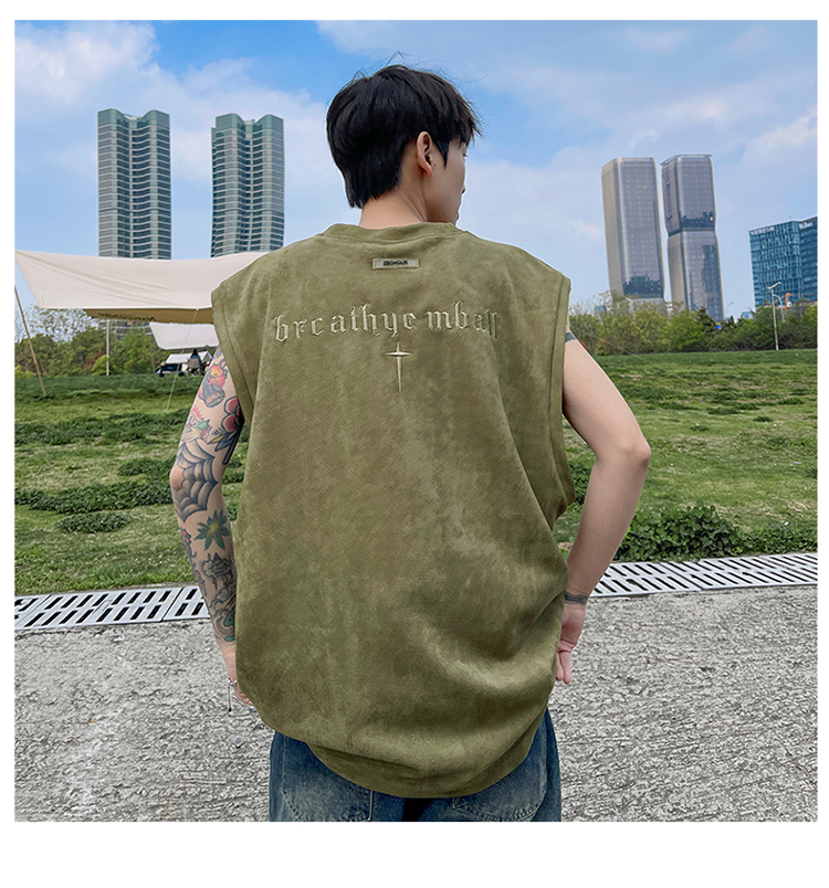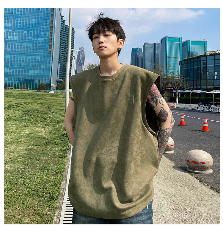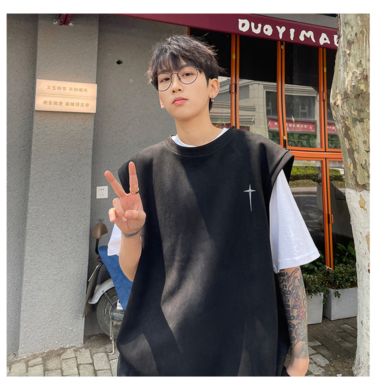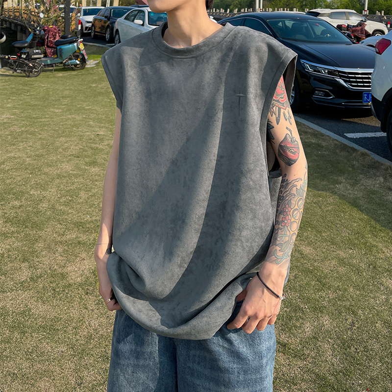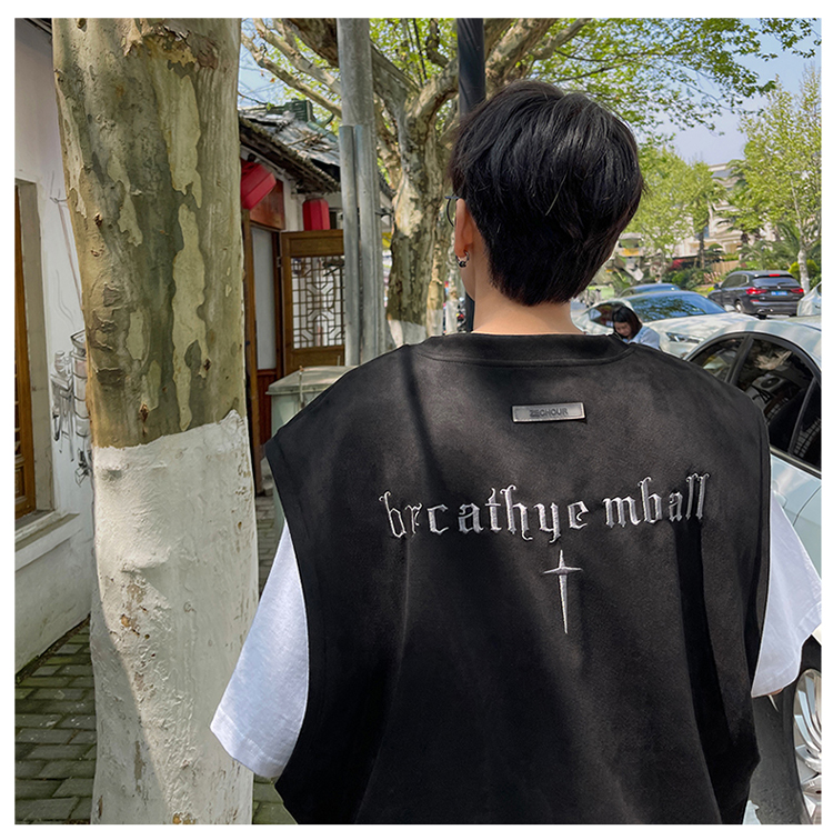 黑色麂皮絨刺繡背心美式高街重磅無袖t袖男cleanfit夏季上衣馬甲