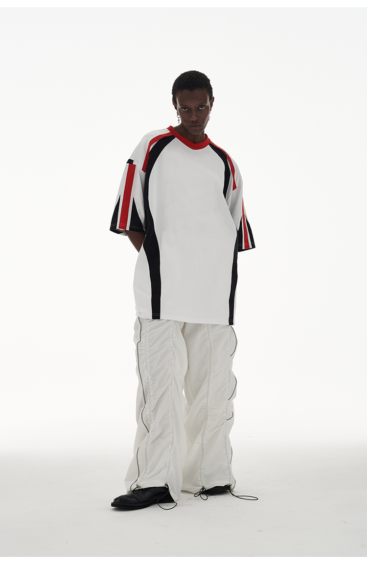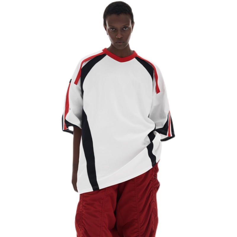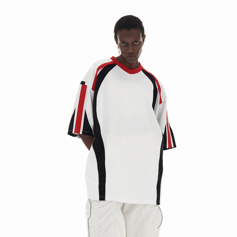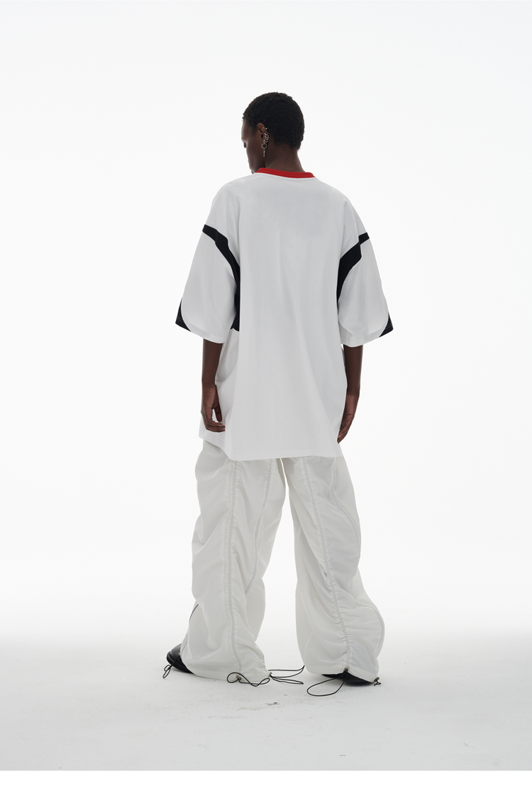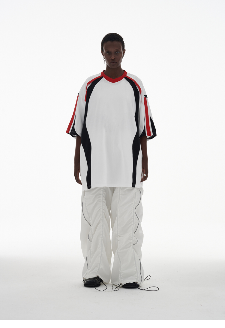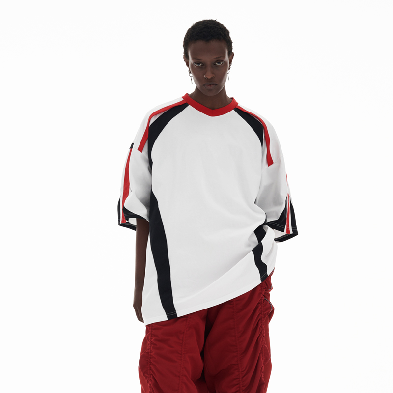 ANTERIOR LOVED 撞色拼接小V領結構肩機車設計感寬鬆廓形短袖