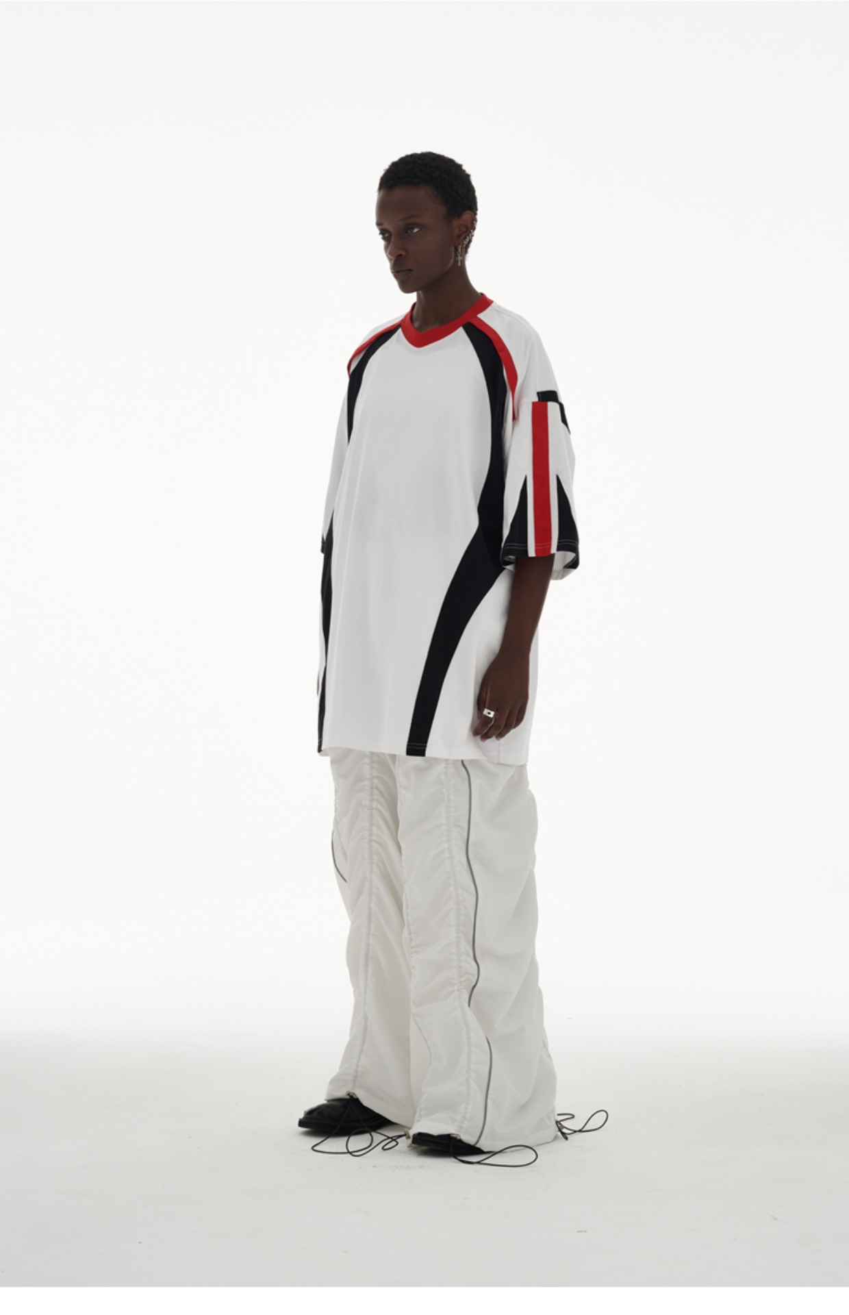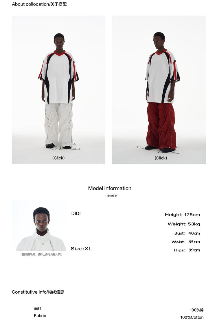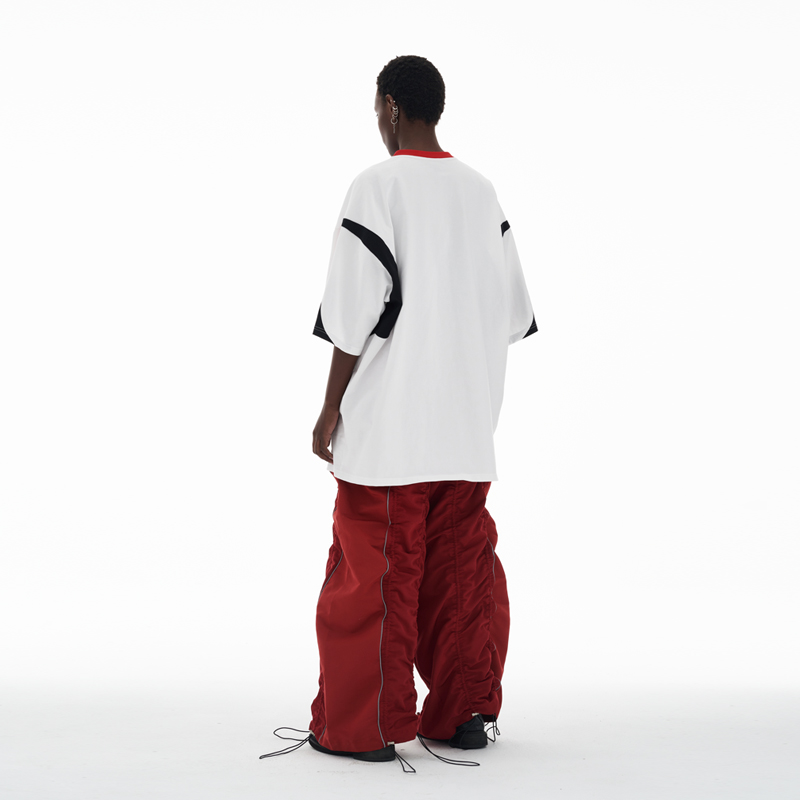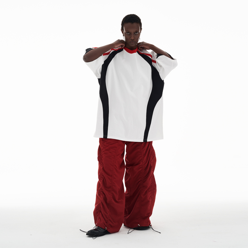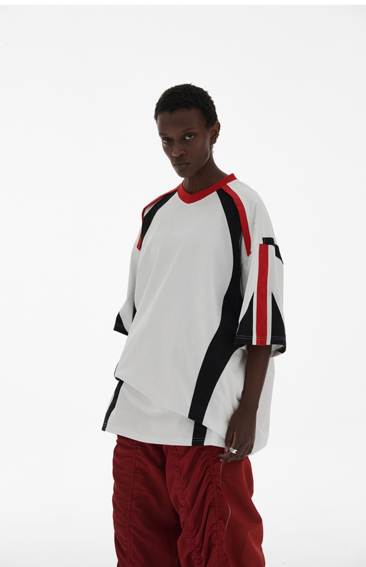 ANTERIOR LOVED 撞色拼接小V領結構肩機車設計感寬鬆廓形短袖