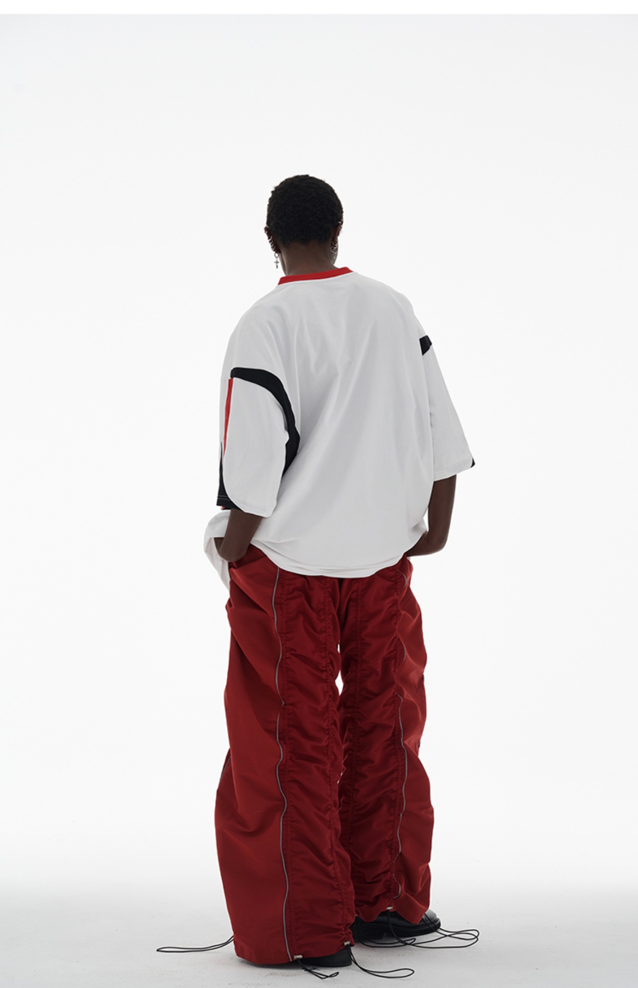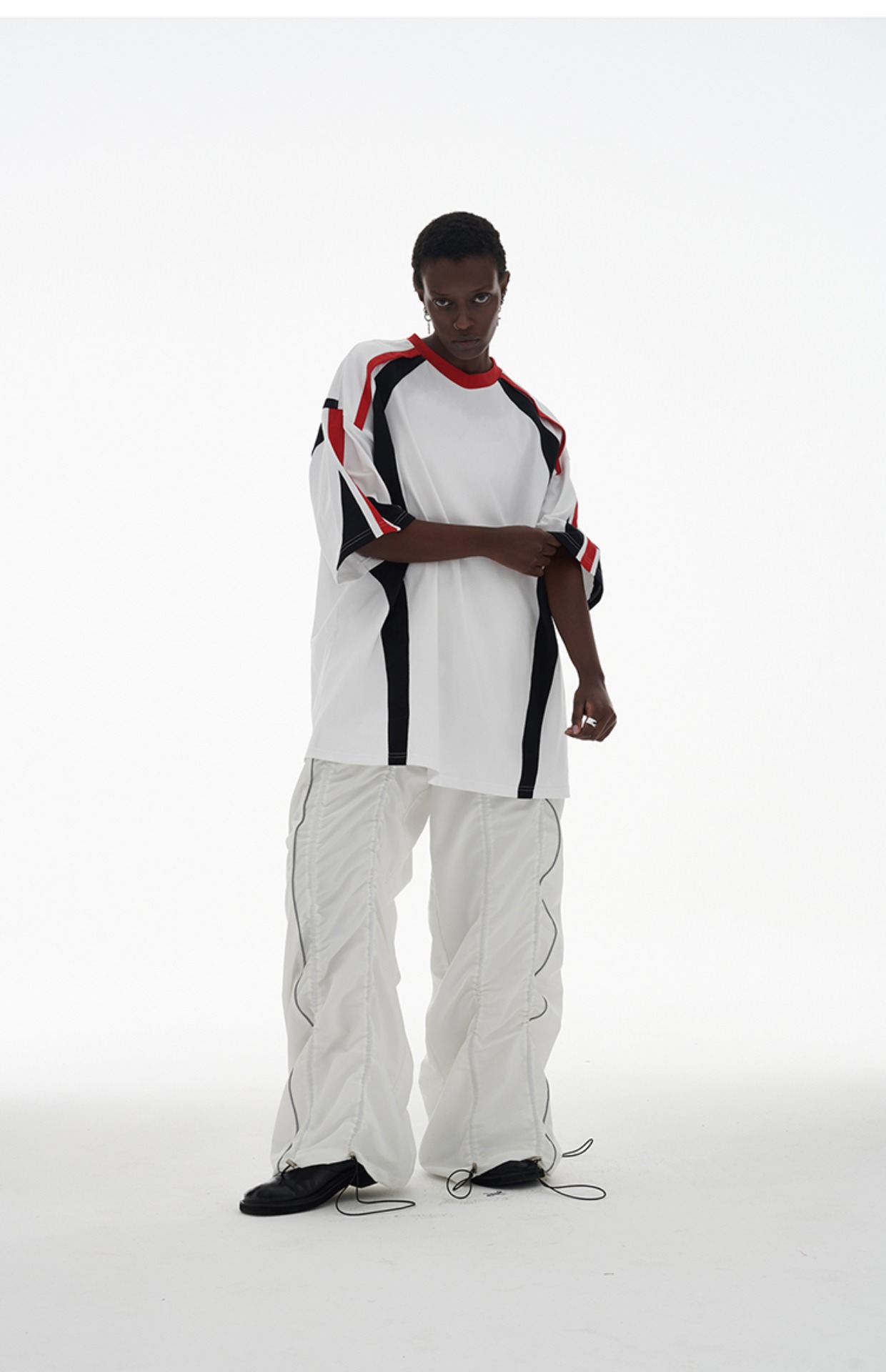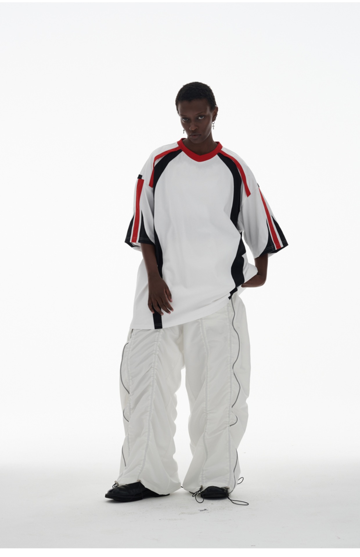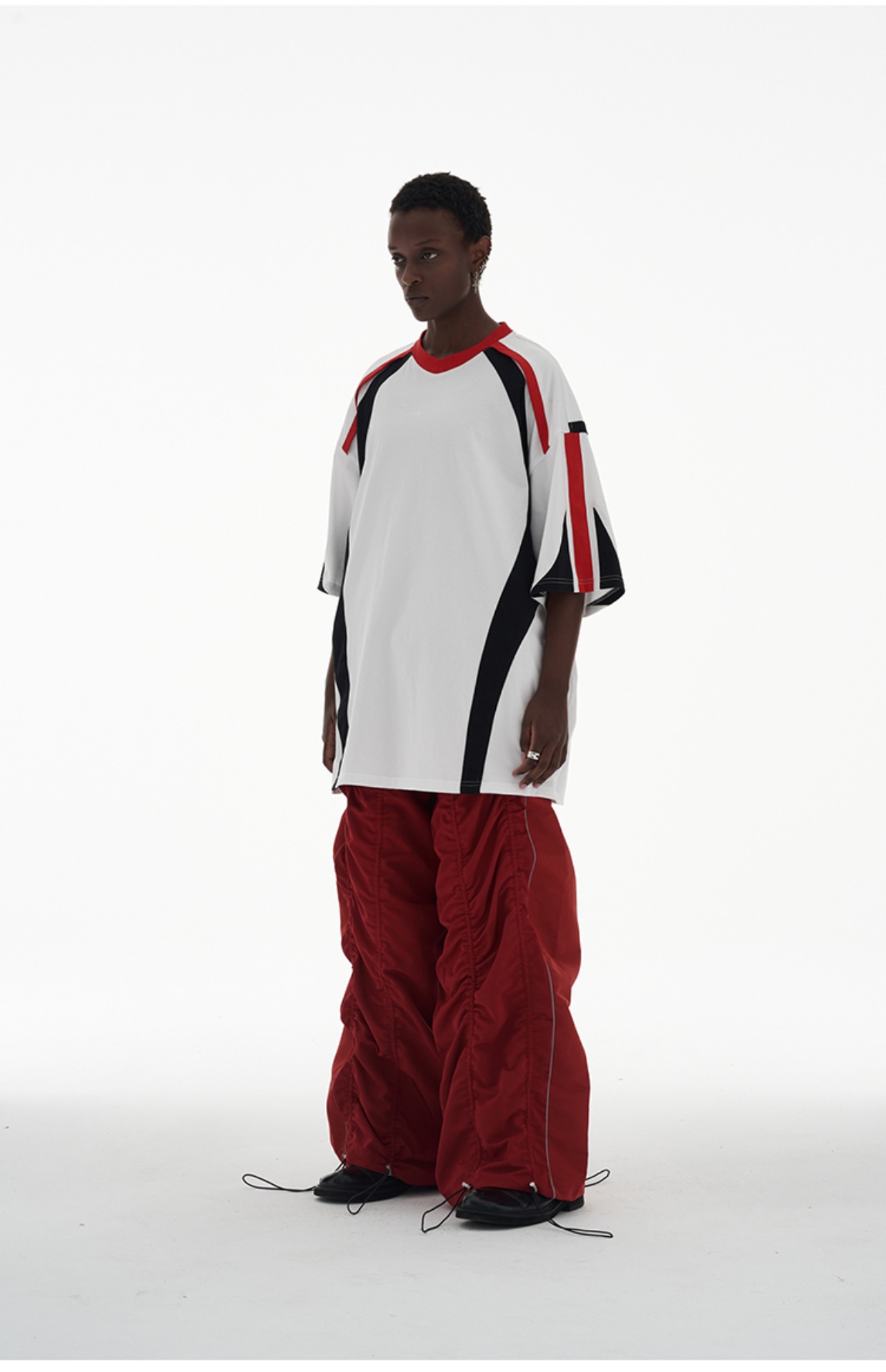 ANTERIOR LOVED 撞色拼接小V領結構肩機車設計感寬鬆廓形短袖