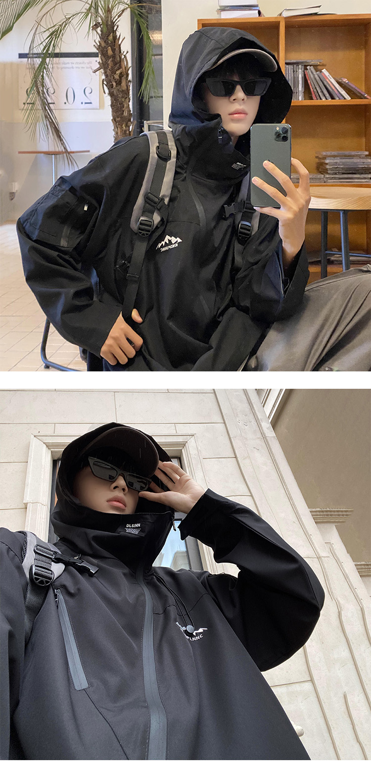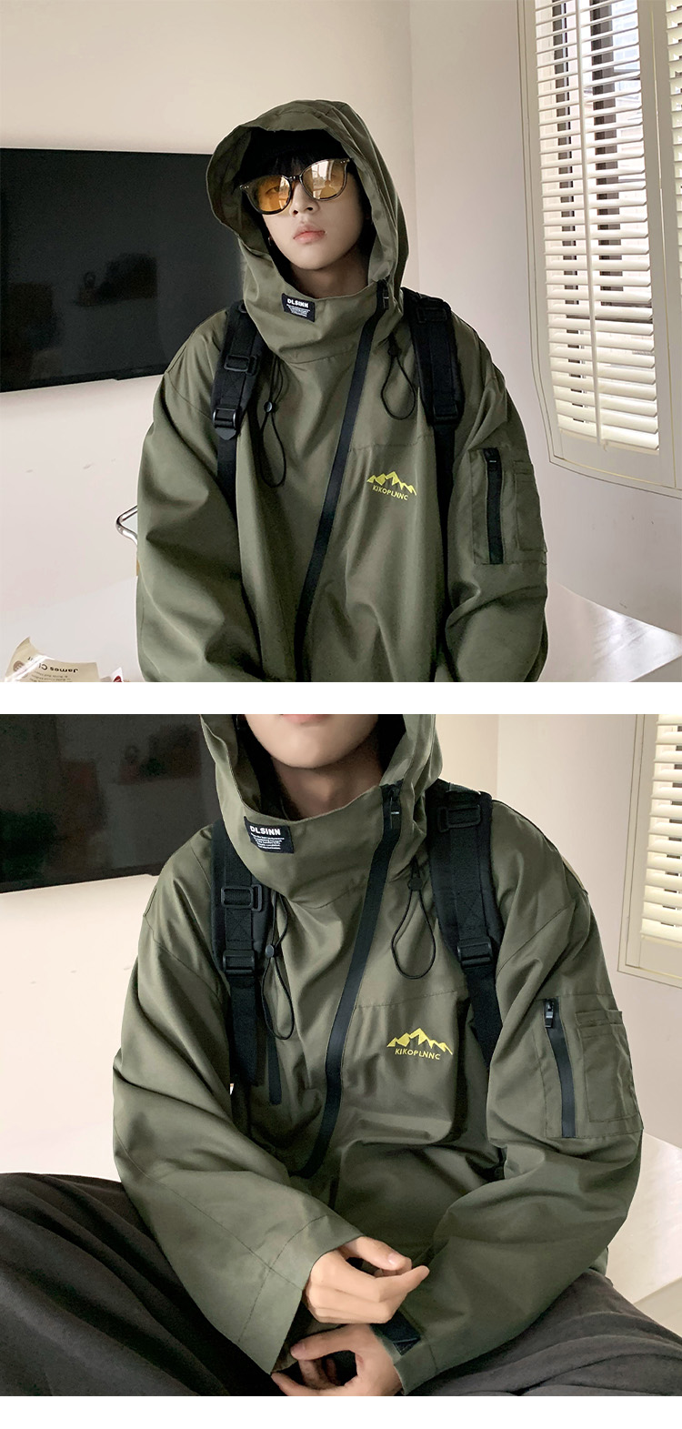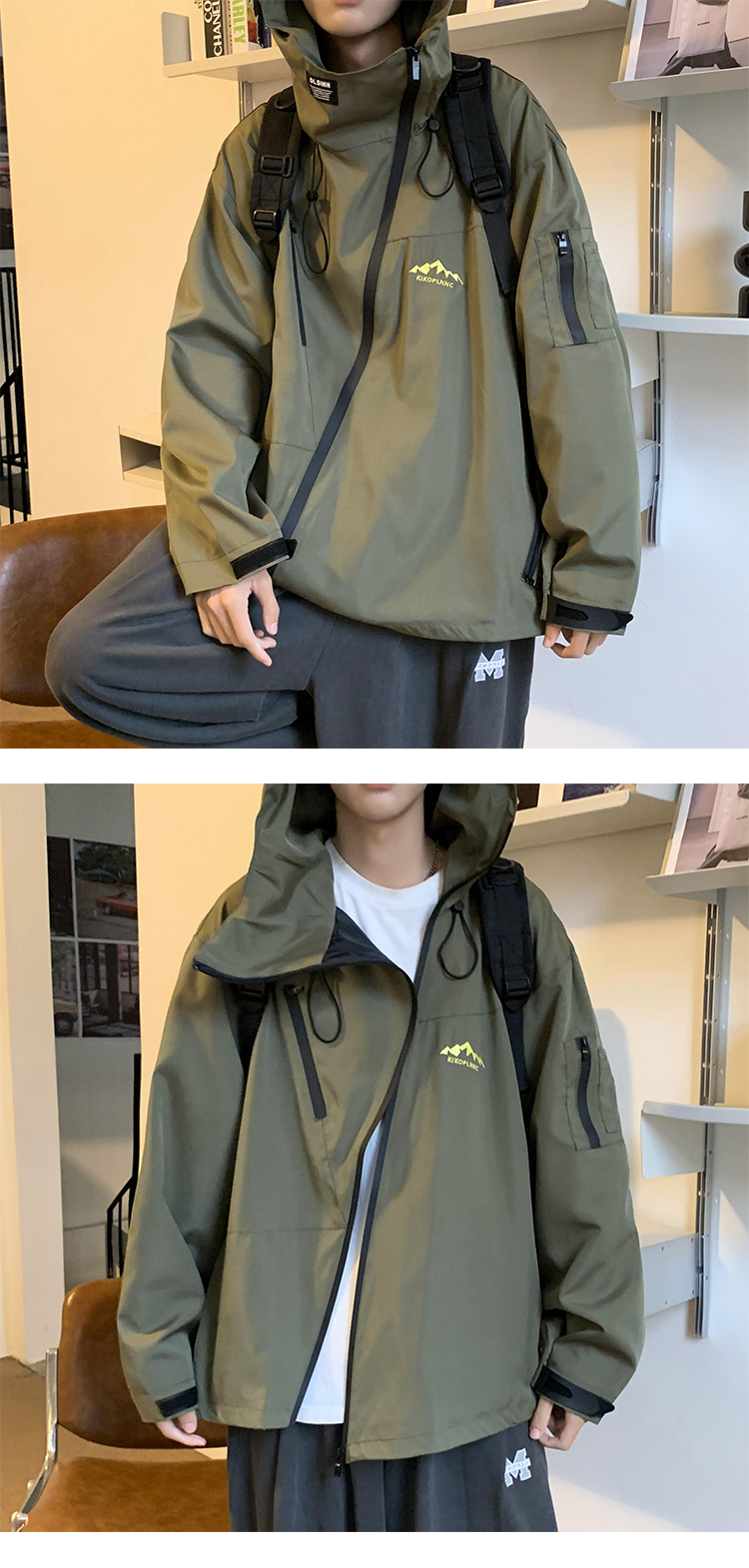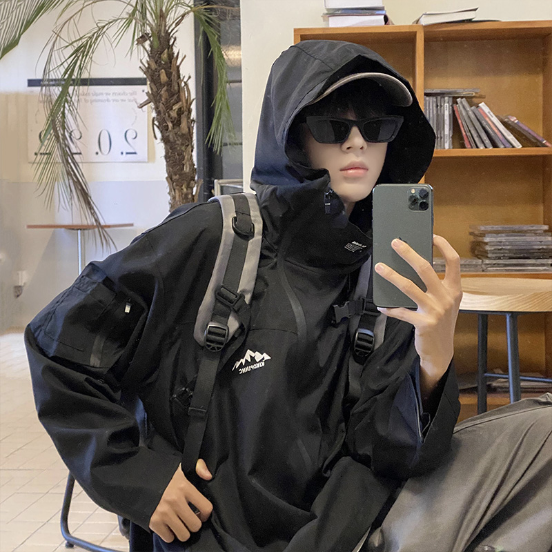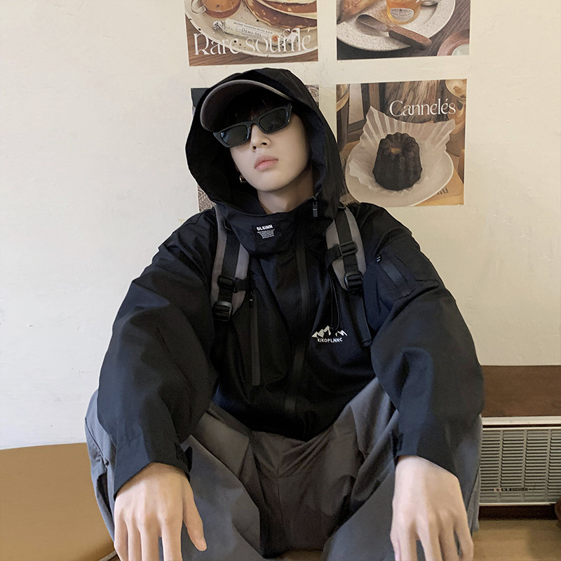 戶外騎行服vintage衝鋒衣夾克美式復古hiphop半高立領連帽外套ins