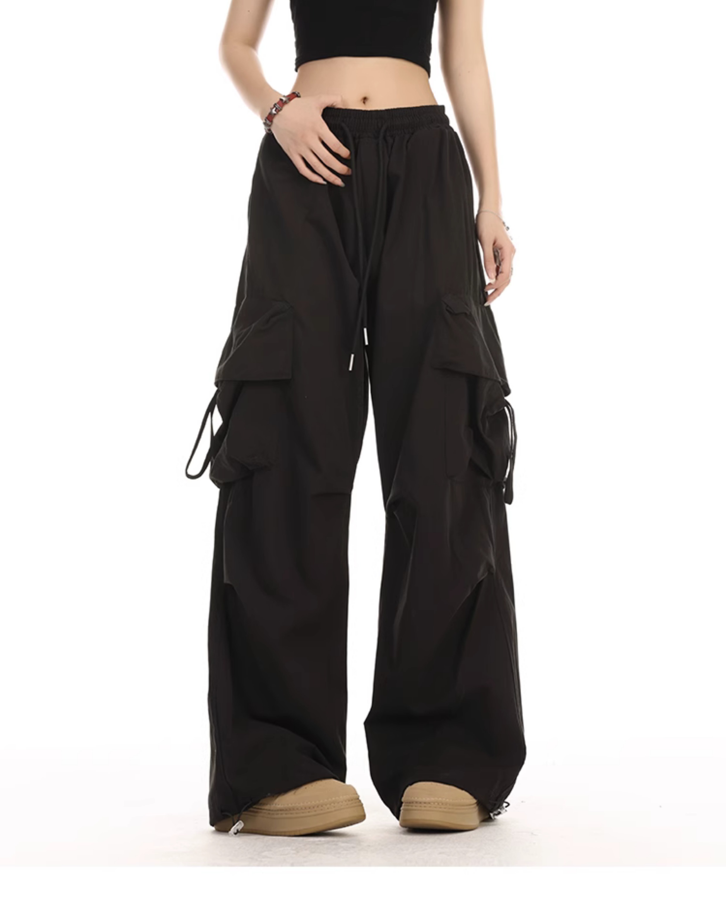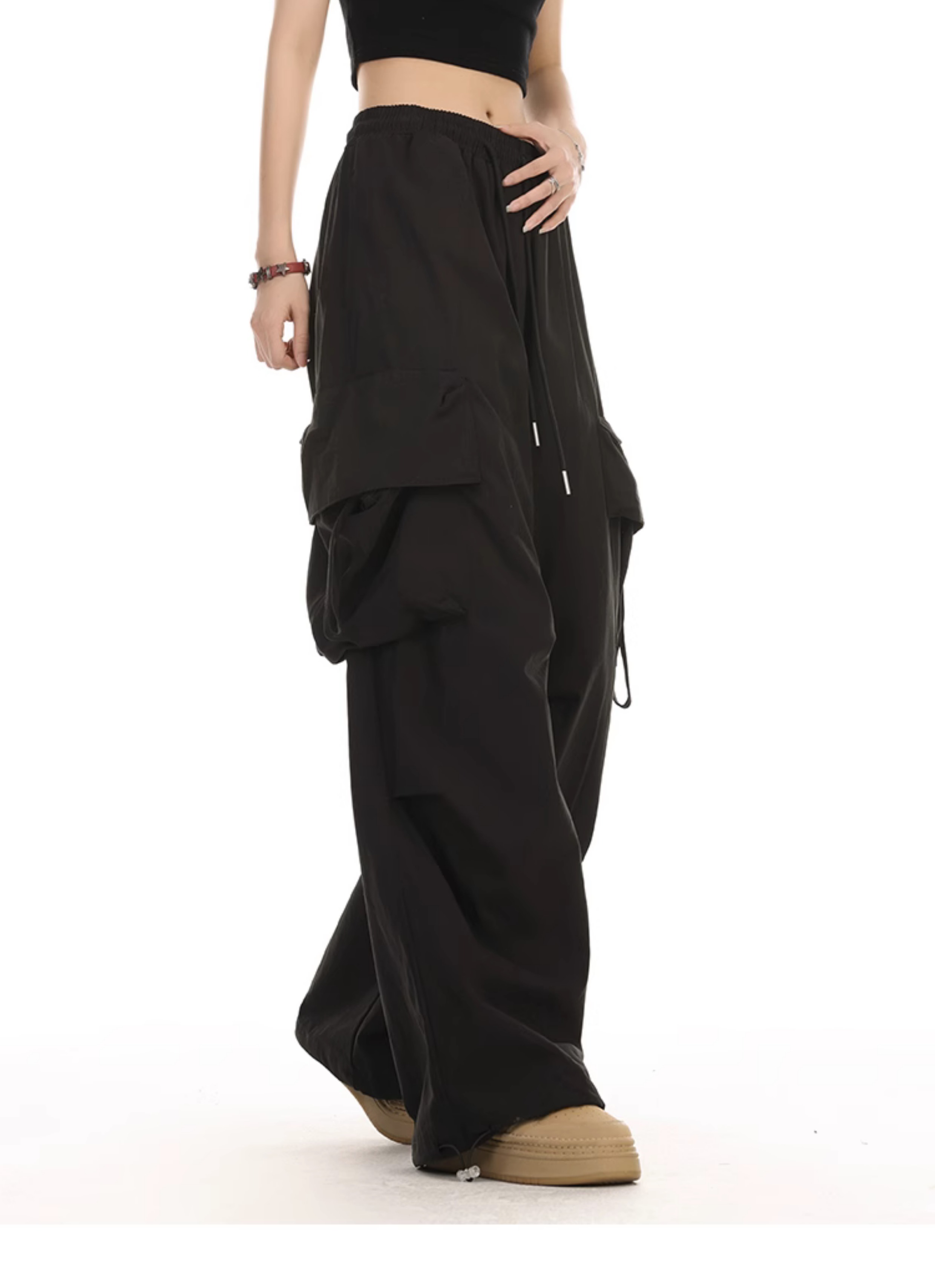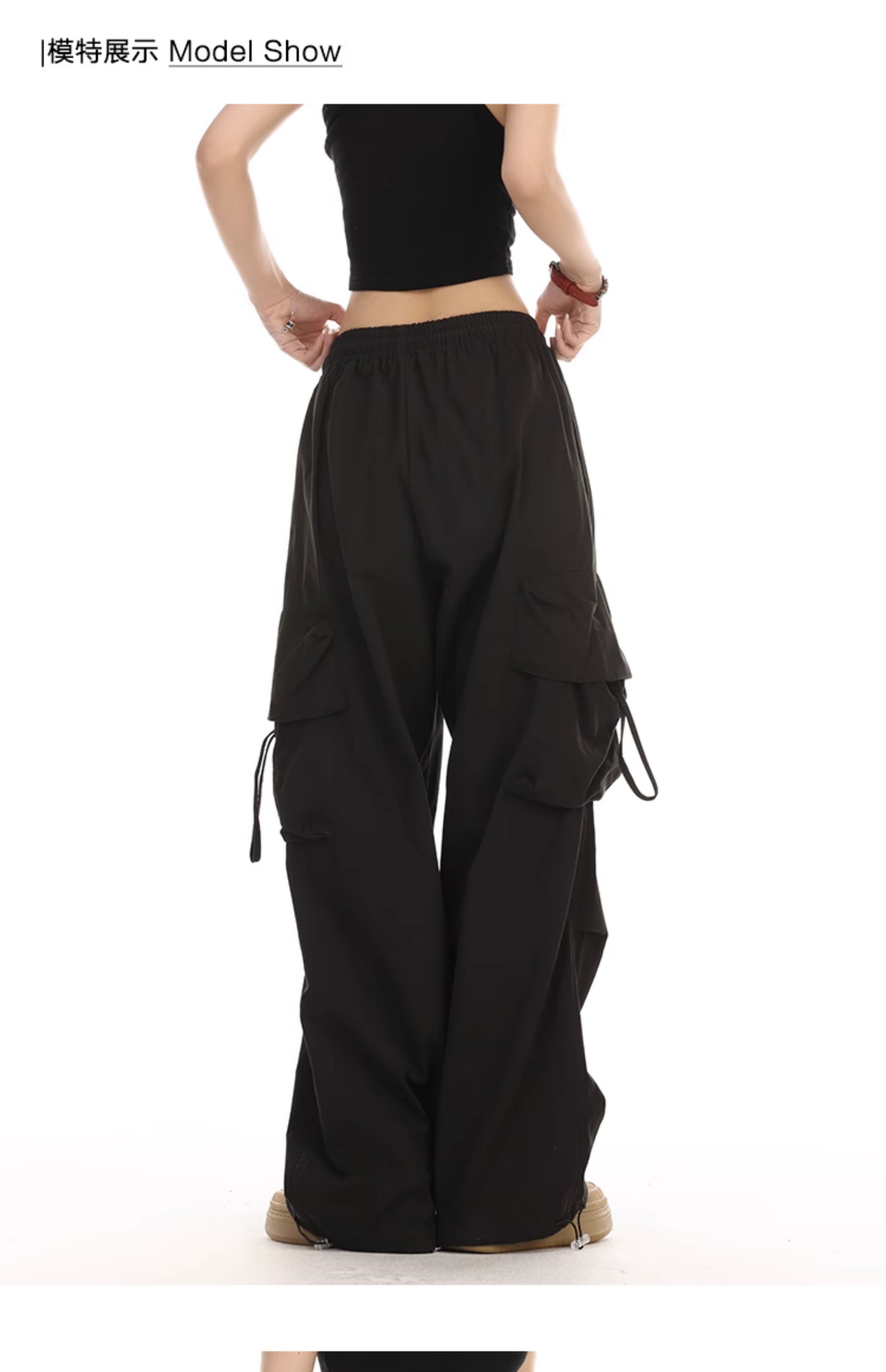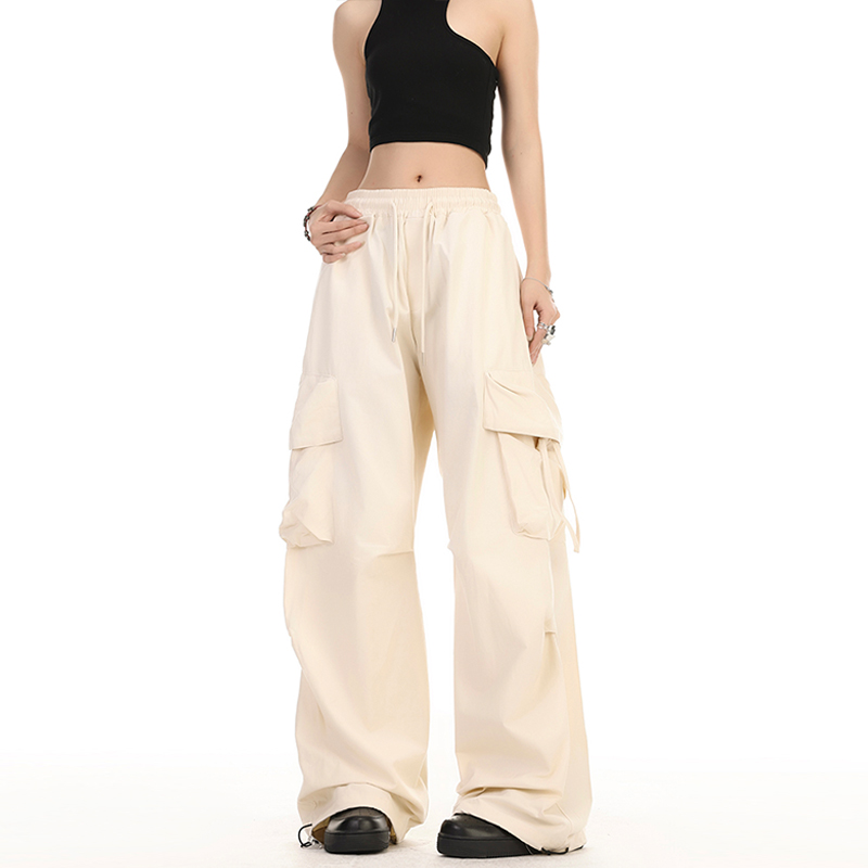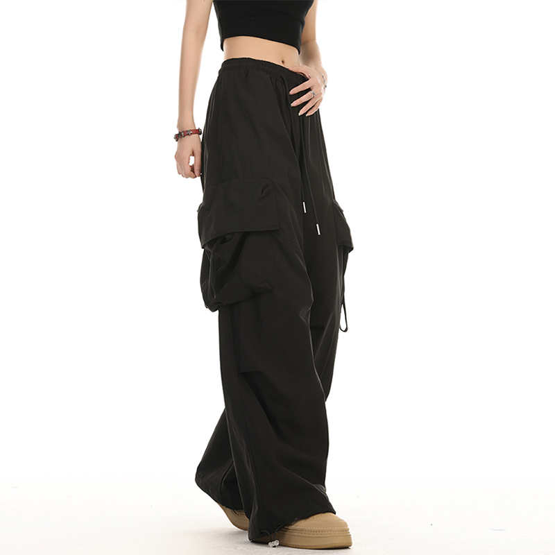 YOOTDS美式街頭黑色工裝褲子夏女薄款寬鬆休閒嘻哈闊腿垂感長褲
