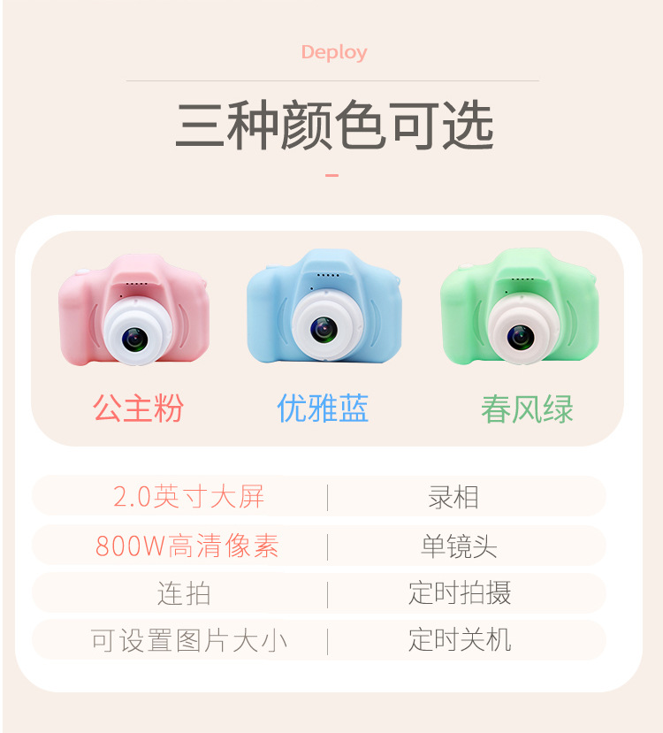 机身颜色 普清蓝色,普清绿色,普清粉色,普清单摄灰色,普清单摄黄色,高清蓝色(单摄),高清粉色(单摄),高清绿色(单摄),高清淡紫色(单摄),高清灰色(单摄),高清黄色(单摄),高清蓝色(双摄),高清粉色(双摄),高清绿色(双摄),高清淡紫色(双摄),高清深蓝色(双摄),高清橙色(双摄),高清紫色(双摄),普清粉+32G内存卡+读卡器+卡通贴,普清蓝+32G内存卡+读卡器+卡通贴,普清绿+32G内存卡+读卡器+卡通贴,普清单摄黄色+32G+读卡器+卡通贴,普清单摄灰色+32G+读卡器+卡通贴,高清单摄蓝色+32G内存卡+读卡器+卡通贴,高清单摄粉色+32G内存卡+读卡器+卡通贴,高清单摄绿色+32G内存卡+读卡器+卡通贴,高清单摄灰色+32G+读卡器+卡通贴,高清单摄黄色+32G+读卡器+卡通,高清单摄淡紫色+32G+读卡器+卡通