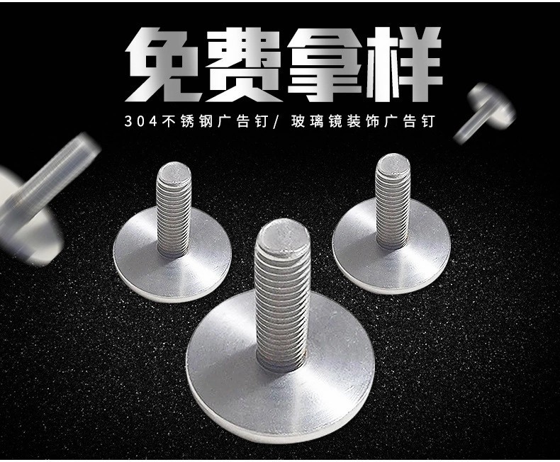 304不锈钢广告钉广泛应用于各种装修装饰之场所,起到固定装饰之作用,表面为不锈钢自然之本色,长久不生锈。