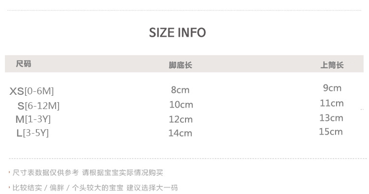 童袜尺码 XS码0-6个月,S码6-12个月,M码1-3岁,L码3-5岁
