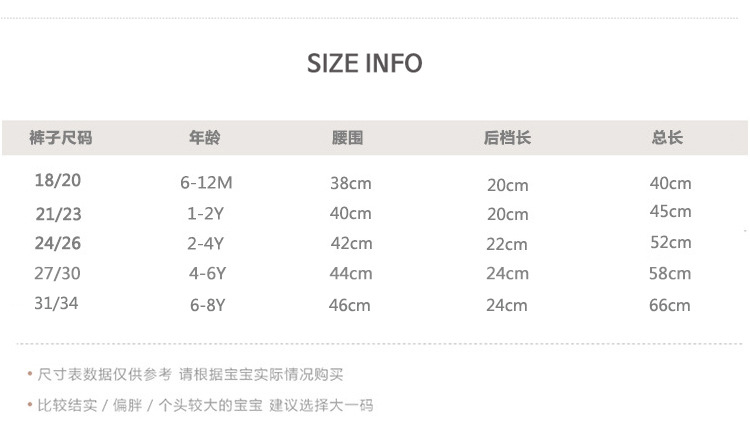童袜尺码 18/20码6-12个月,21/23码1-2岁,24/26码2-4岁,27/30码4-6岁,31/34码6-8岁