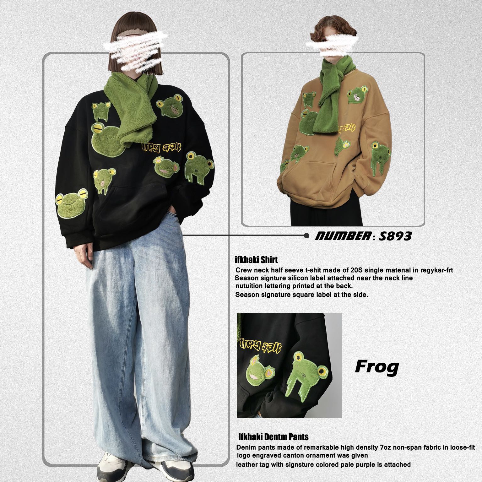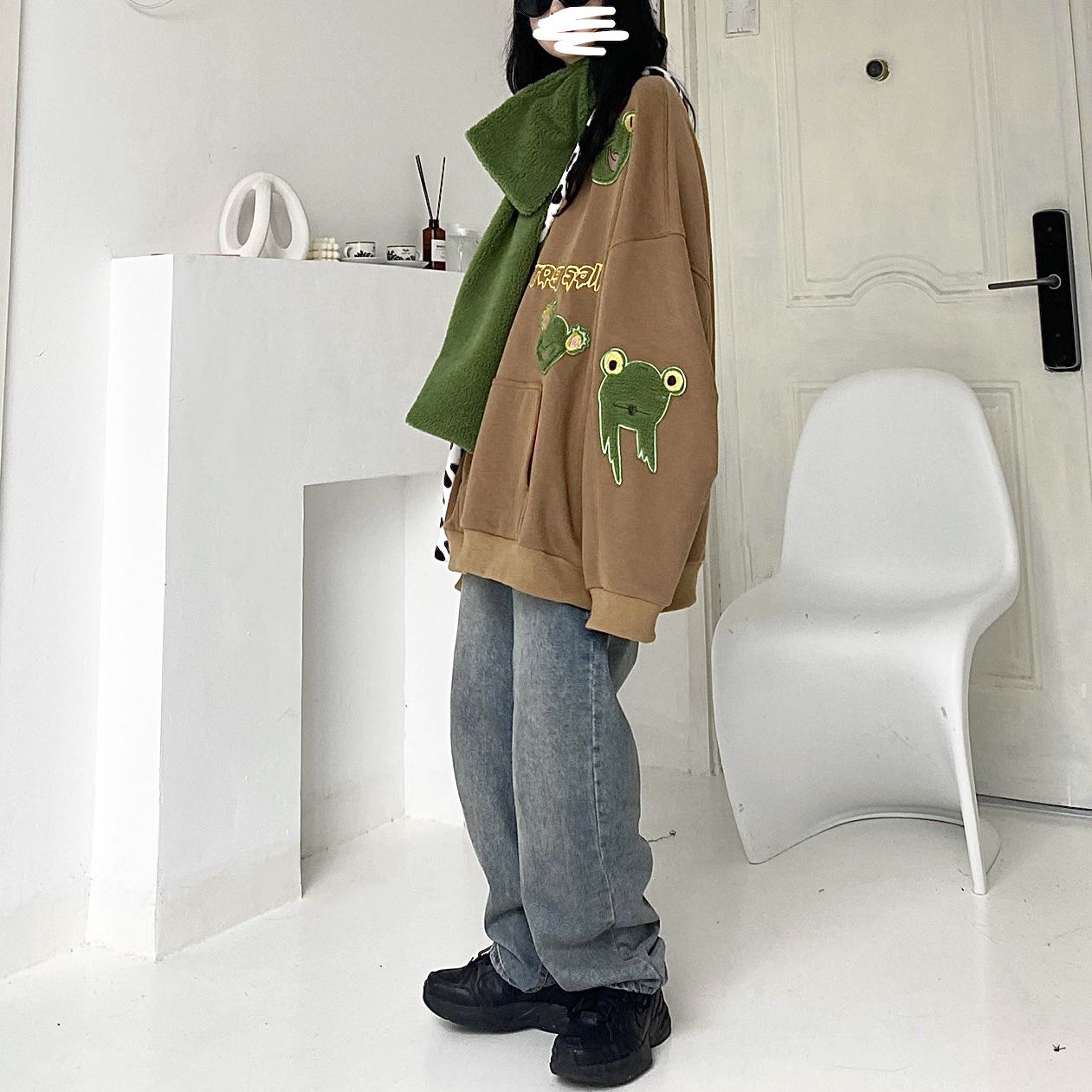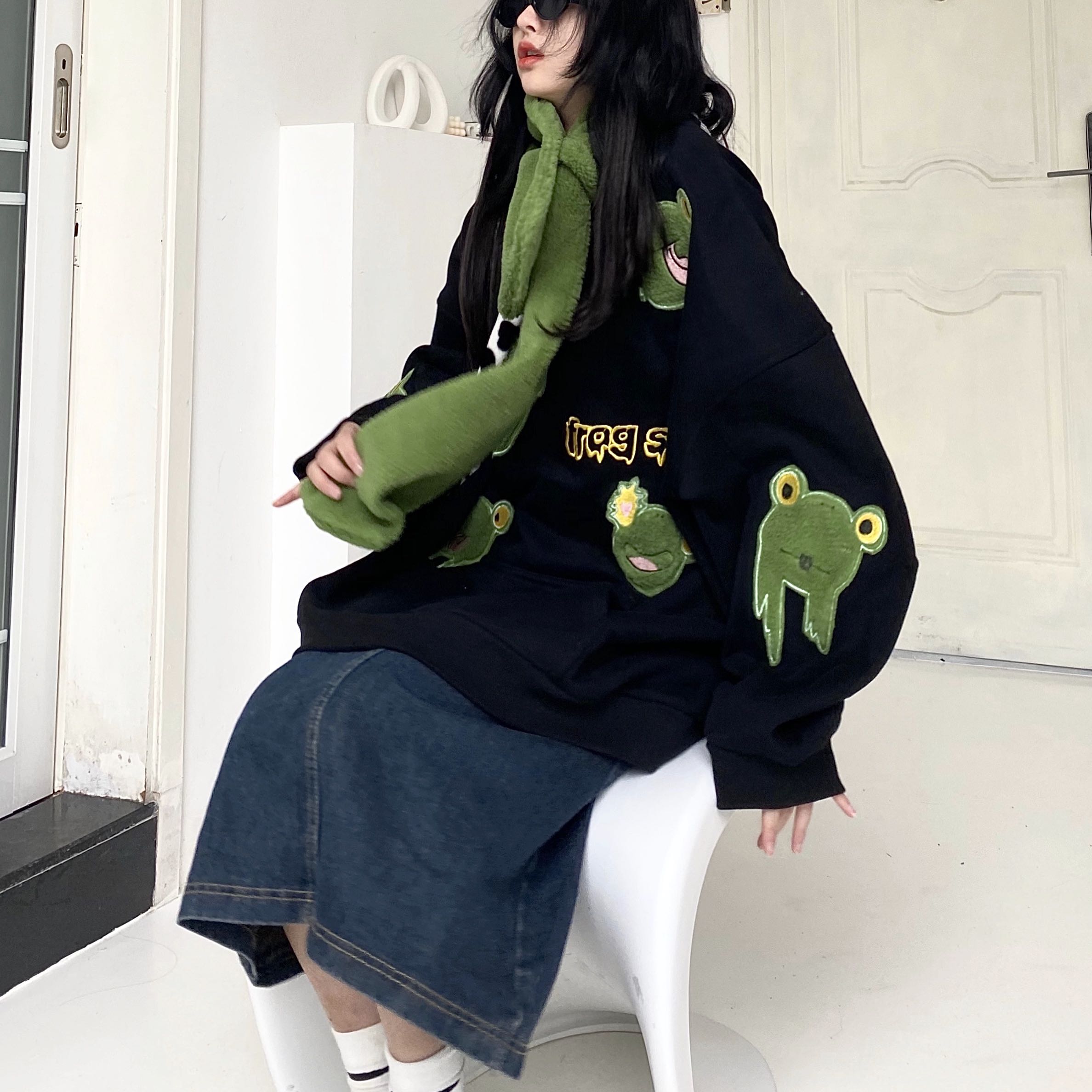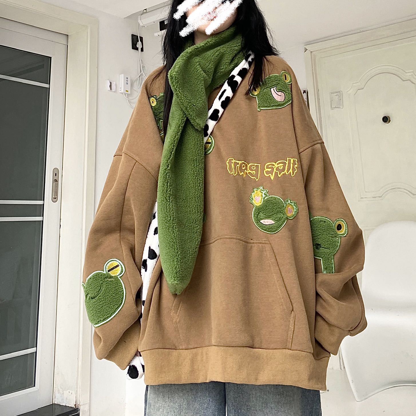 Takeoff咖哩人春秋青蛙衛衣加絨圓領帶圍巾寬鬆oversize復古潮bf