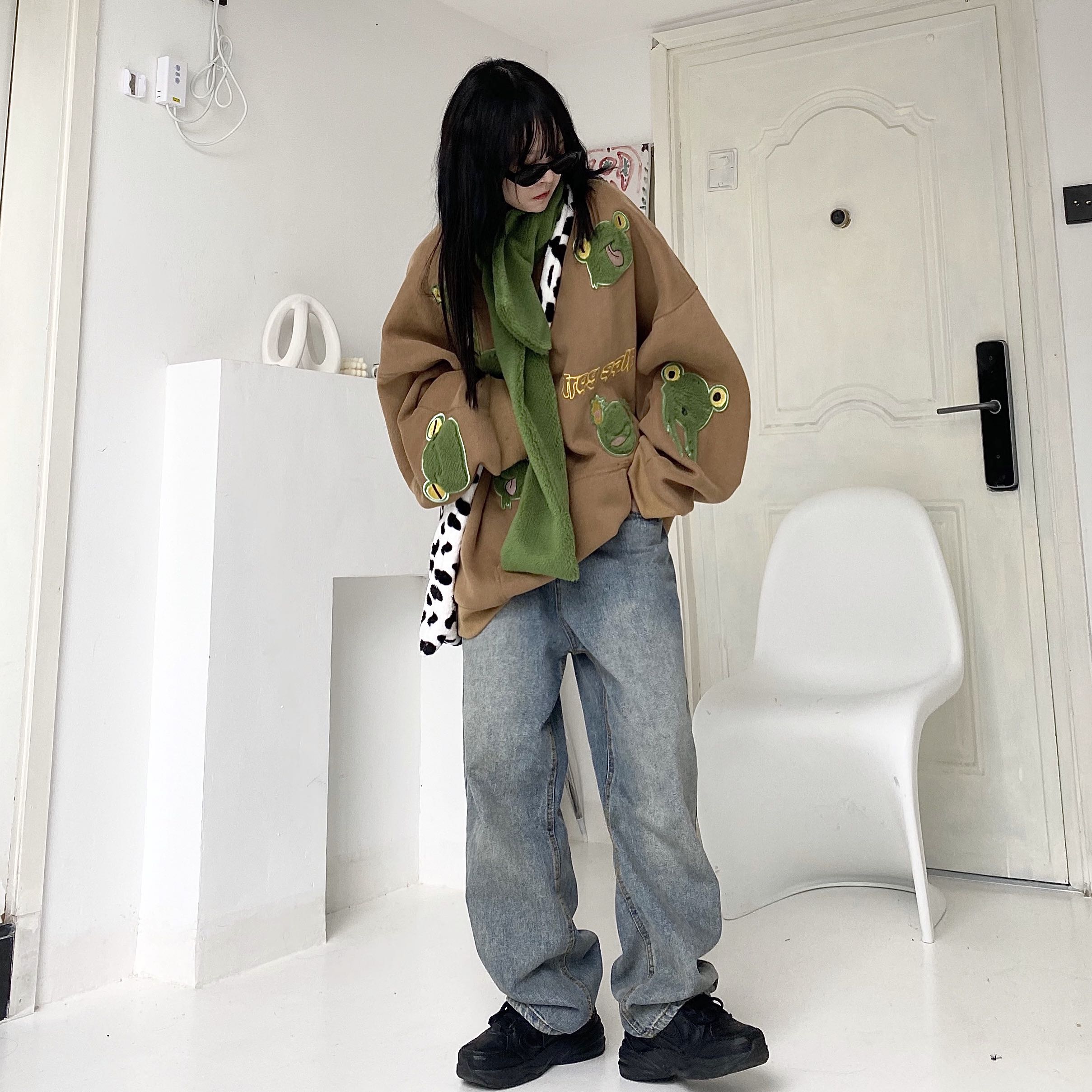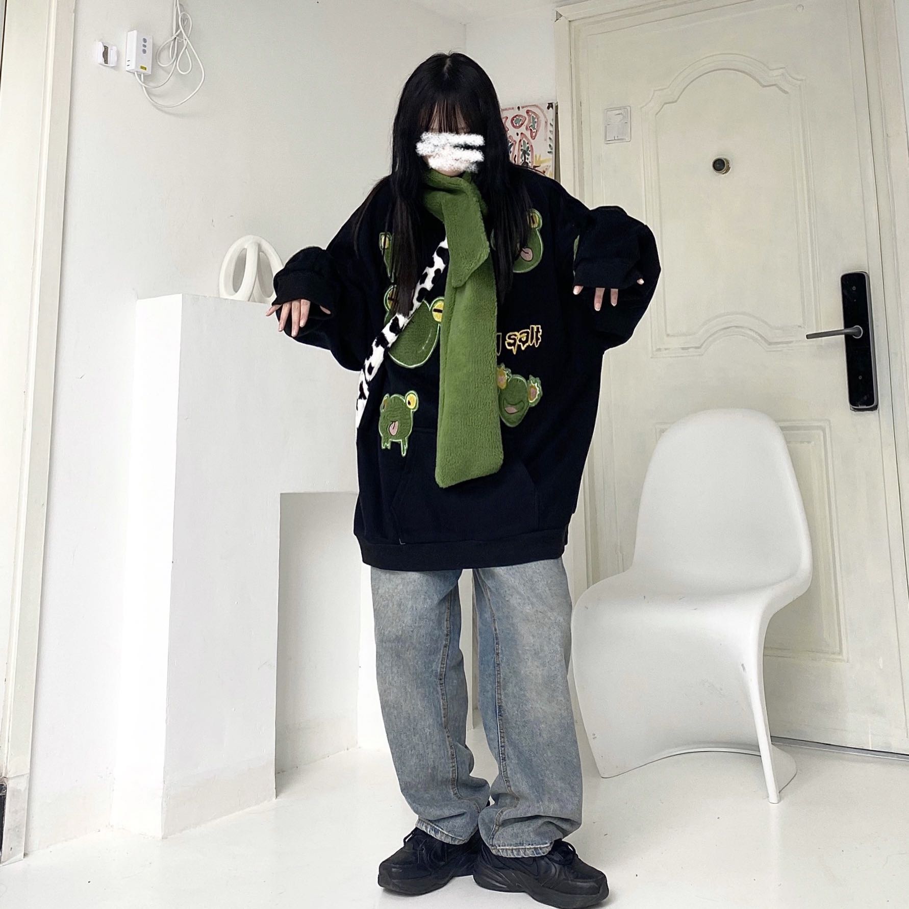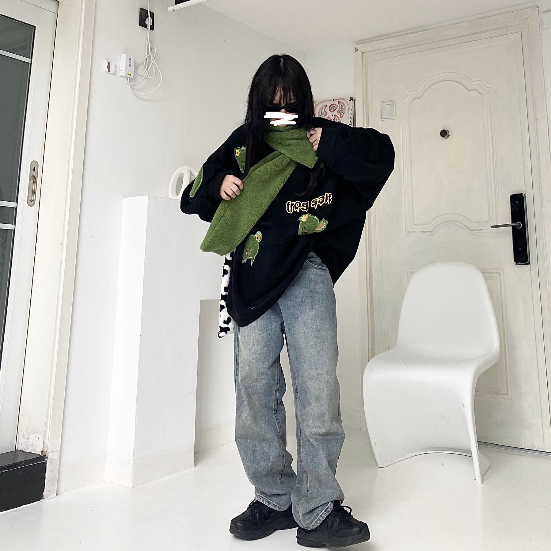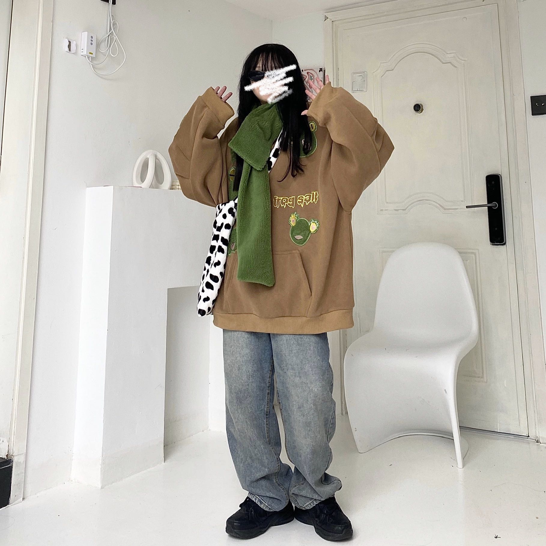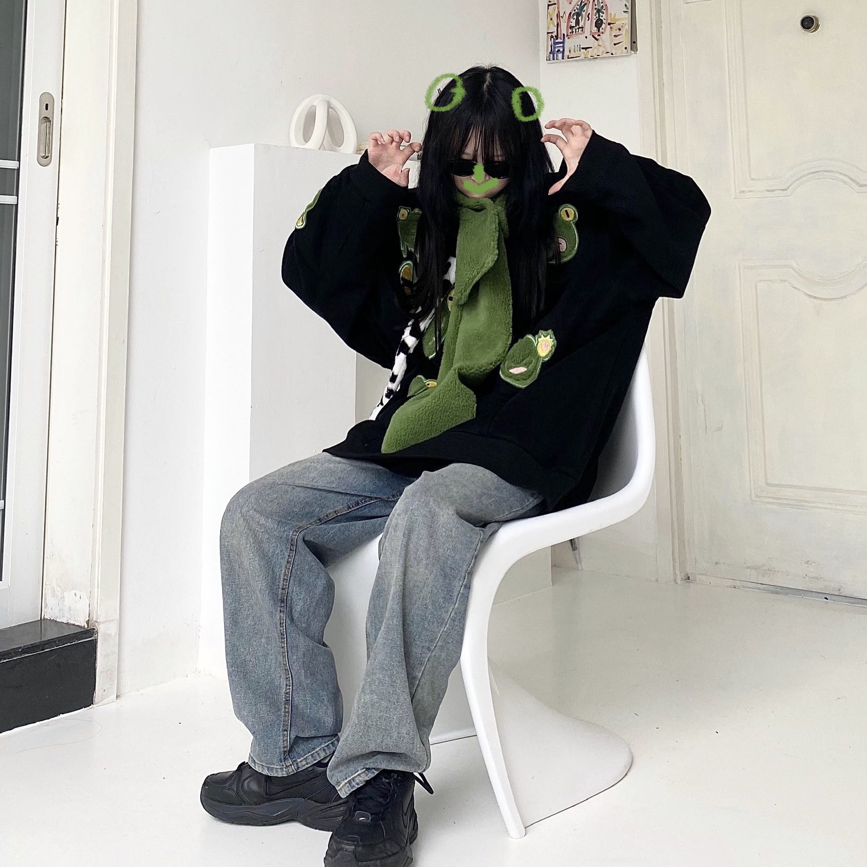Takeoff咖哩人春秋青蛙衛衣加絨圓領帶圍巾寬鬆oversize復古潮bf