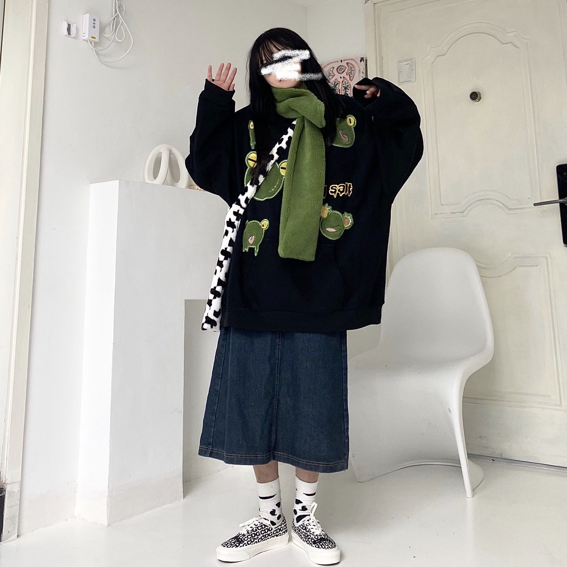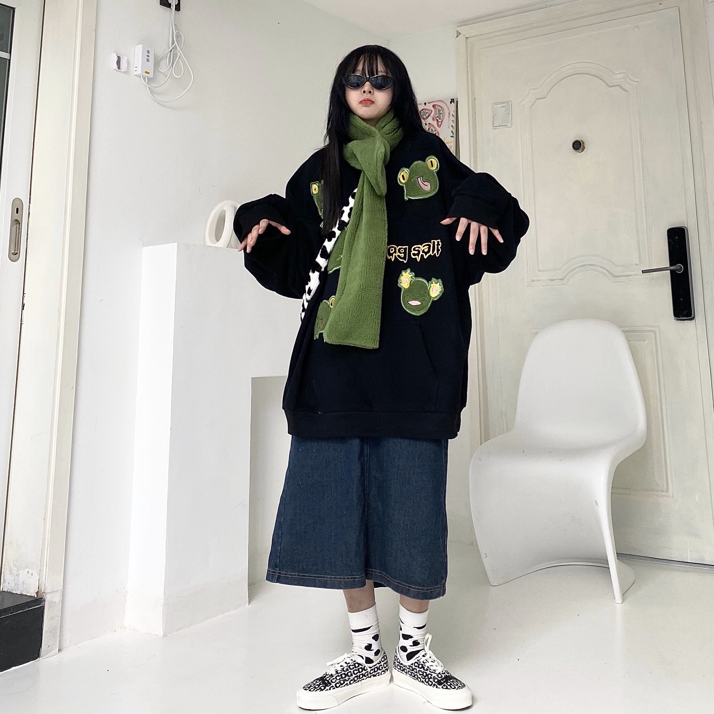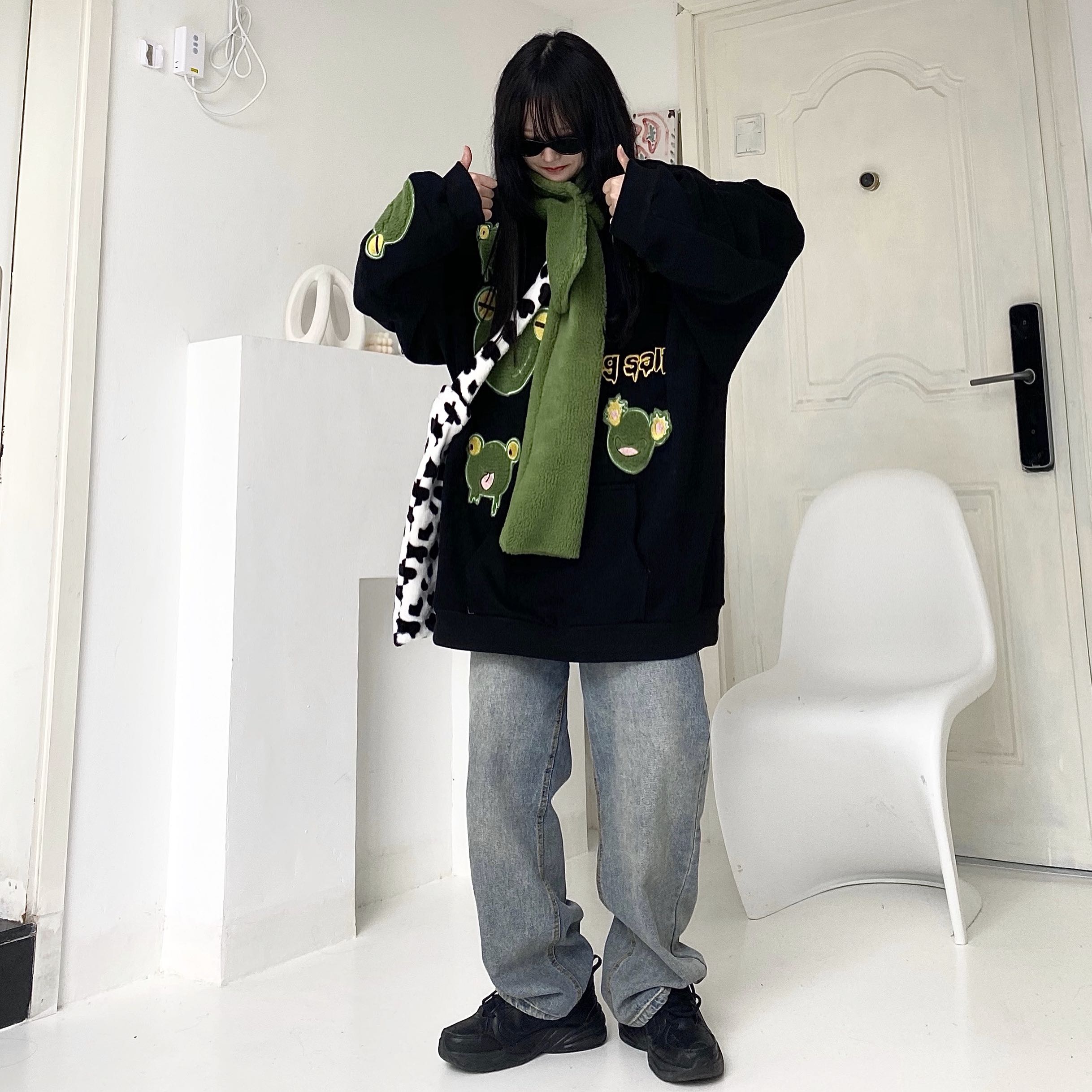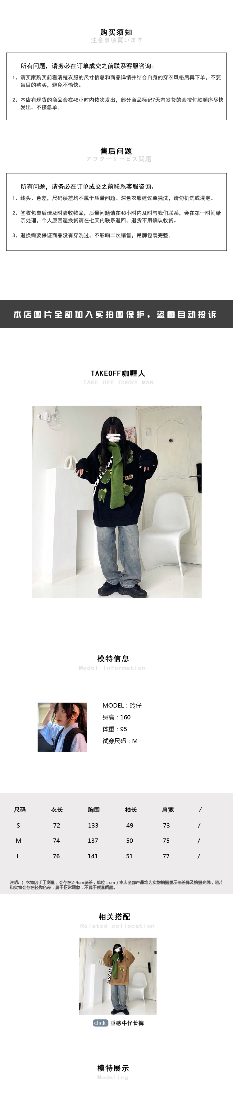 Takeoff咖哩人春秋青蛙衛衣加絨圓領帶圍巾寬鬆oversize復古潮bf