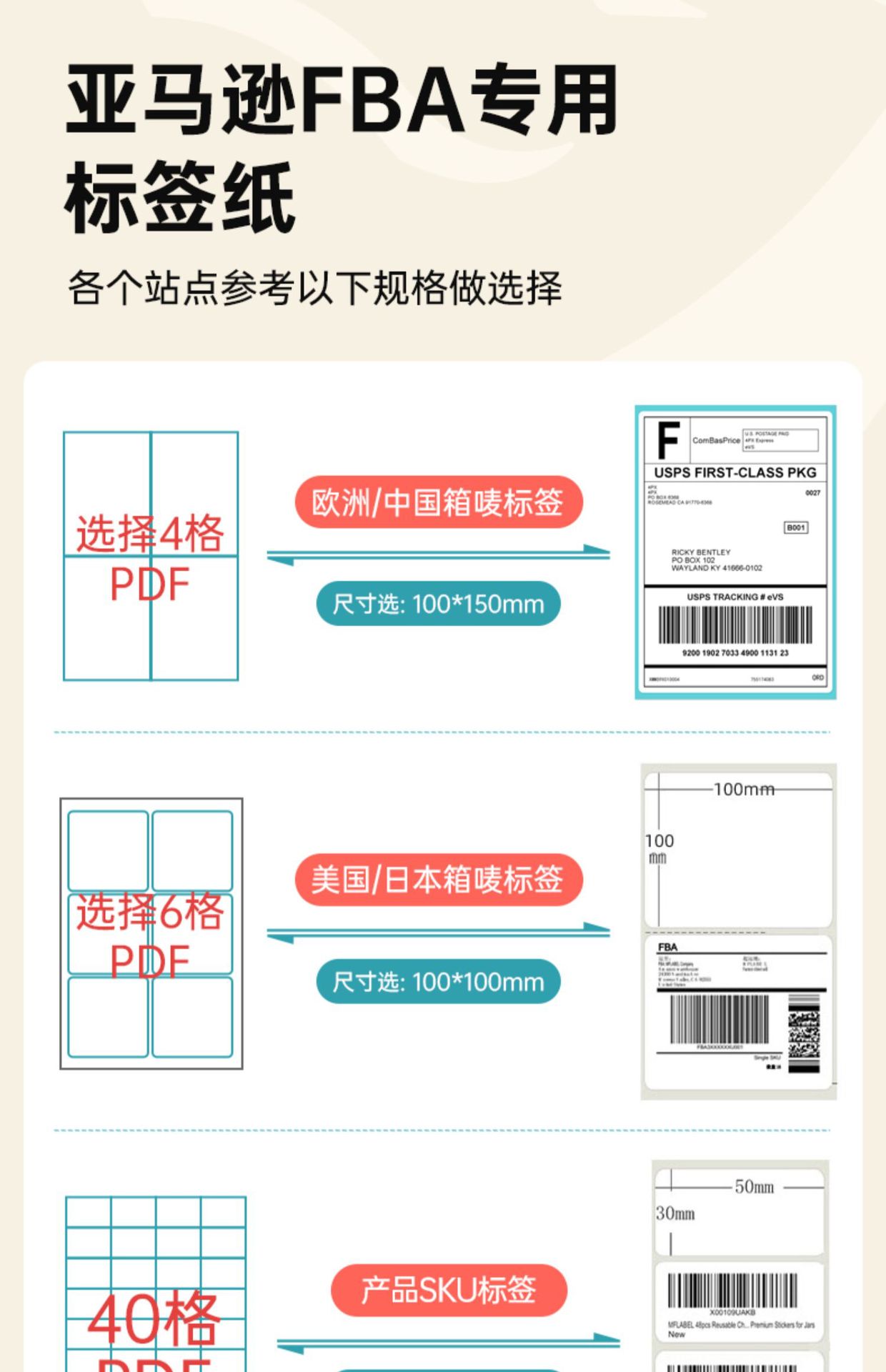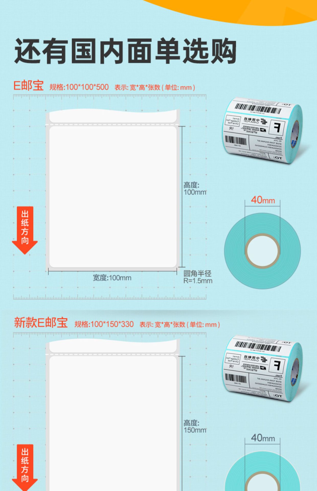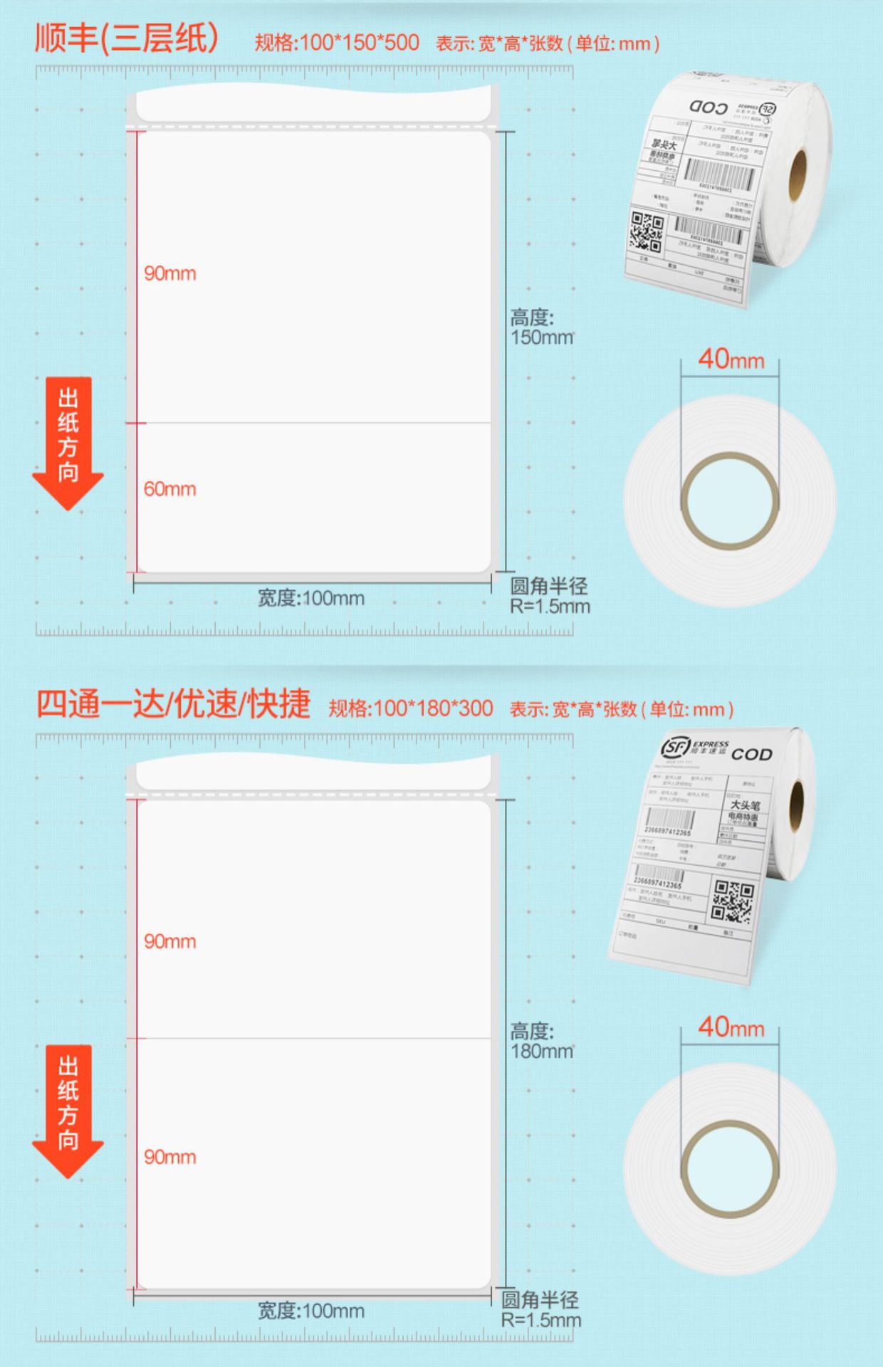 颜色 100*100*500 空白【E邮宝/亚马逊/FBA唛箱标签】,100*150*330 空白【速卖通/亚马逊/E邮宝】,100*180*300 空白【四通一达/优速/快捷/三层纸】,100*150*500空白【顺丰/三层纸】