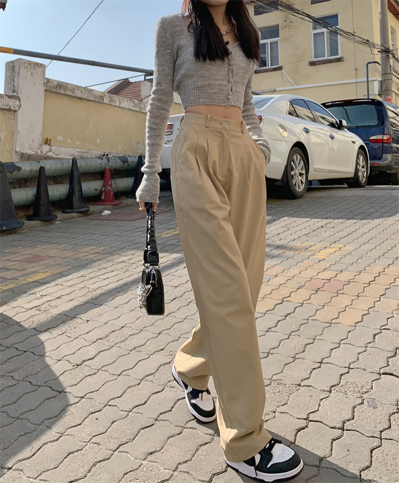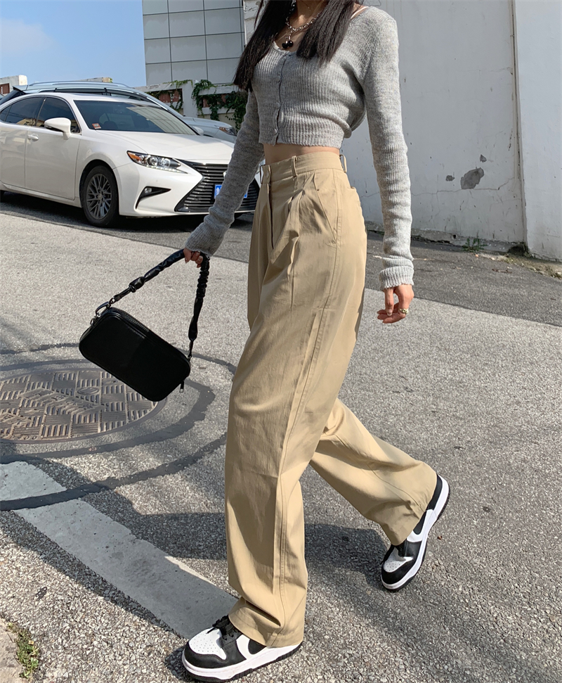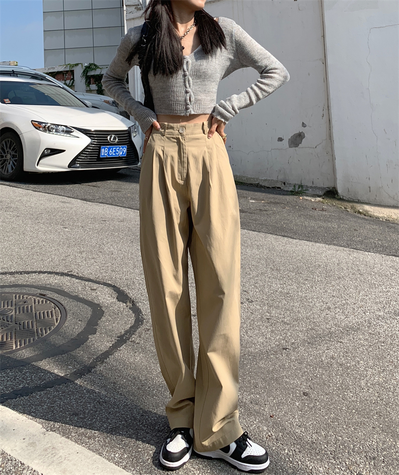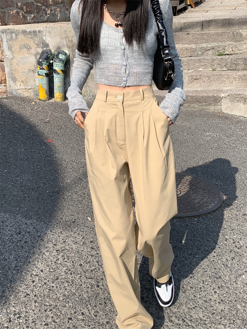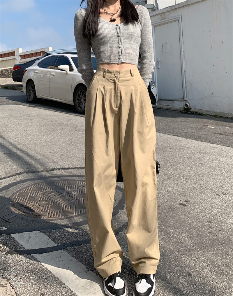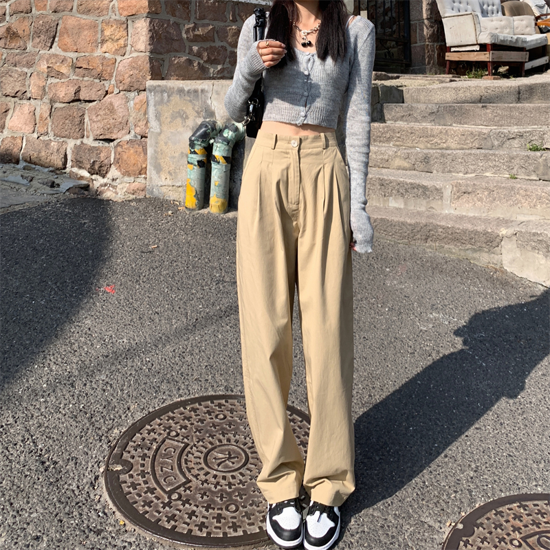夏季卡其色工裝高腰闊腿西裝褲女垂感顯瘦休閒直筒褲薄款寬鬆長褲