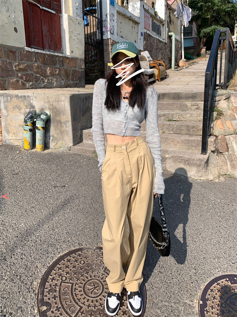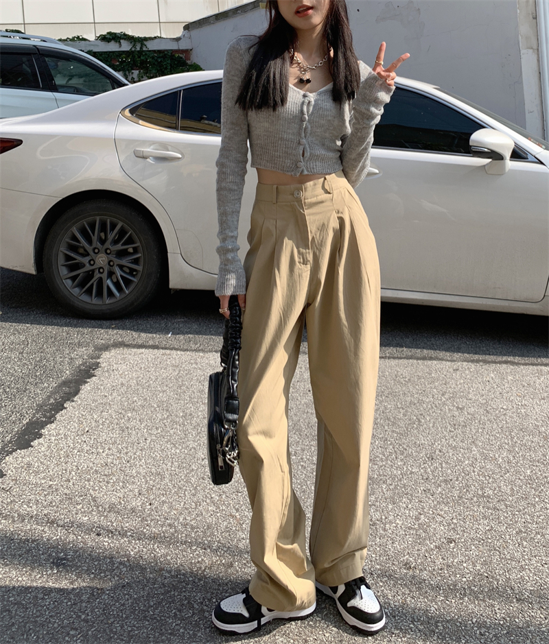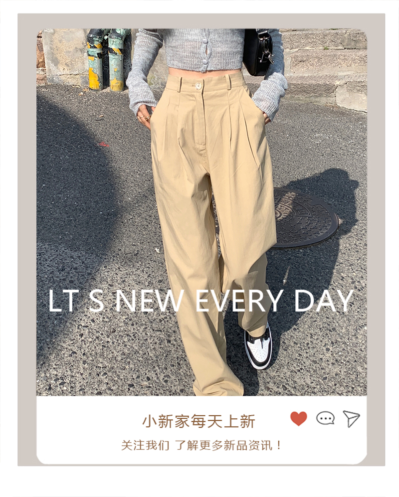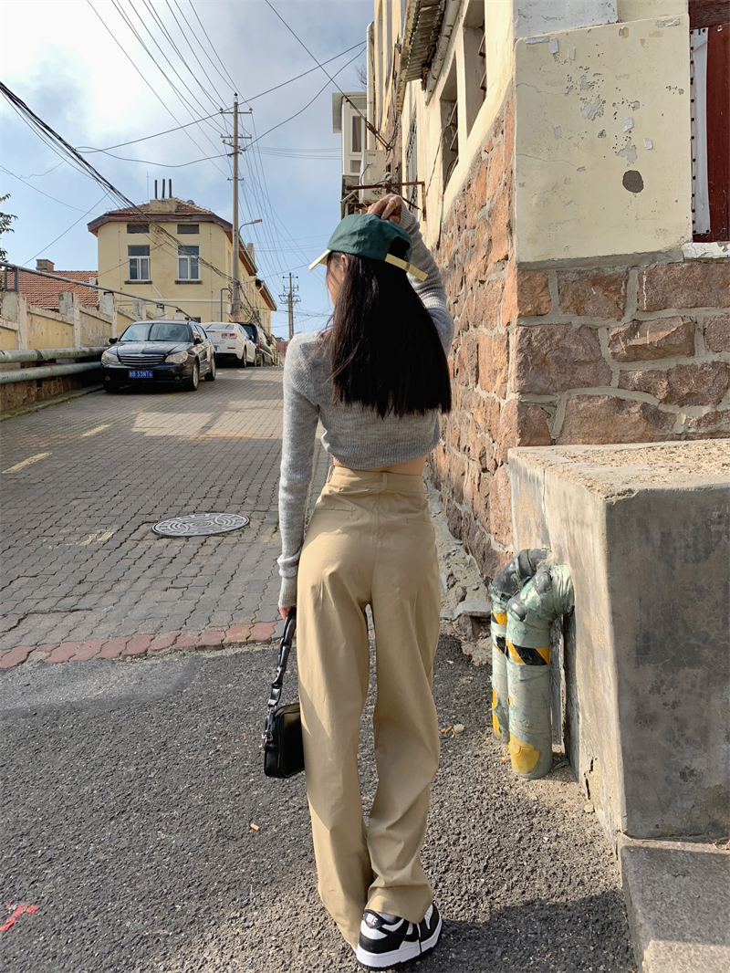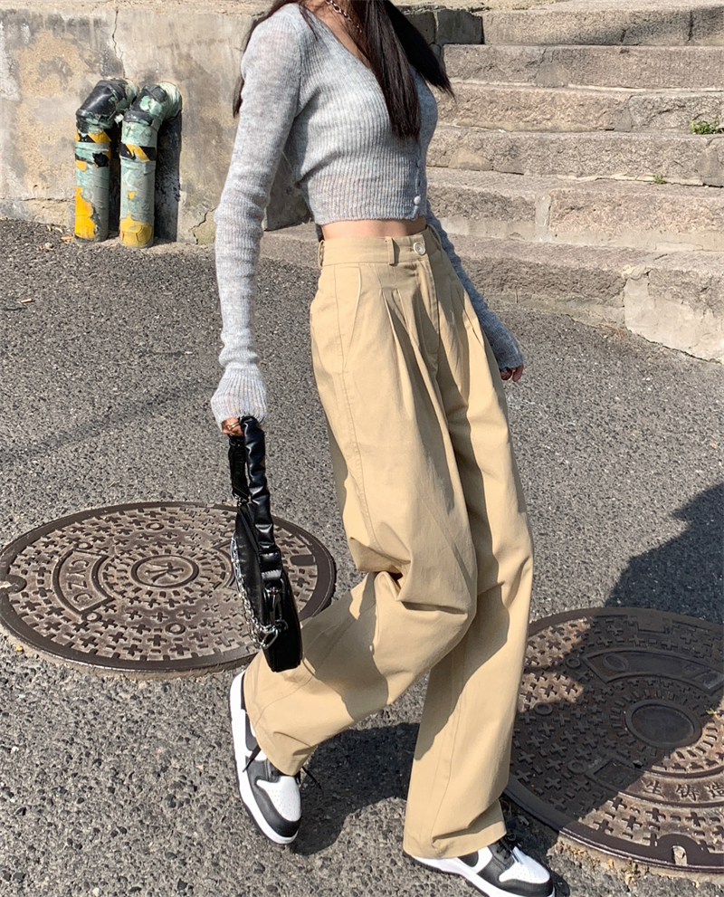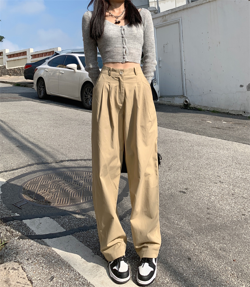 夏季卡其色工裝高腰闊腿西裝褲女垂感顯瘦休閒直筒褲薄款寬鬆長褲