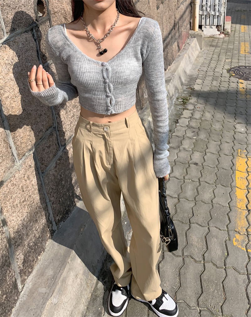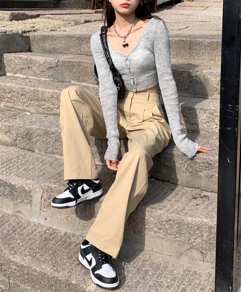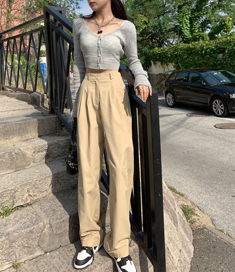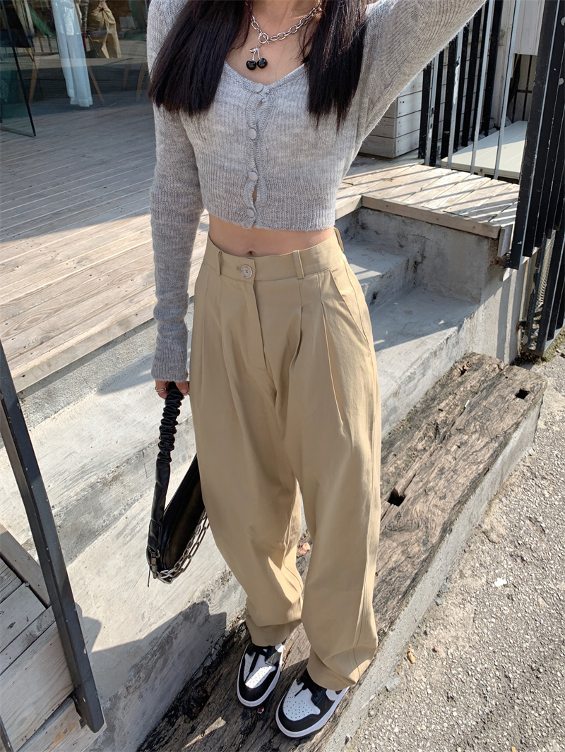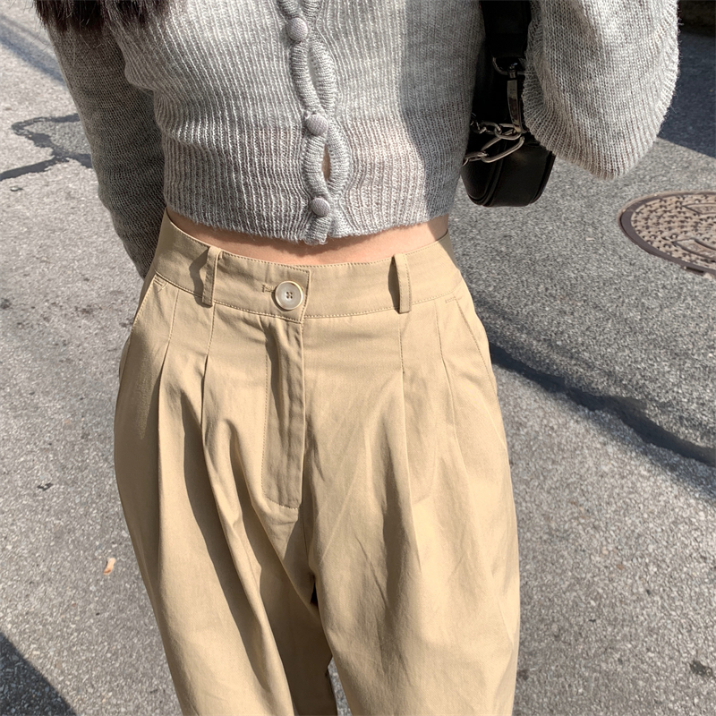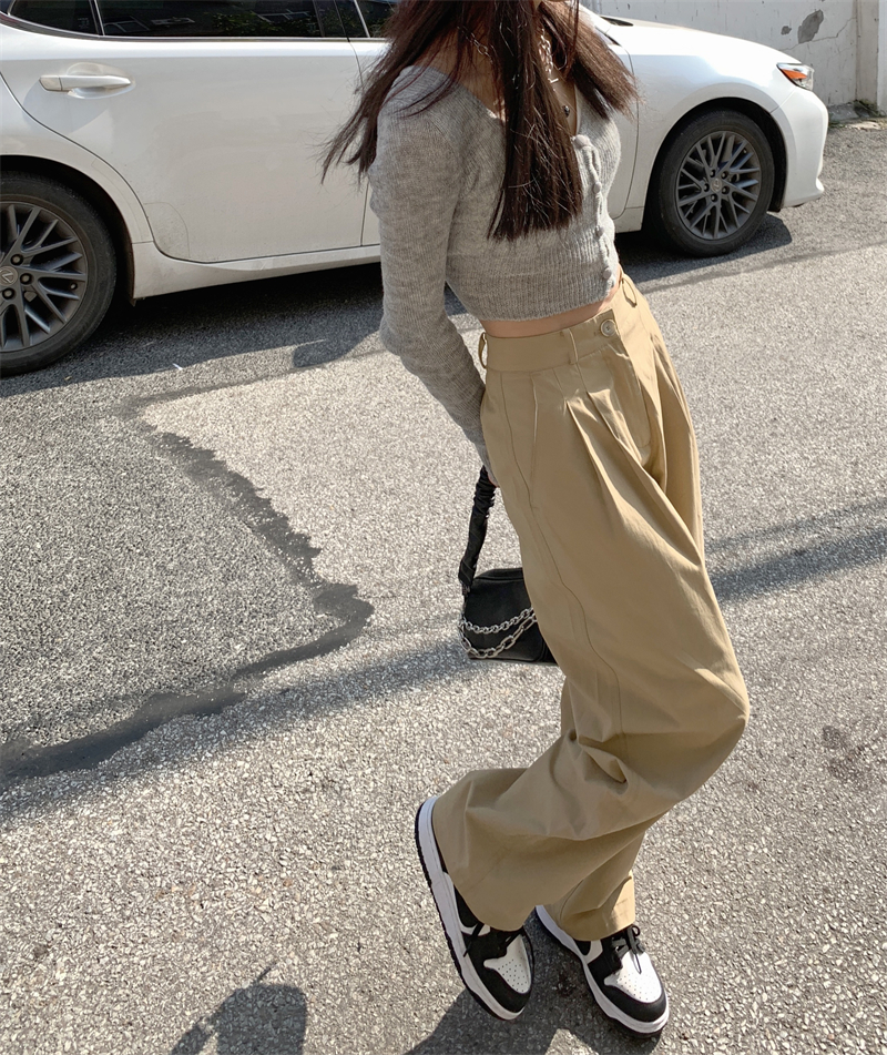 夏季卡其色工裝高腰闊腿西裝褲女垂感顯瘦休閒直筒褲薄款寬鬆長褲