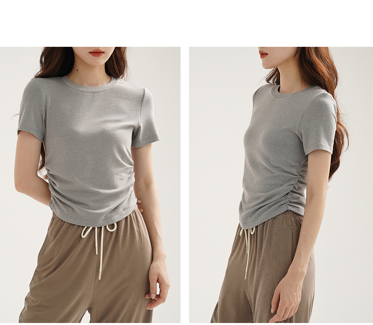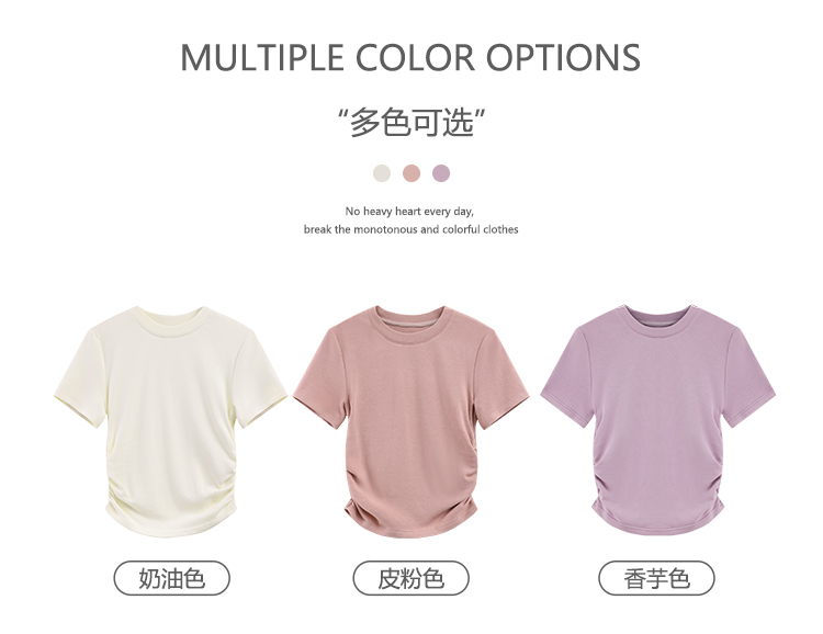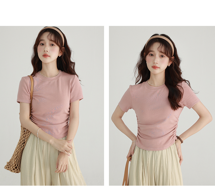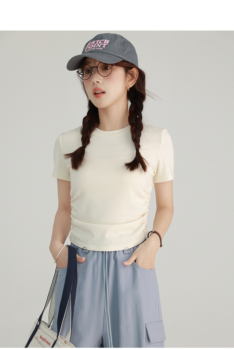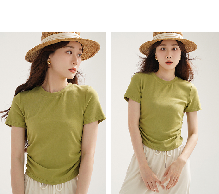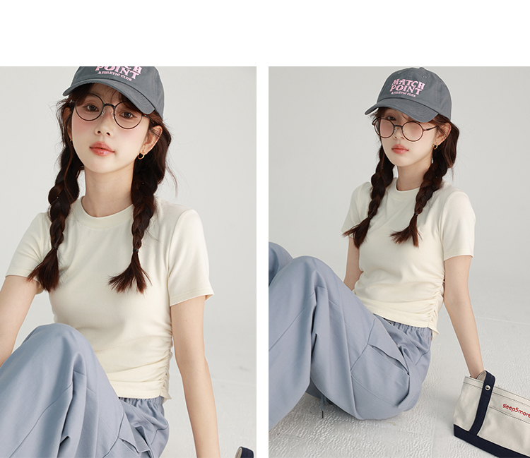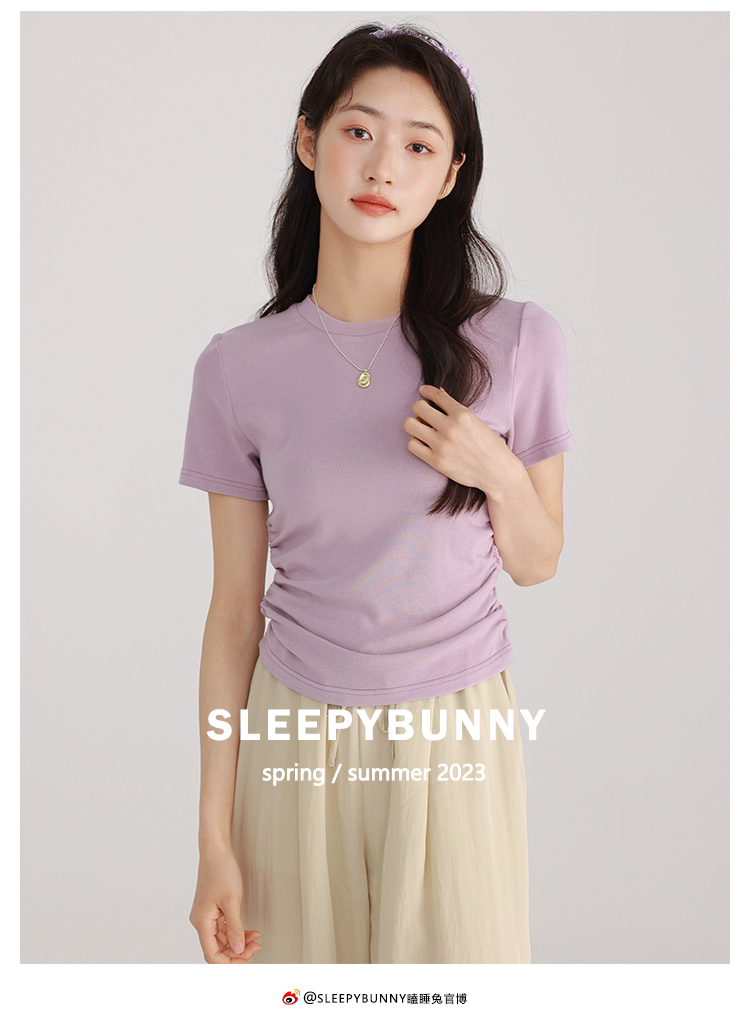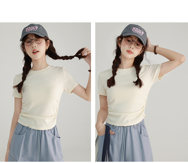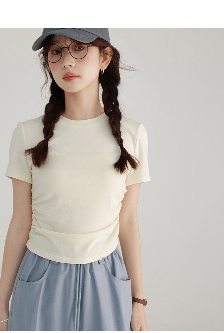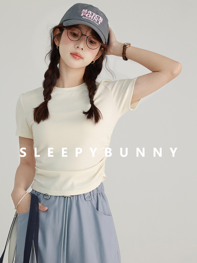 瞌睡兔 圓領正肩短袖T恤女小個子通勤風簡約收腰顯瘦修身短款上衣