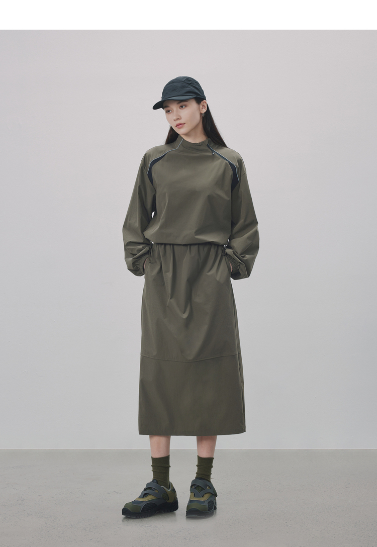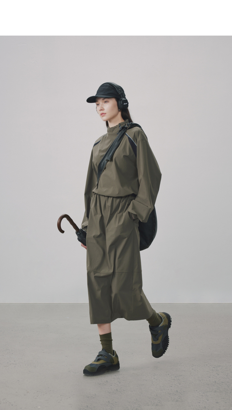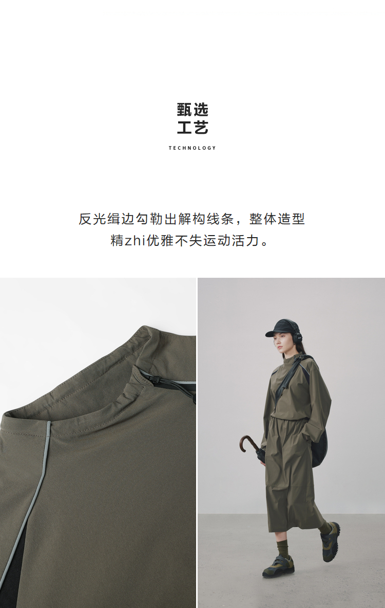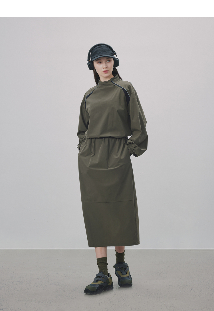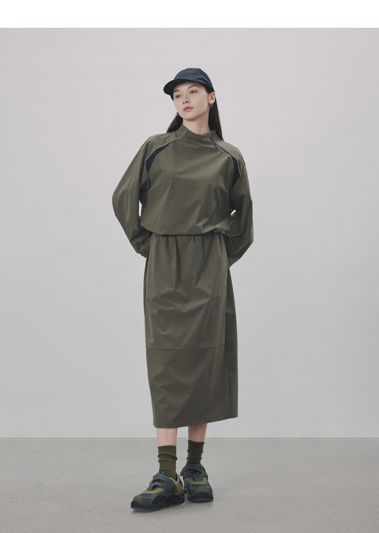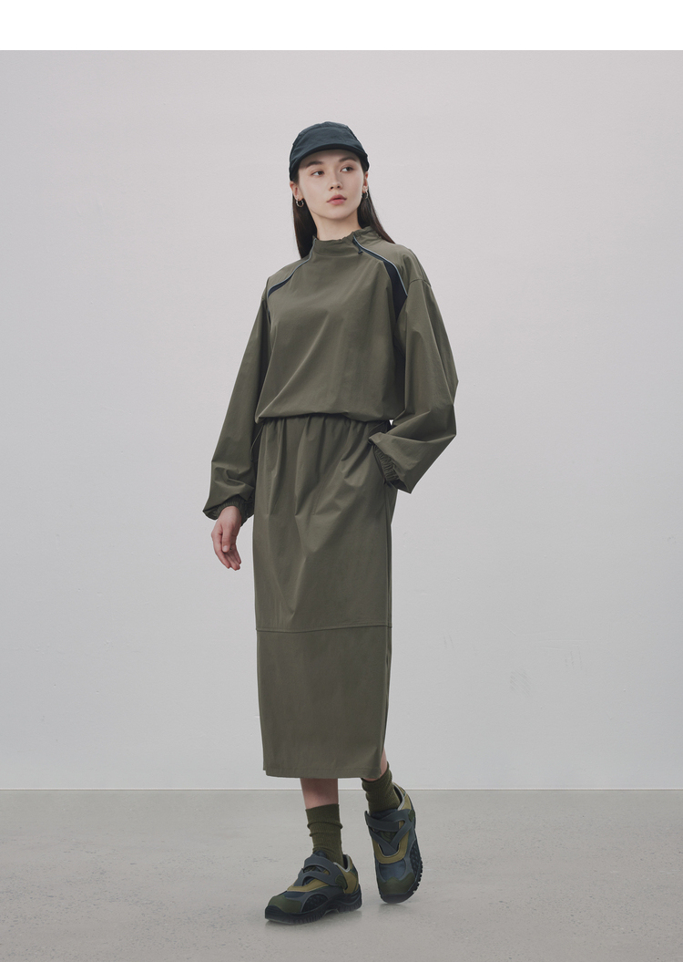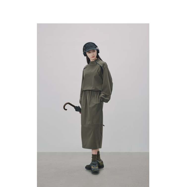 半圓原創設計女裝2023早秋季新拼接立領直筒小眾高級感衛衣洋裝