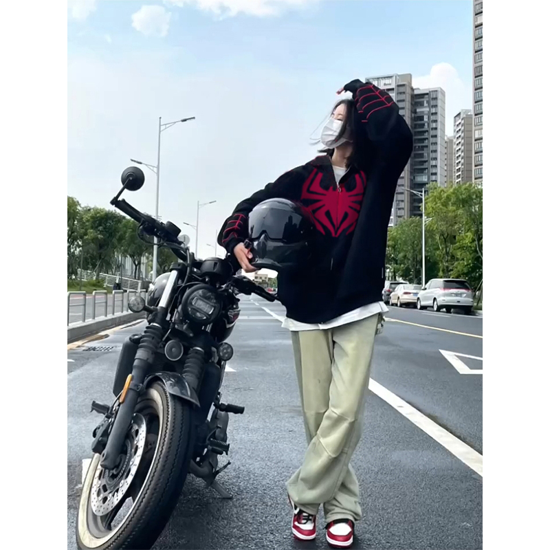 國潮高街美式蜘蛛人開衫連帽運動衫女春秋hiphop情侶小眾設計感外套