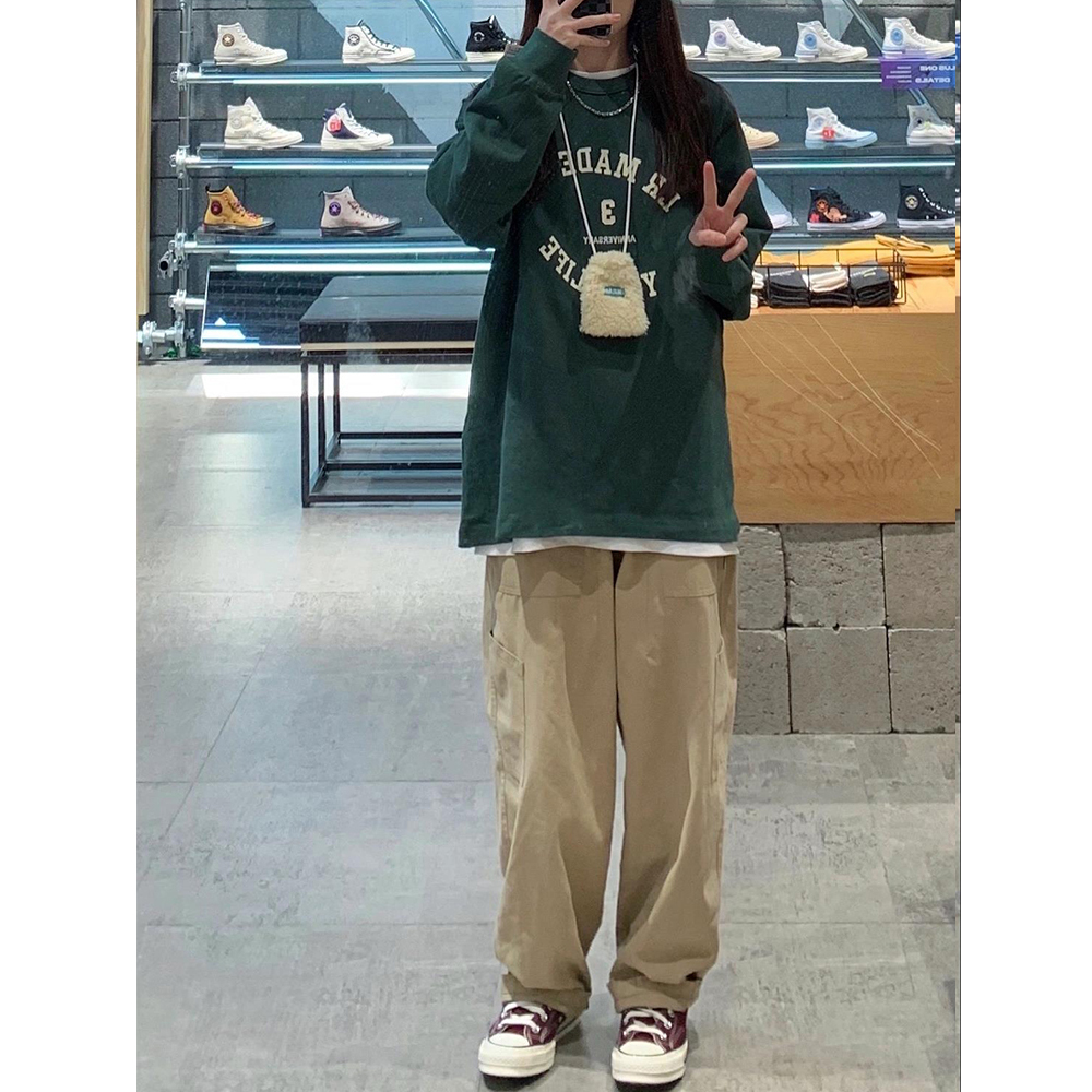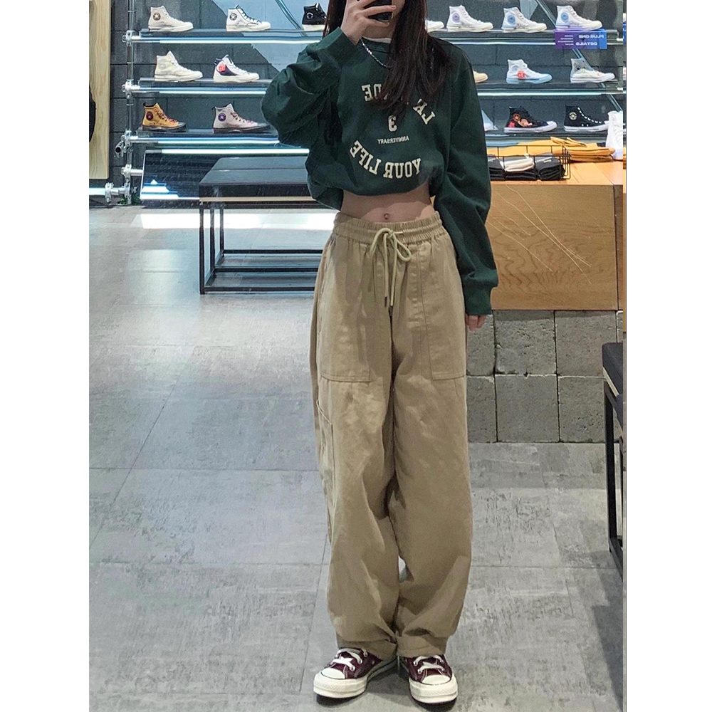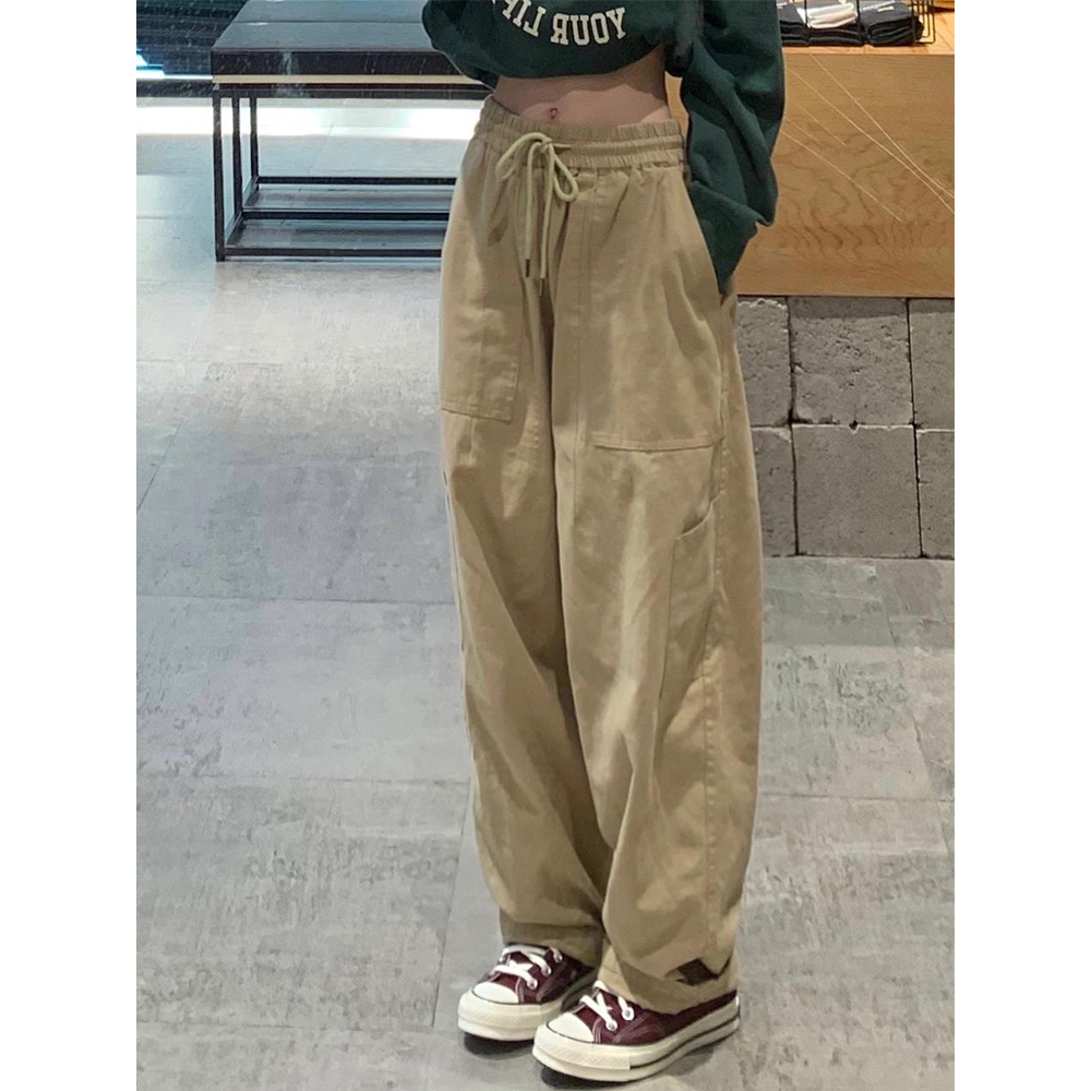 卡其工裝休閒褲女高腰直筒秋季新款大尺碼胖mm寬鬆闊腿梨形身材褲子
