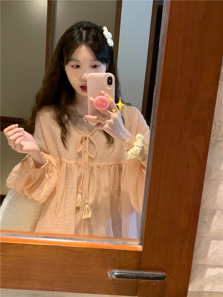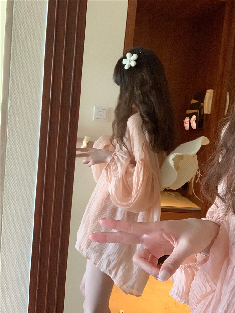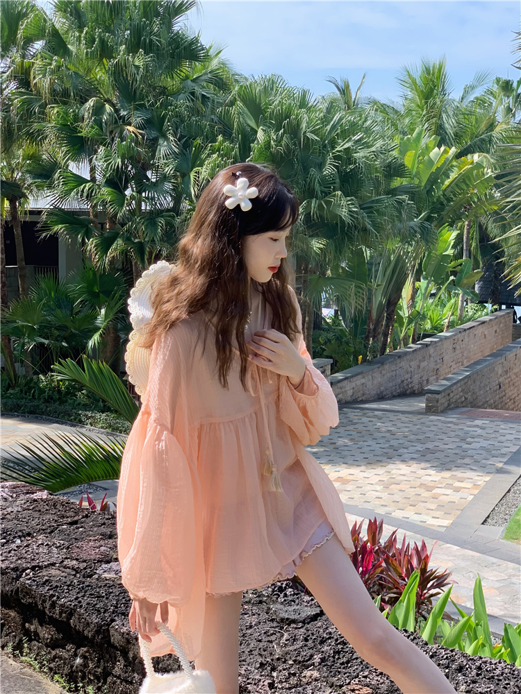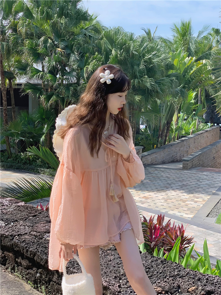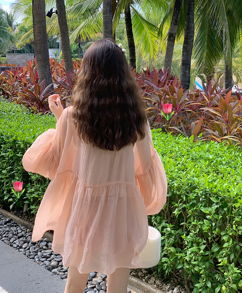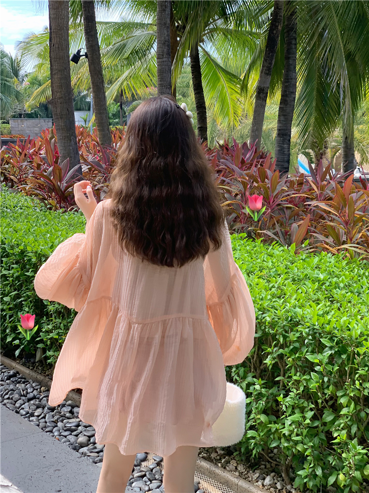 YUKI小樹家設計感泡泡袖薄款網紗防曬上衣夏季寬鬆V領溫柔襯衫式洋裝