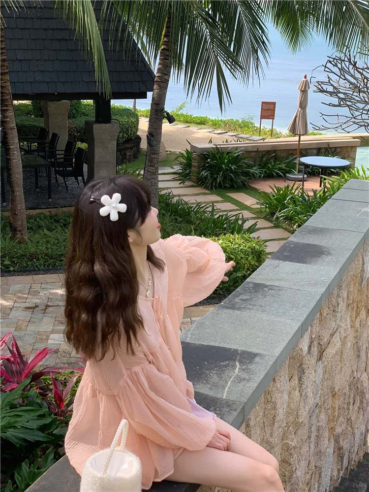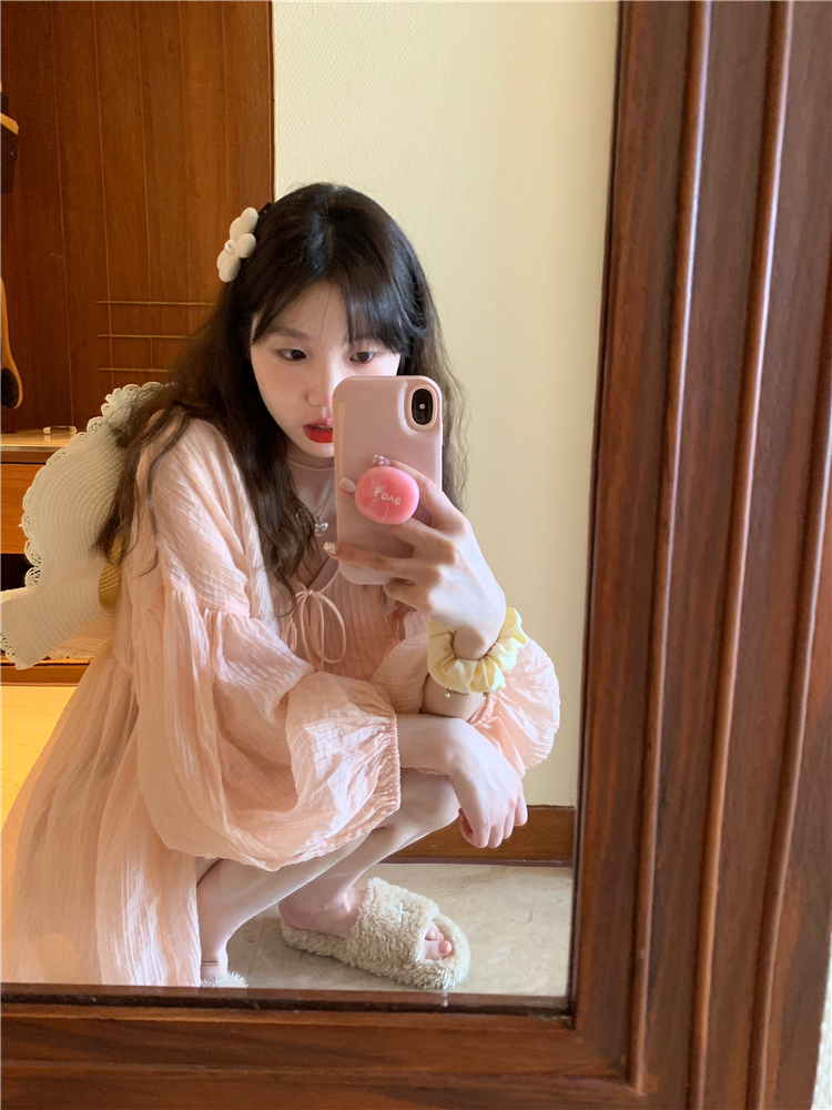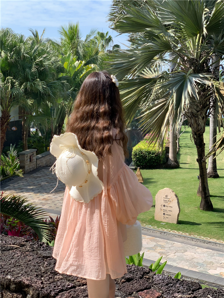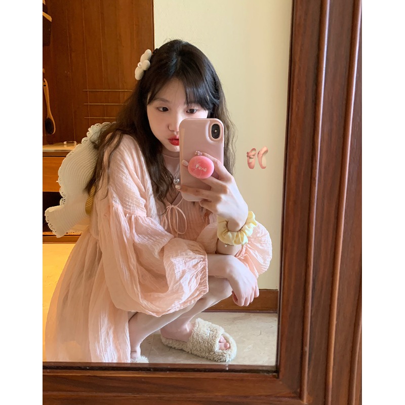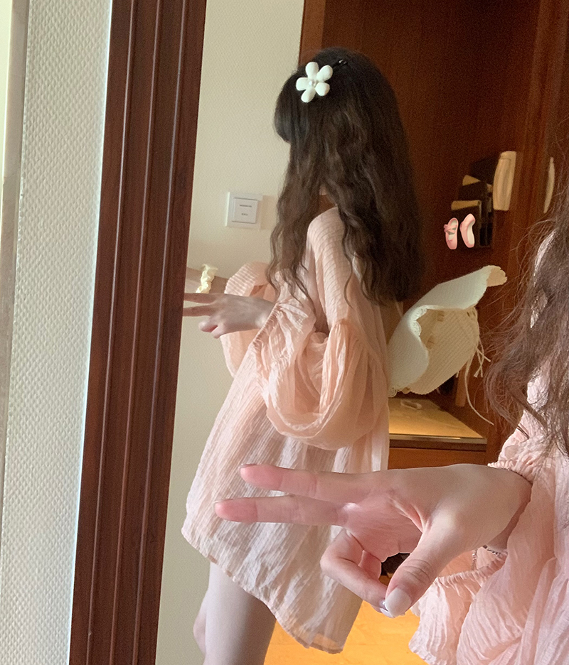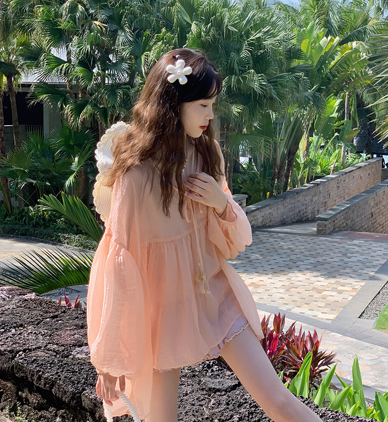 YUKI小樹家設計感泡泡袖薄款網紗防曬上衣夏季寬鬆V領溫柔襯衫式洋裝