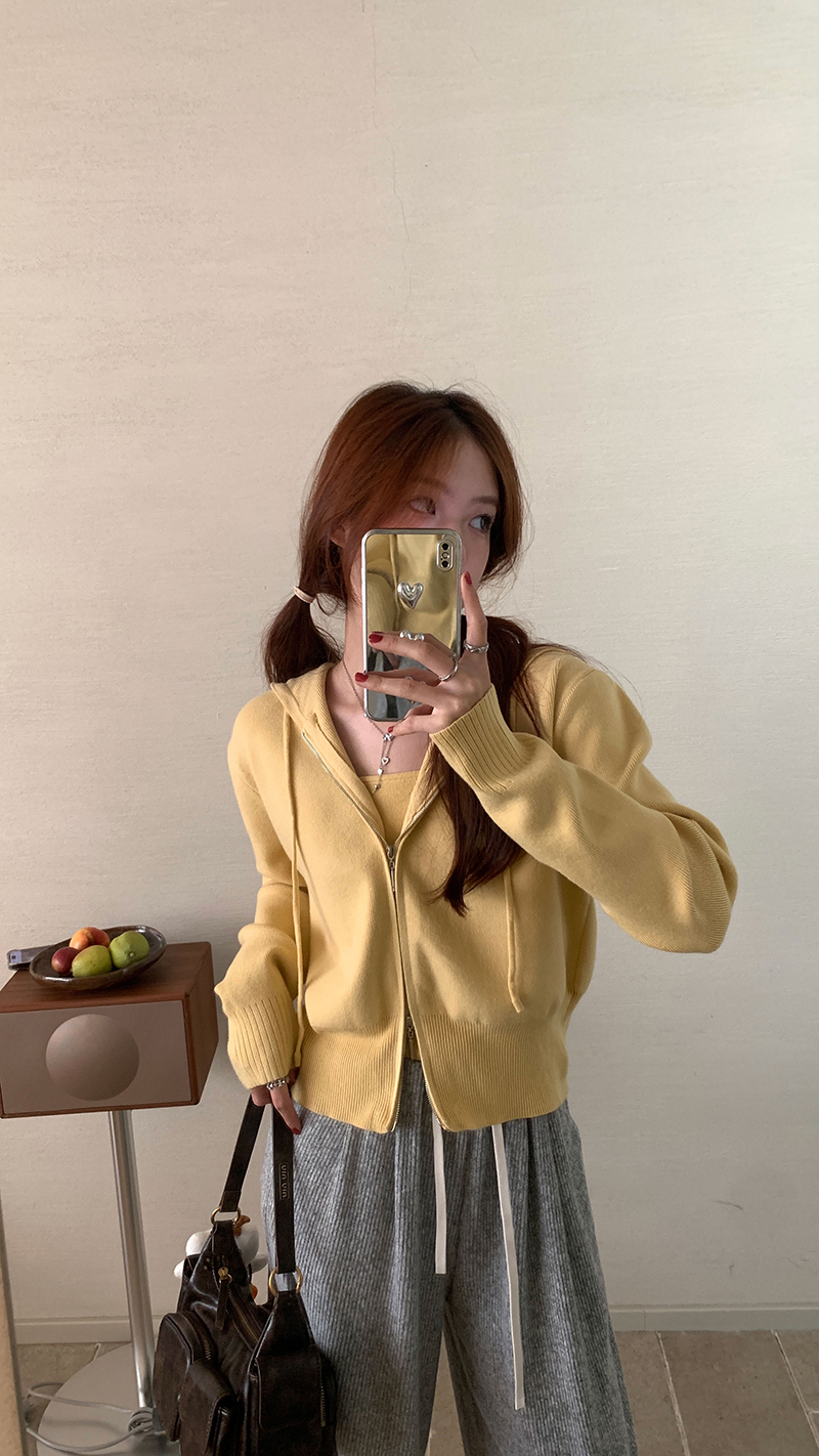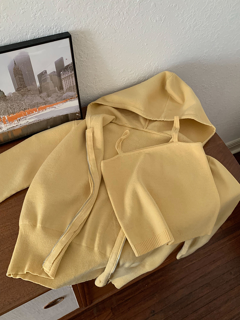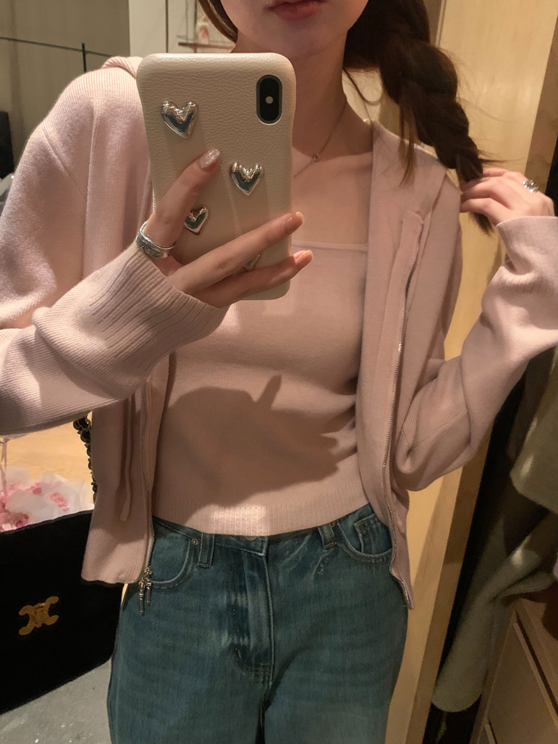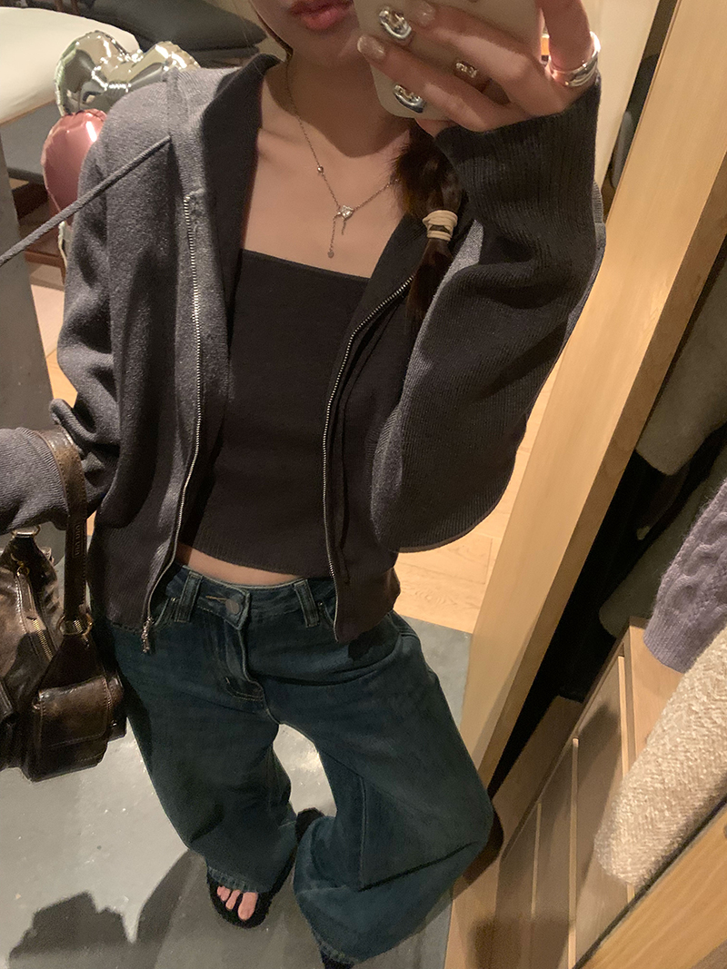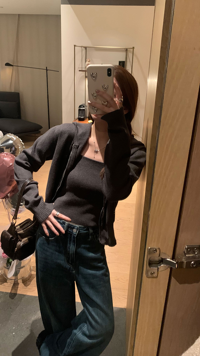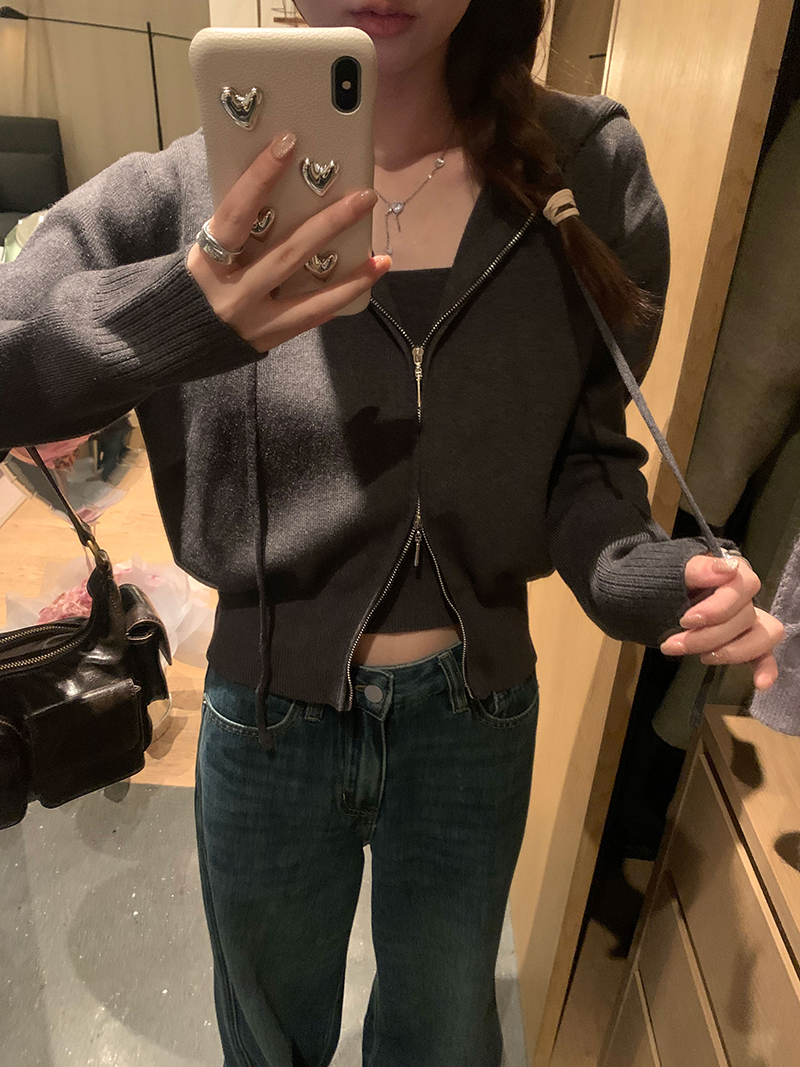 【現貨】im向miu系純帽拉鍊針織毛衣開衫+吊帶兩件套女短款外套