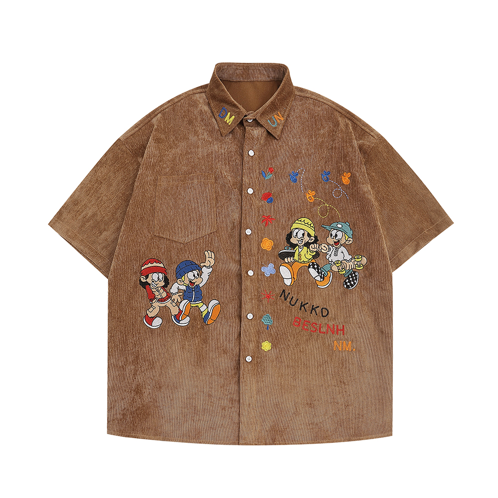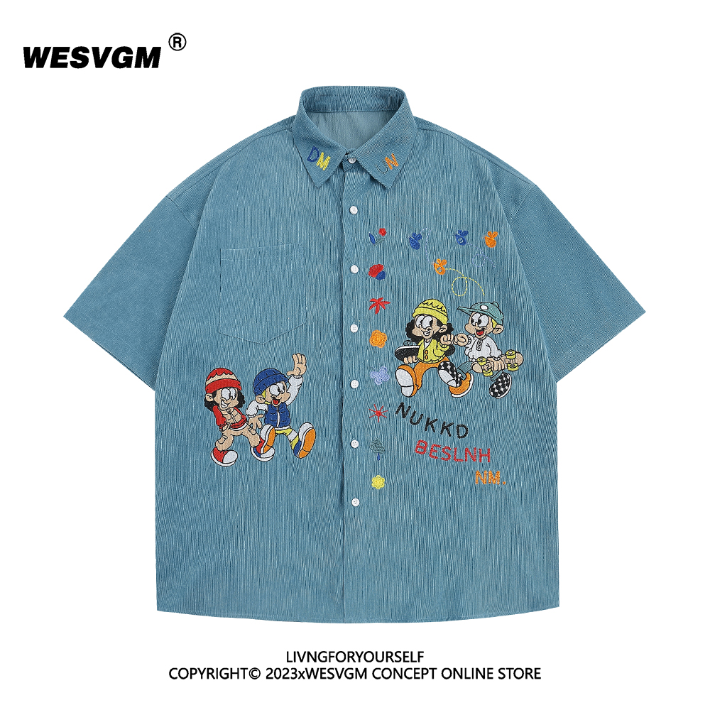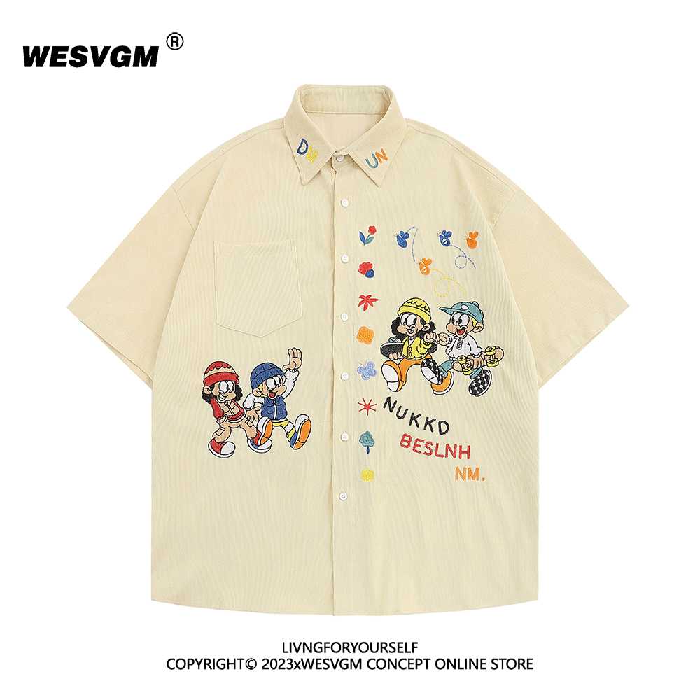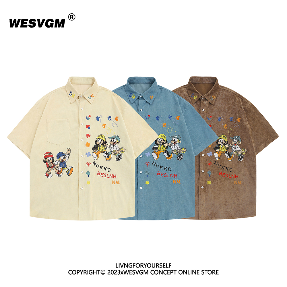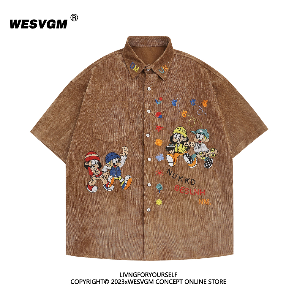 WESVGM夏季美式復古趣味卡通刺繡燈芯絨短袖襯衫男女寬鬆潮牌上衣